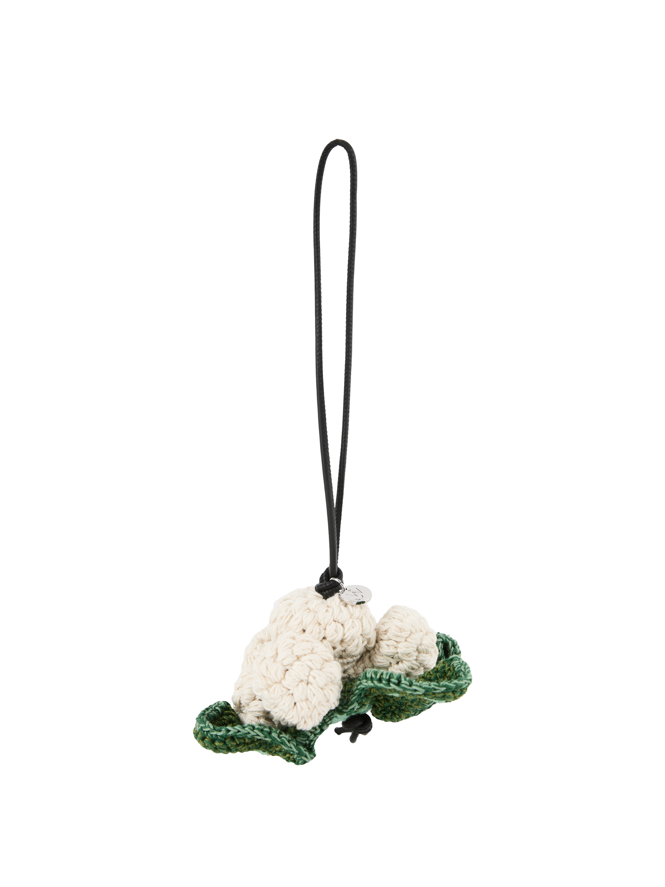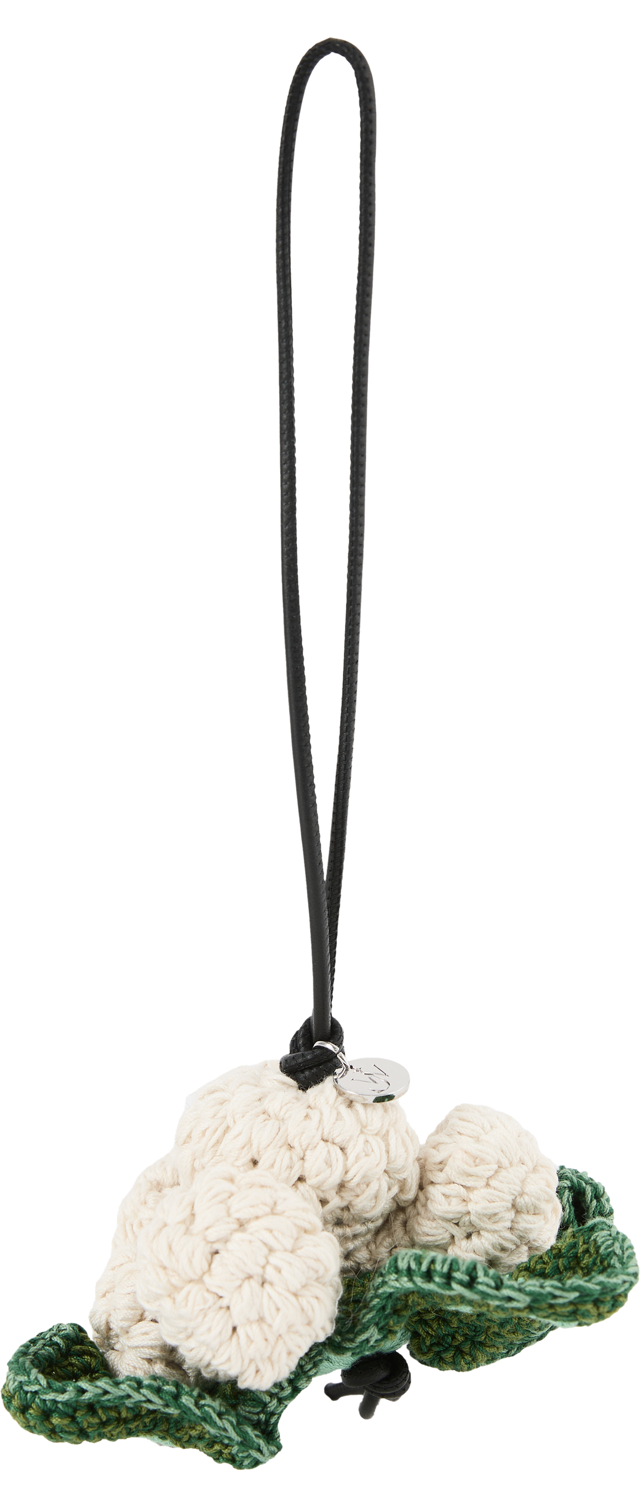 Der Anhänger 'Cauliflower' in Crème von JW Anderson wurde aus hochwertigen Materialien gefertigt und besticht durch das handgehäkelte Blumenkohl-Motiv. Das silbergravierte Logo-Medaillon und die Lederkordel runden das Modell stilvoll ab.