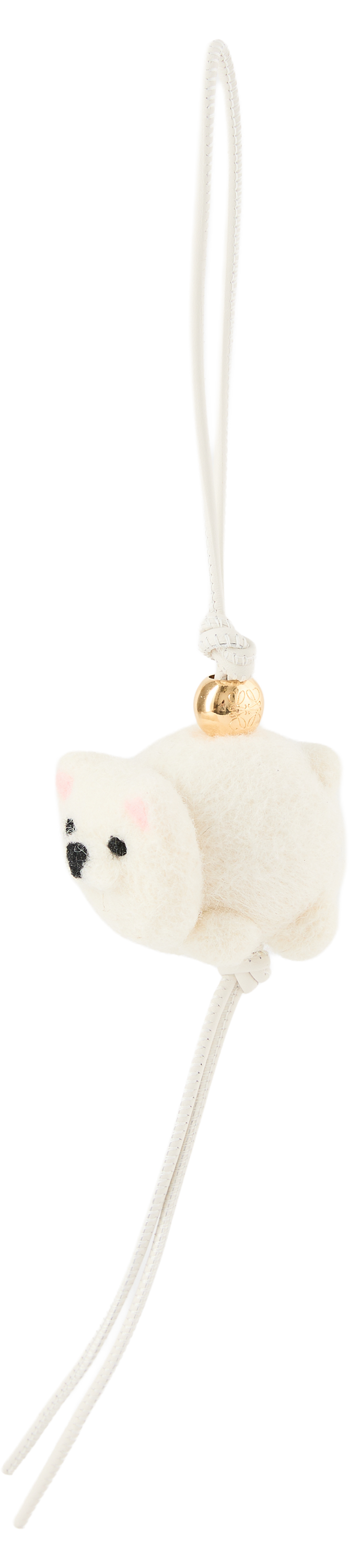 Der Anhänger 'Chow-Chow' in Crème von LOEWE wurde aus Filz gefertigt und besticht durch den verspielten Chow-Chow-Anhänger. Der Schlaufenriemen aus Kalbsleder sowie der Würfel mit dem LOEWE-Anagramm runden das Modell stilvoll ab.
