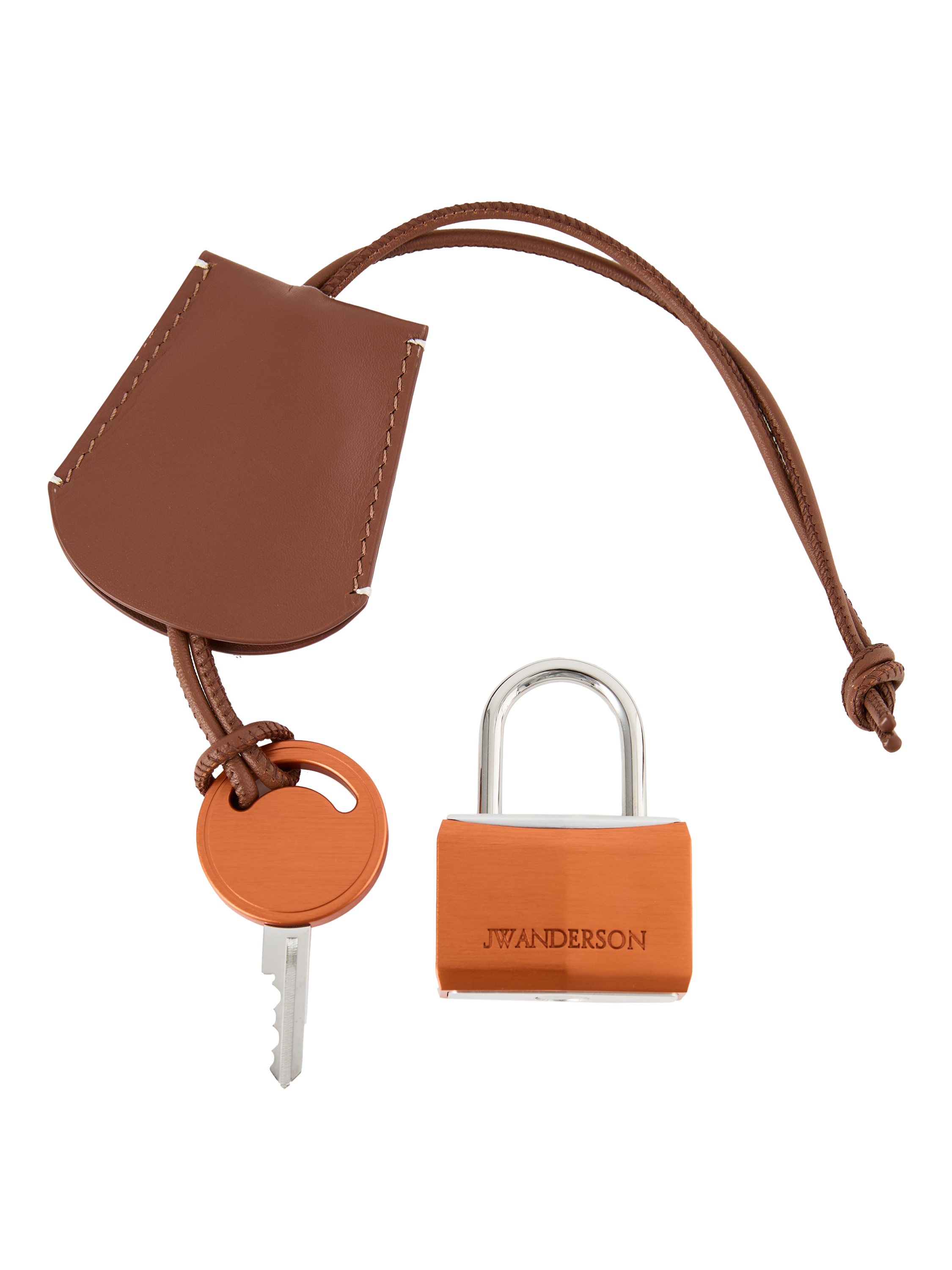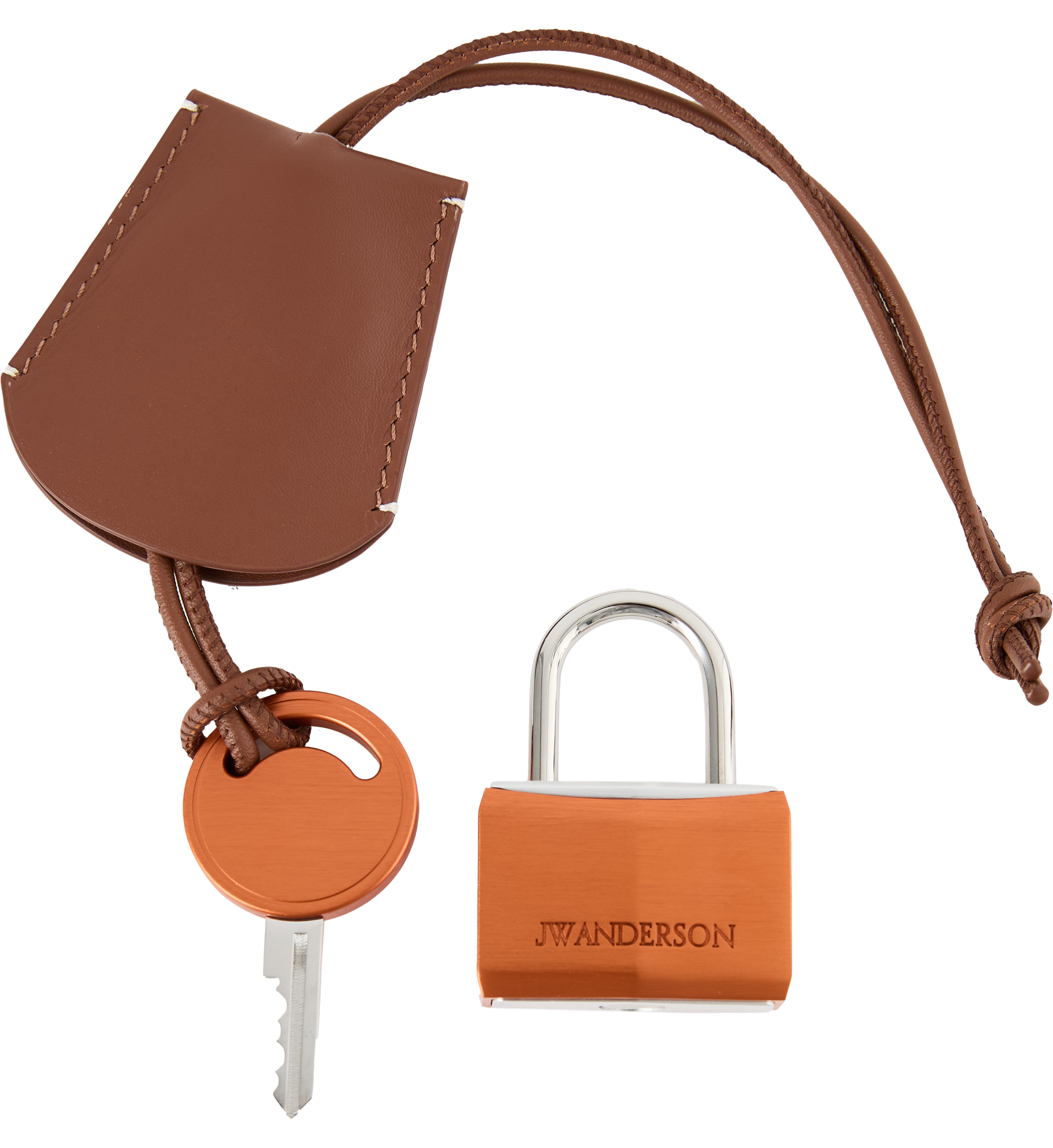 Dieser Anhänger in Orange von JW Anderson wurde aus hochwertigem Kalbsleder gefertigt und besticht durch das markante Design aus Vorhängeschloss, Schlüssel und einem kleinen Lederetui. Die Elemente sind über eine Lederkordel verbunden und lassen sich dekorativ tragen oder befestigen. Alle Bestandteile sind dezent mit einer Logo-Prägung versehen, was dem Accessoire eine exklusive Note verleiht.