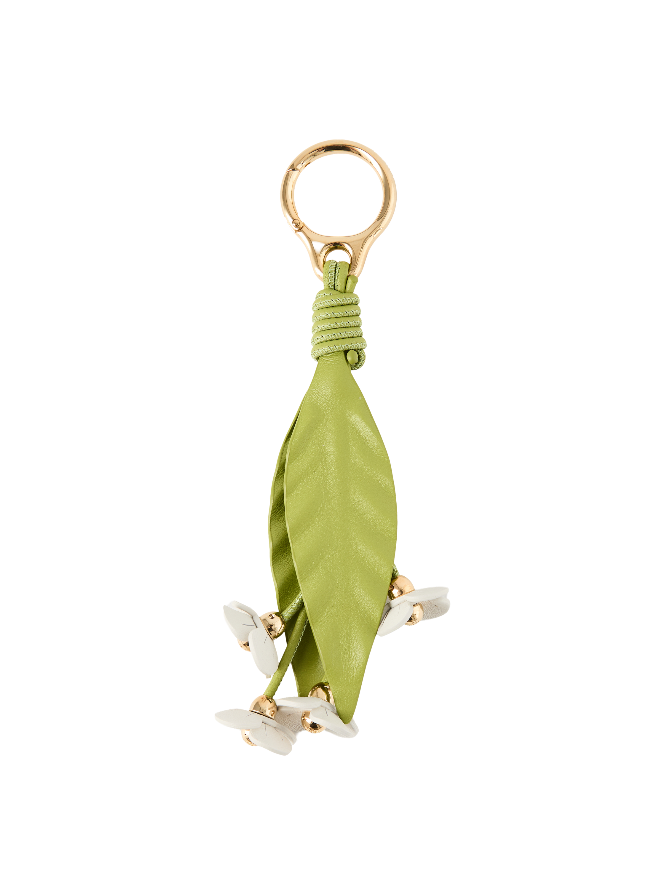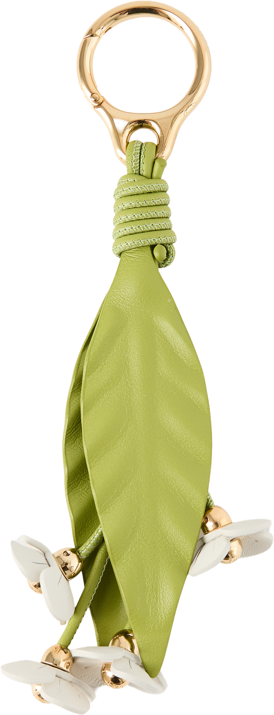 Der Anhänger 'Strawberry Flower' in Grün von LOEWE wurde aus Kalbsleder und Acetat gefertigt und besticht durch das Erdbeerblüten-Motiv. Der Schlaufenriemen mit Anagram-Pebble in Goldoptik rundet das Modell stilvoll ab.