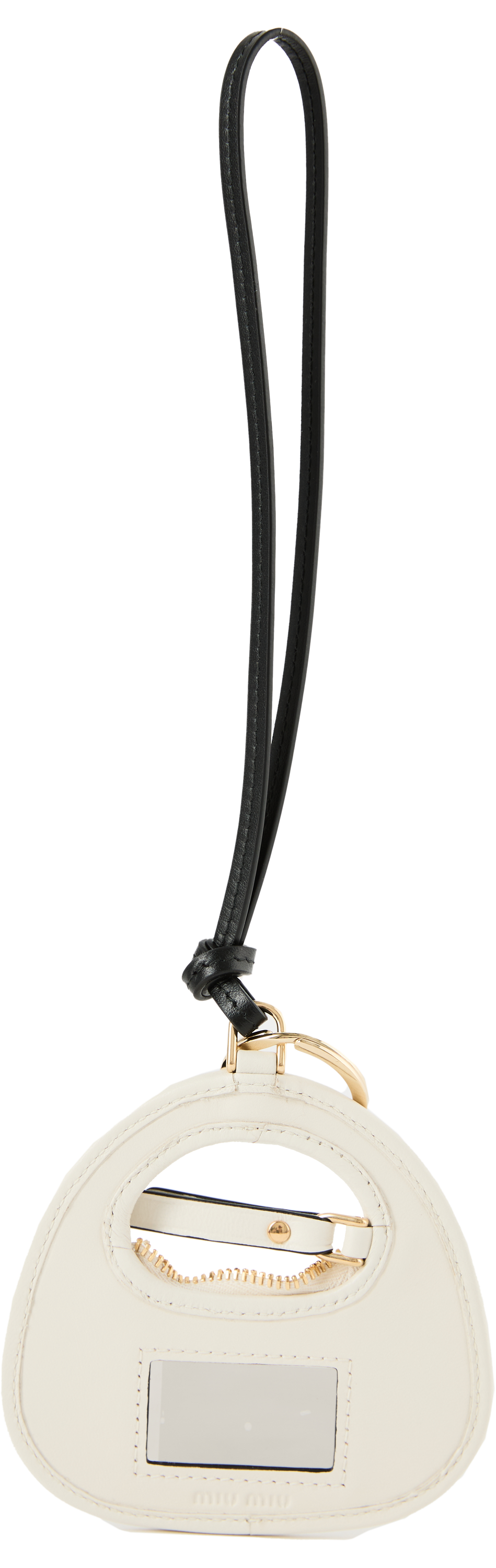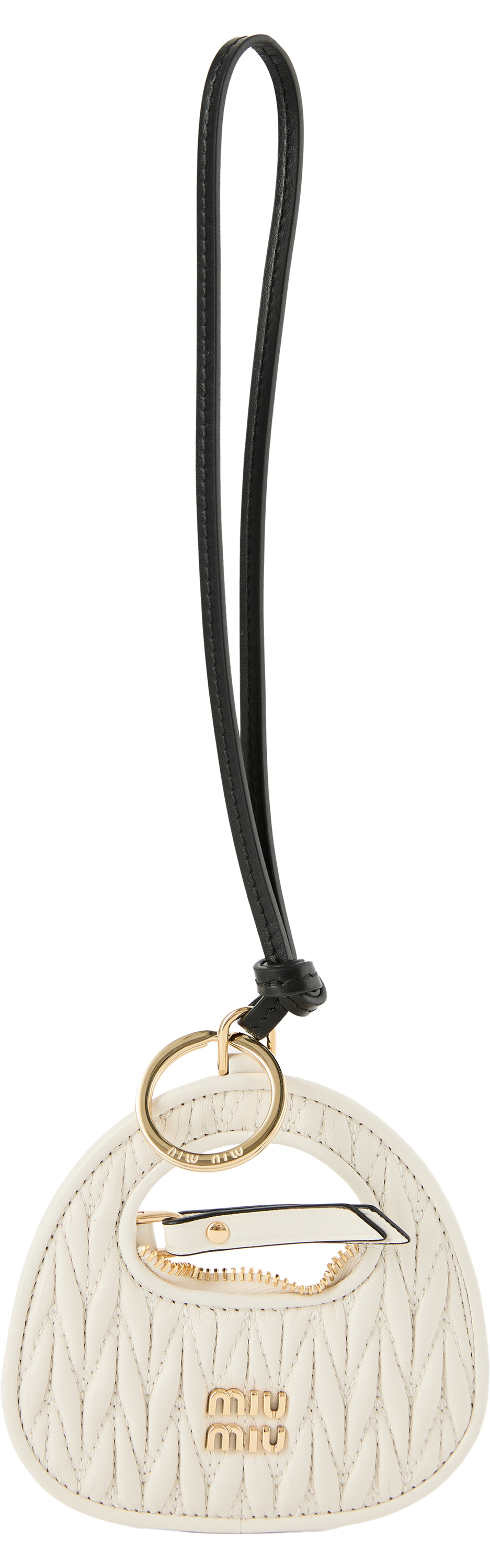 Dieser Anhänger 'Wander Matelassé' in Weiß von miu miu wurde aus Lammleder gefertigt und besticht durch das Miu Miu Logo. Die goldfarbenen Beschläge und der Rückspiegel runden das Modell stilvoll ab.