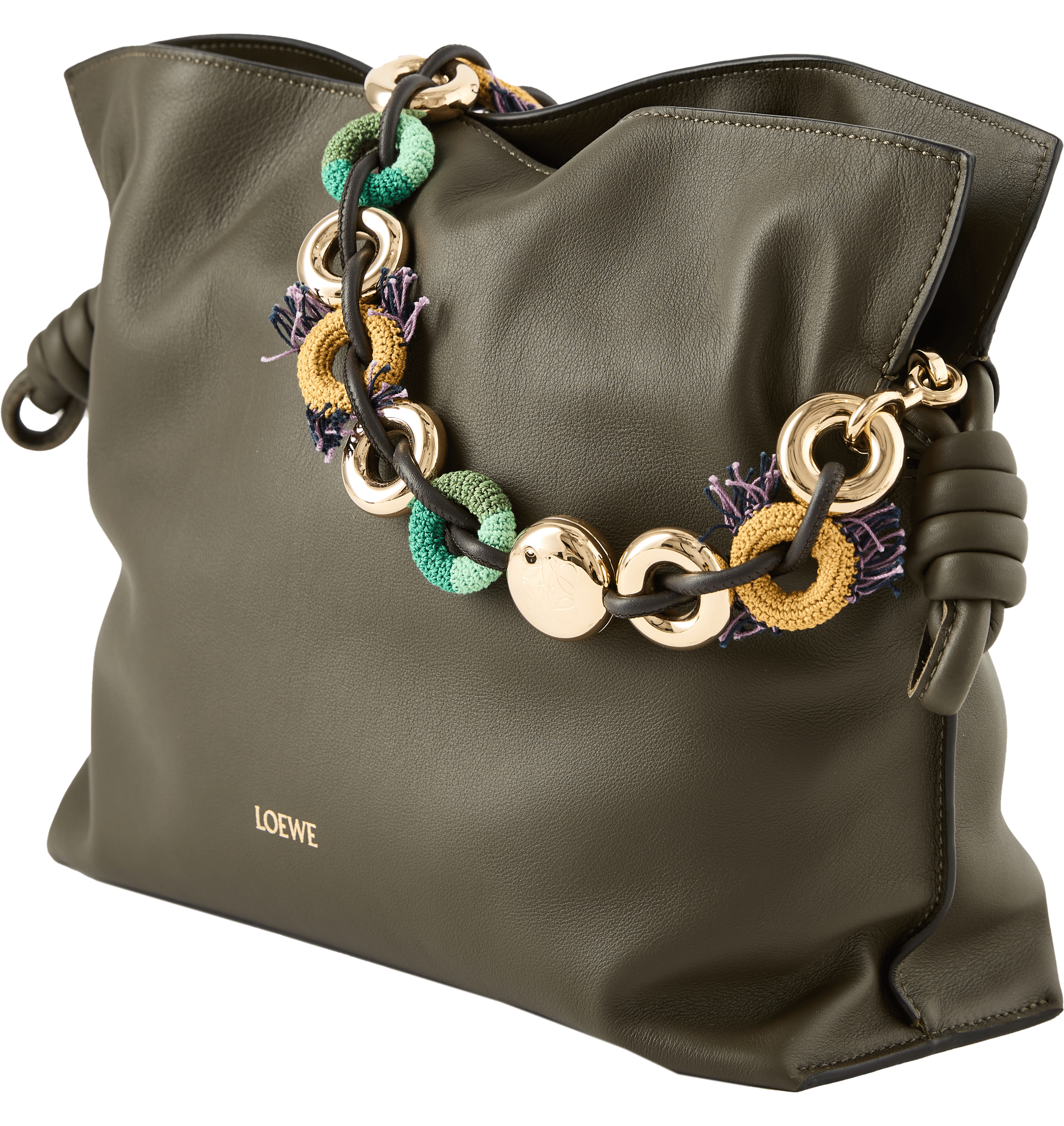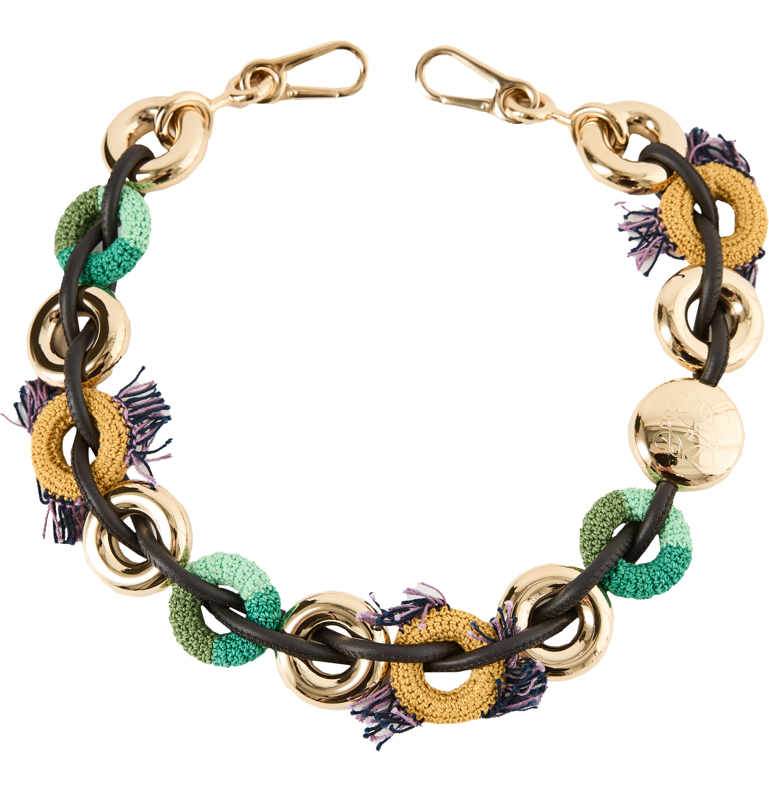 Der Kettenriemen 'Donut' in Grün/Gelb von LOEWE wurde aus Edelstahl und Baumwolle gefertigt und besticht durch die verspielten Kettenglieder in Donut-Form. Das Design kombiniert Ketten aus verschiedenen Materialien und wird durch ein goldfarbenes Kettenglied mit graviertem Anagramm stillvoll abgerundet. Die Ketten sind über ein Band aus Kalbsleder miteinander verbunden.