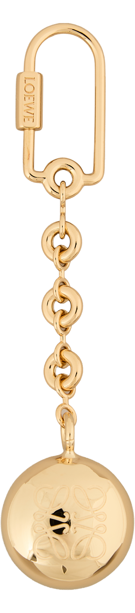 Der Schlüsselanhänger 'Pebble Keyring' in Gold von LOEWE wurde aus Messing gefertigt und besticht durch das Anagram Pebble an einer Donut Kette. Das silbergravierte Anagram sowie der Schraubenverschluss runden das Modell stilvoll ab.