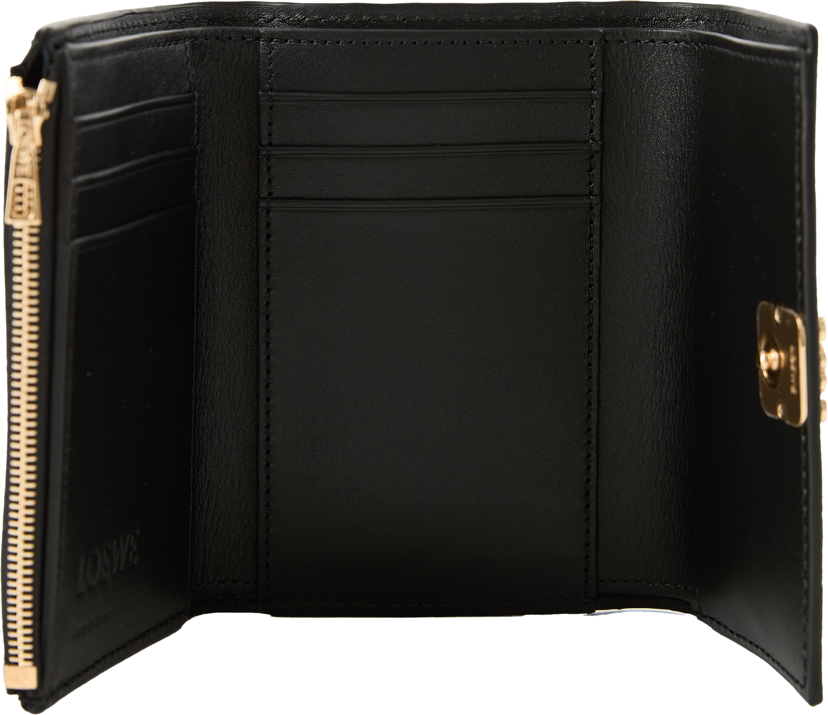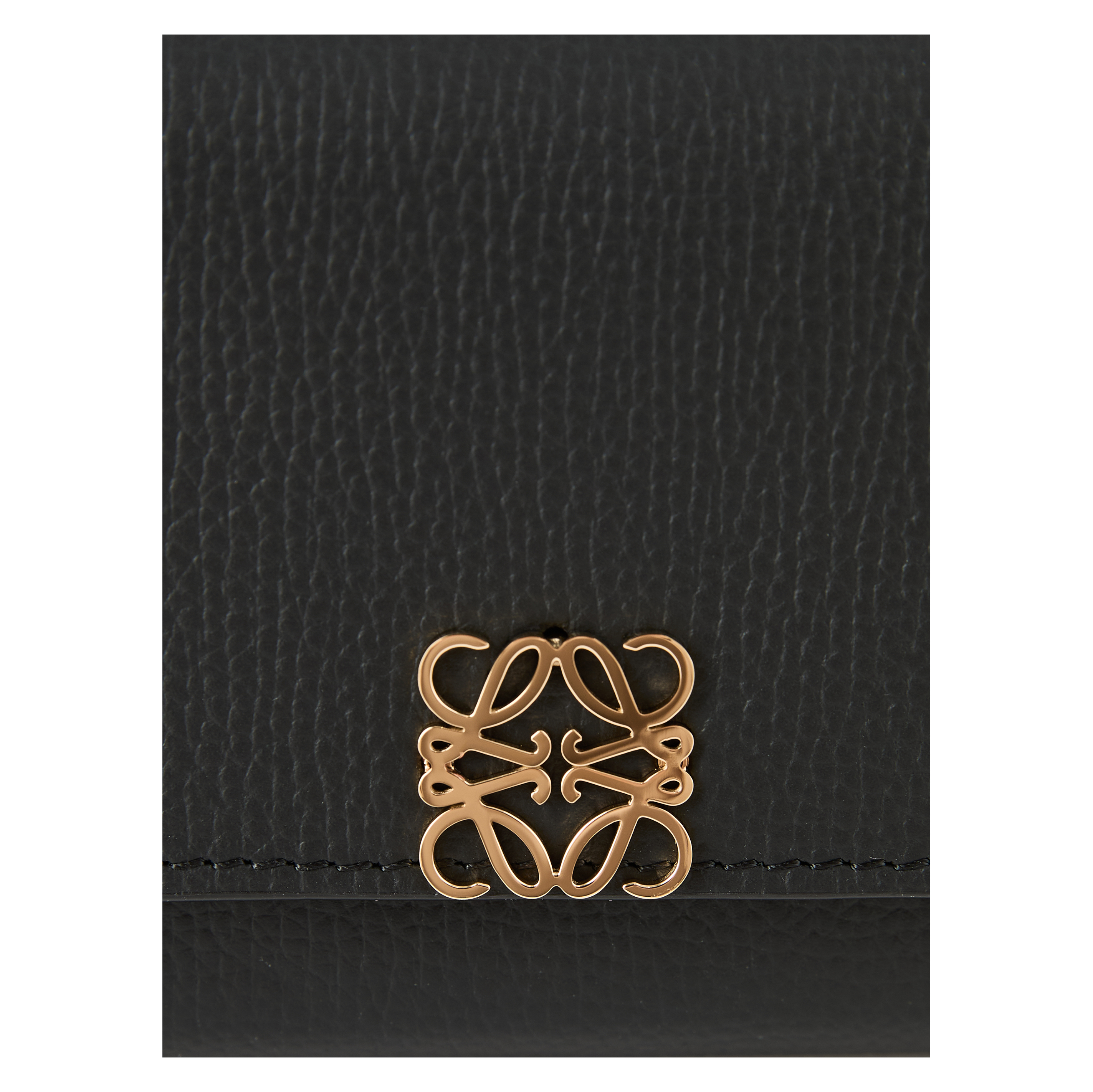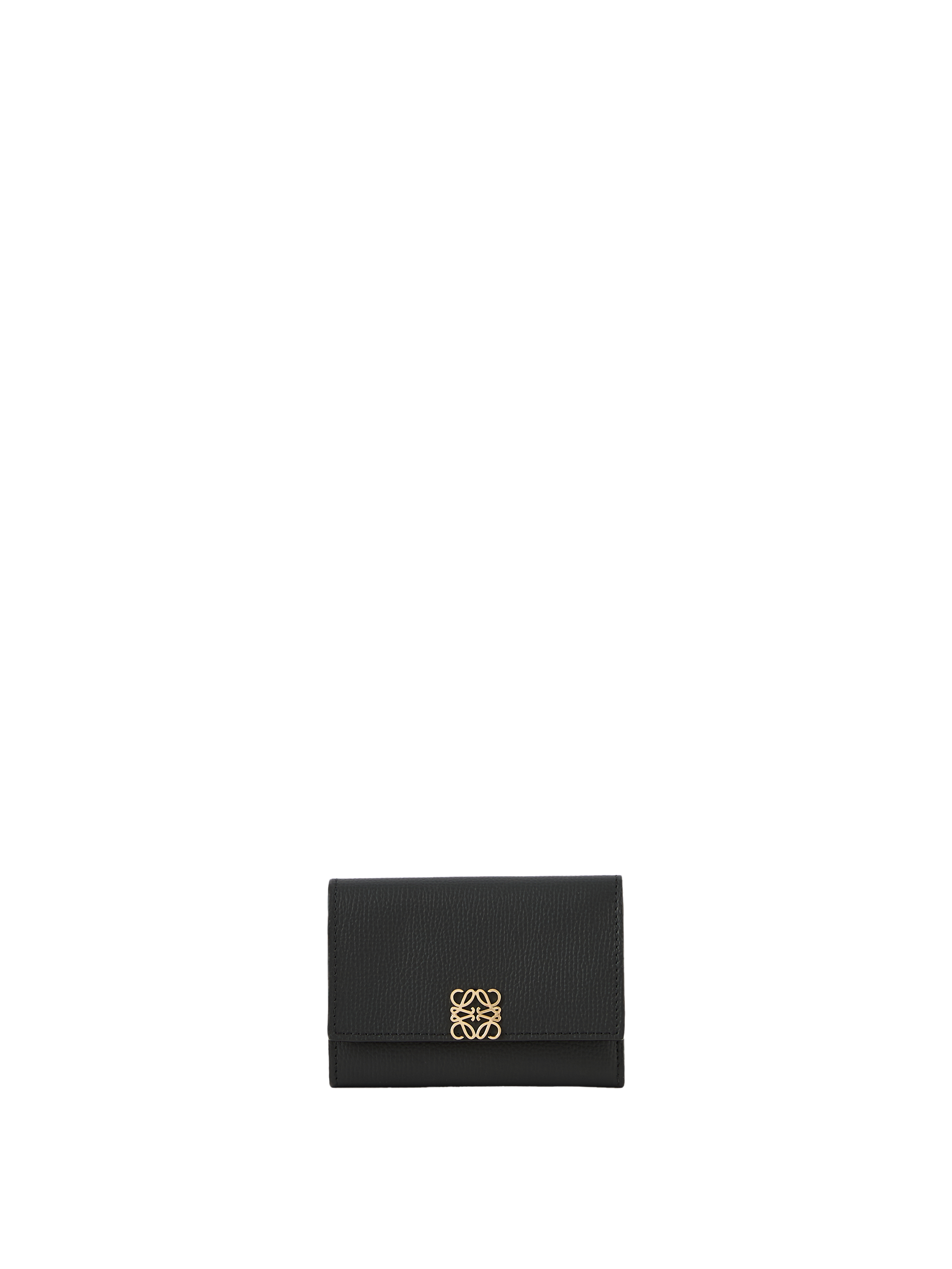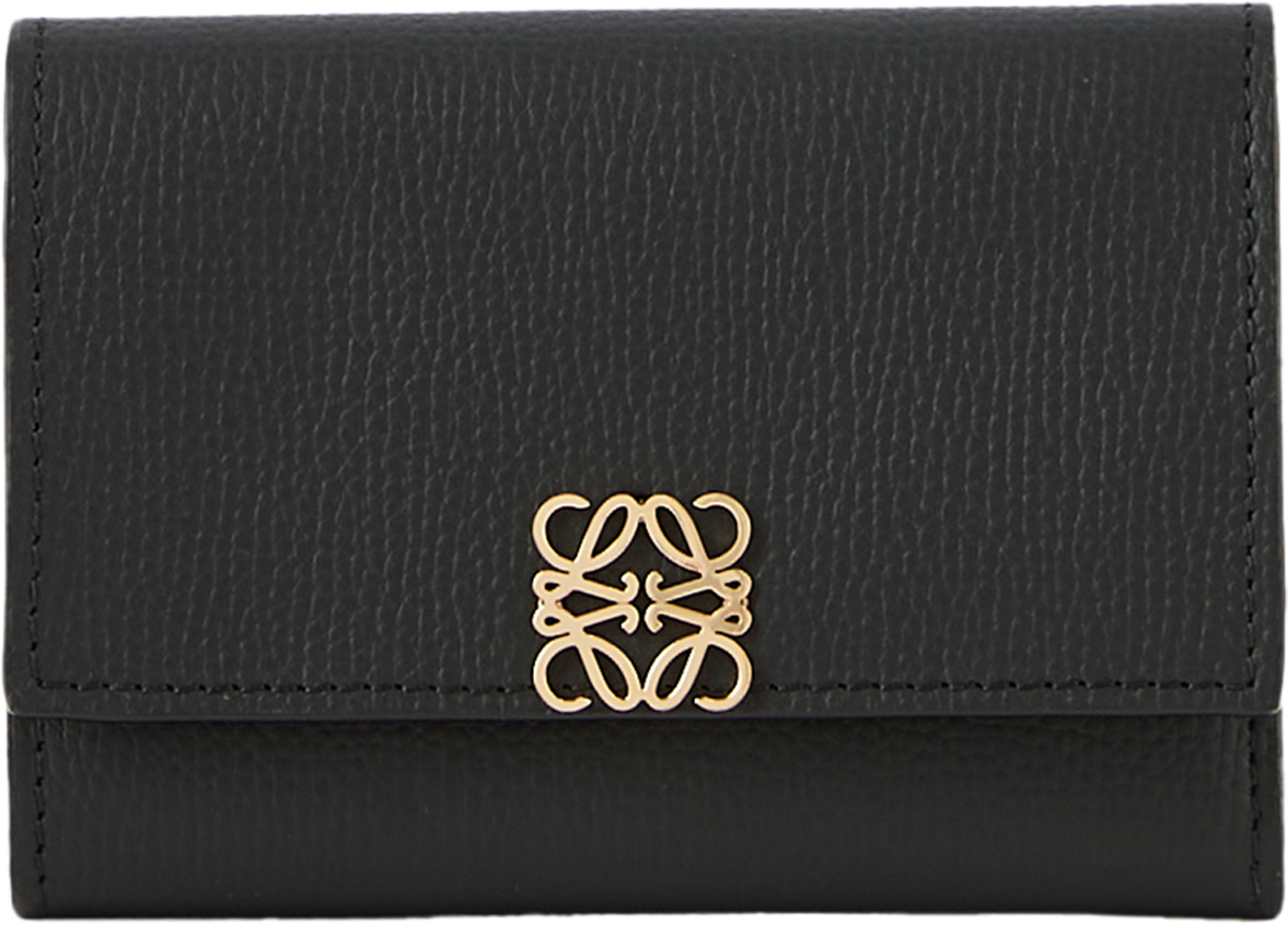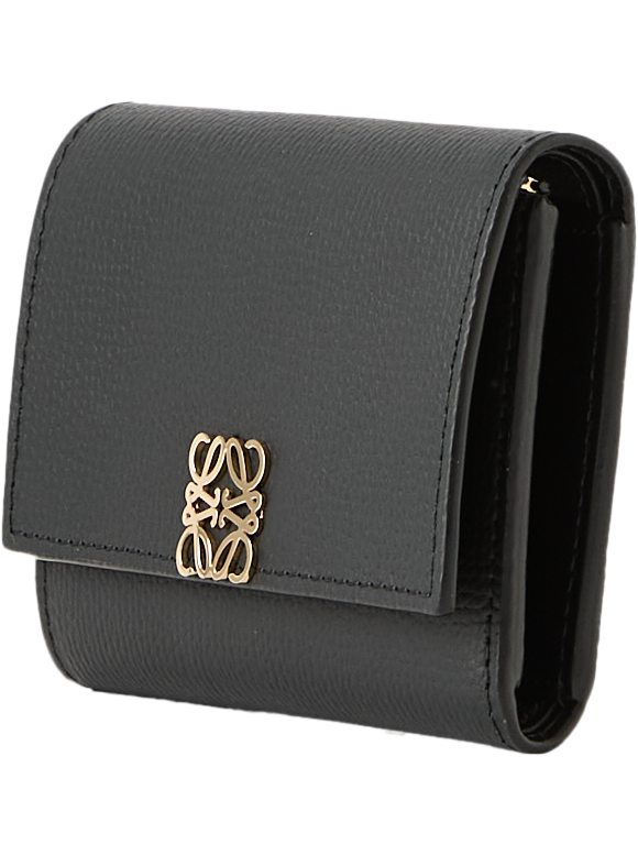 Die Geldbörse 'Anagram Small' in Schwarz von LOEWE wurde aus genarbtem Kalbsleder gefertigt und besticht durch den goldfarbenen Anagram-Druckknopfverschluss. Mit einem großen Hauptfach, zwei kleineren Fächern, sechs Kartenfächern und einem Münzfach dient das Modell als funktionaler und stilvoller Begleiter im Alltag.