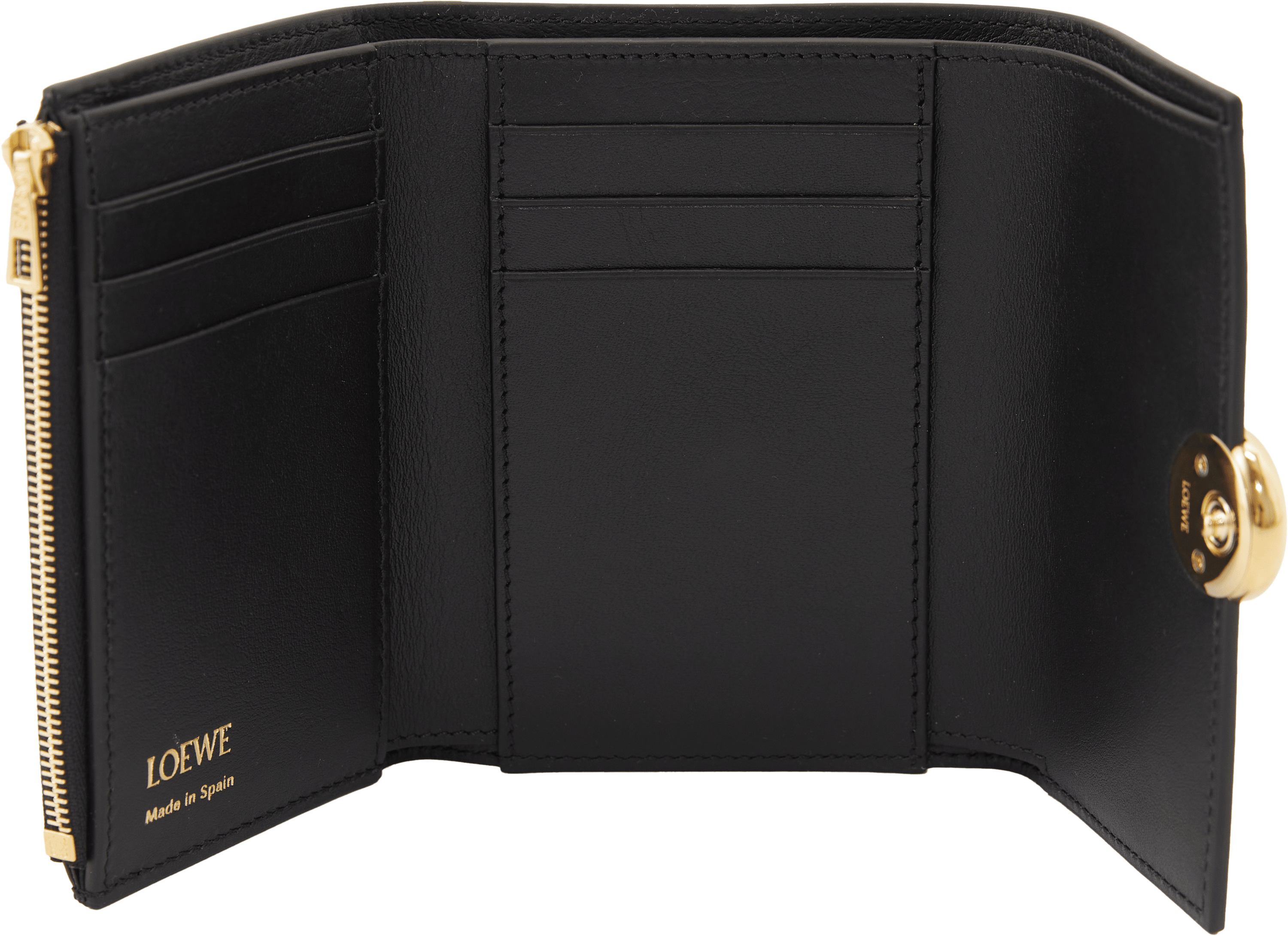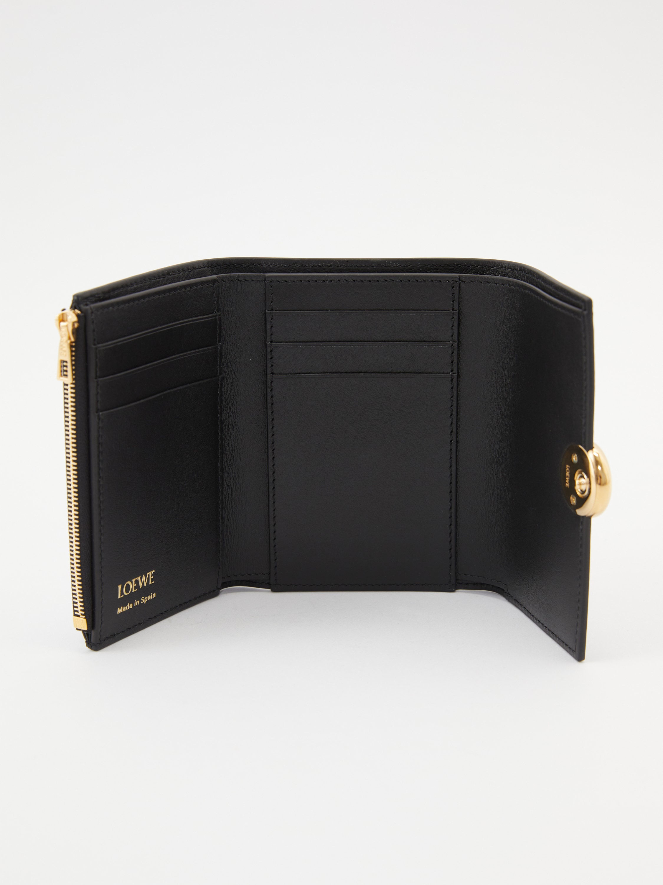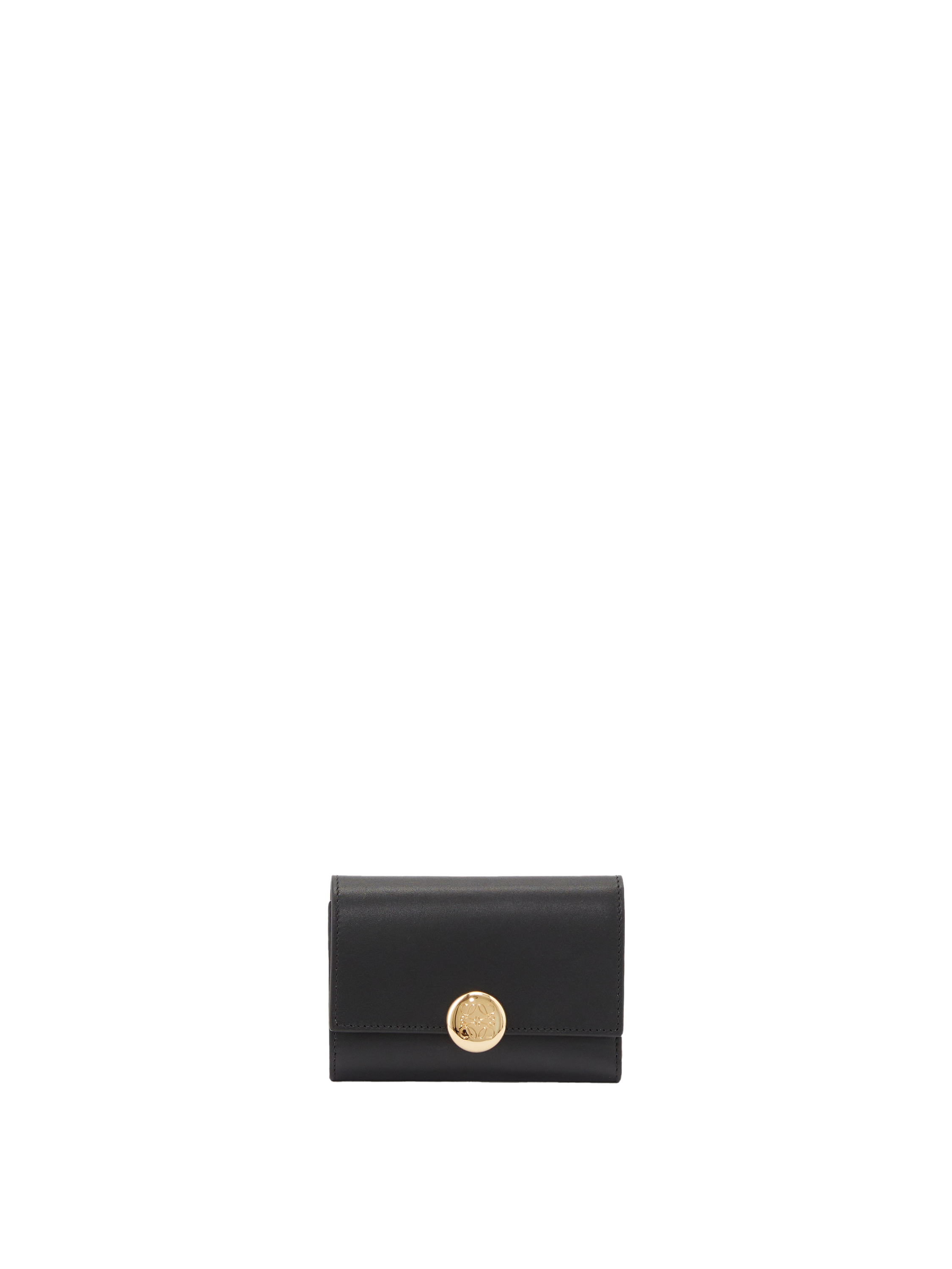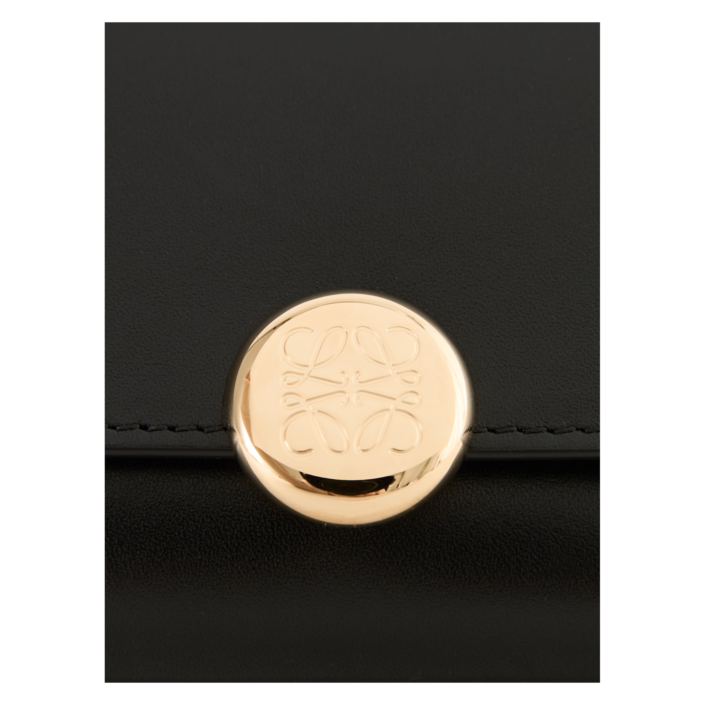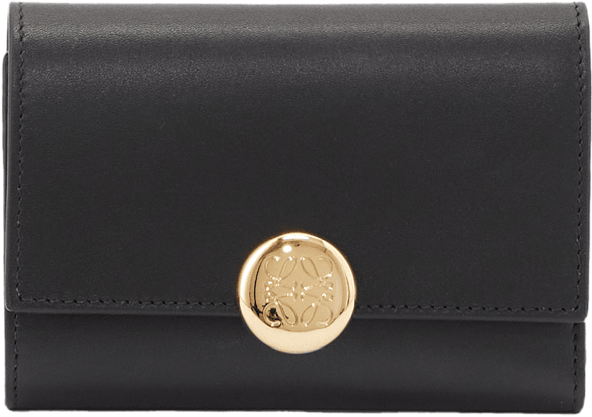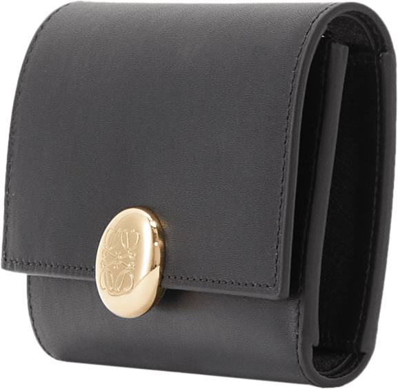 Die Geldbörse 'Pebble Small Vertical' in Schwarz von LOEWE wurde aus edlem Kalbsleder gefertigt und besticht durch den goldfarbenen Pebble-Verschluss mit dem geprägten Anagram. Mit einem großen Hauptfach, zwei kleineren Fächern, sechs Kartenfächern und einem Münzfach dient das Modell als funktionaler und stilvoller Begleiter im Alltag.