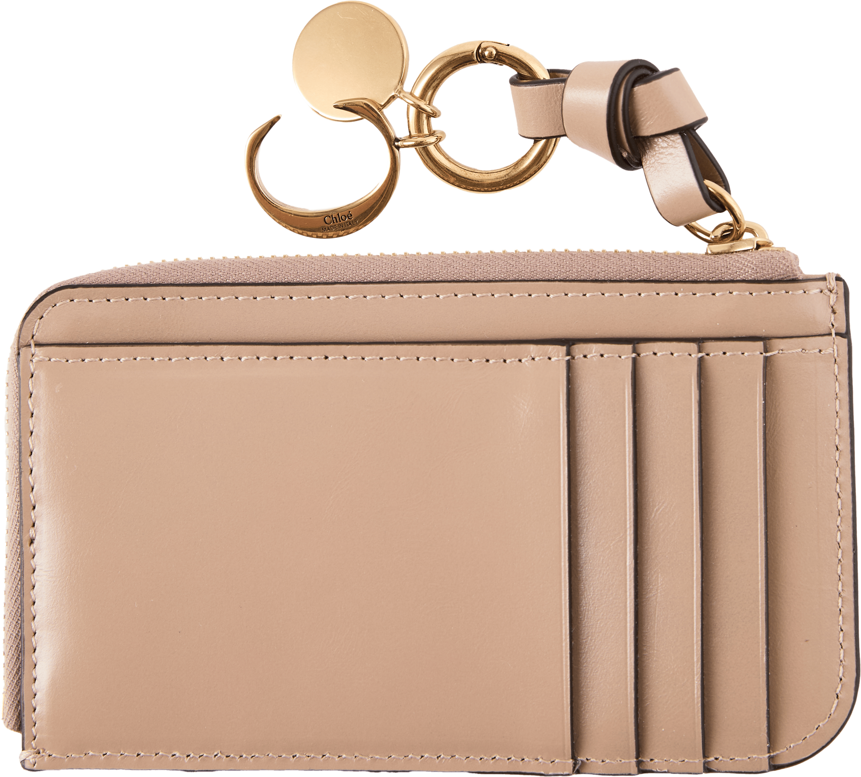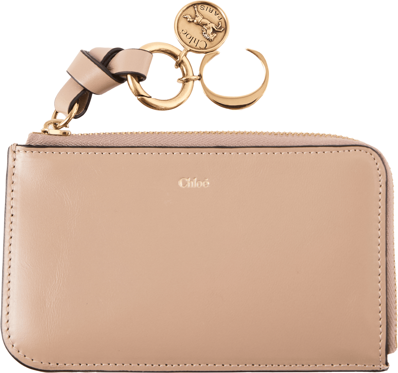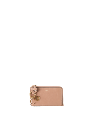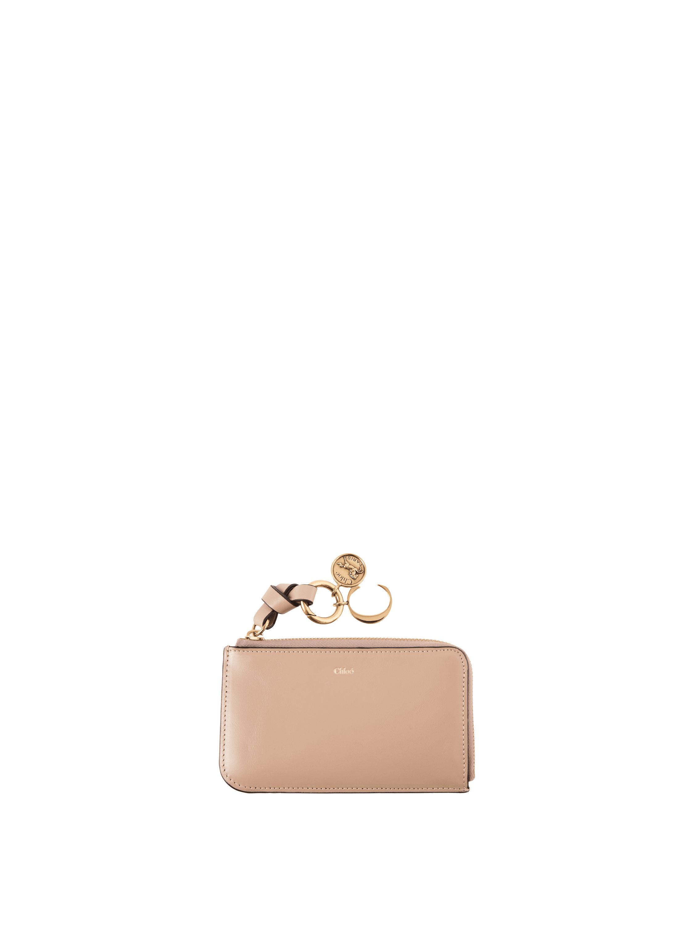 Das Portemonnaie 'Alphabet Small' in Deep Beige von Chloé wurde aus glänzendem Kalbsleder gefertigt und besticht durch die schlanke Silhouette. Das Modell verfügt über ein Hauptfach, vier Kartenfächer sowie ein flaches Steckfach auf der Rückseite. Der goldfarbene Reißverschluss in Kombination mit dem dezent geprägten Chloé-Logo setzt elegante Akzente. Ein geknotetes Lederband mit goldenem Initial-Anhänger und Pferdemedaillon rundet das charakteristische Design stilvoll ab.