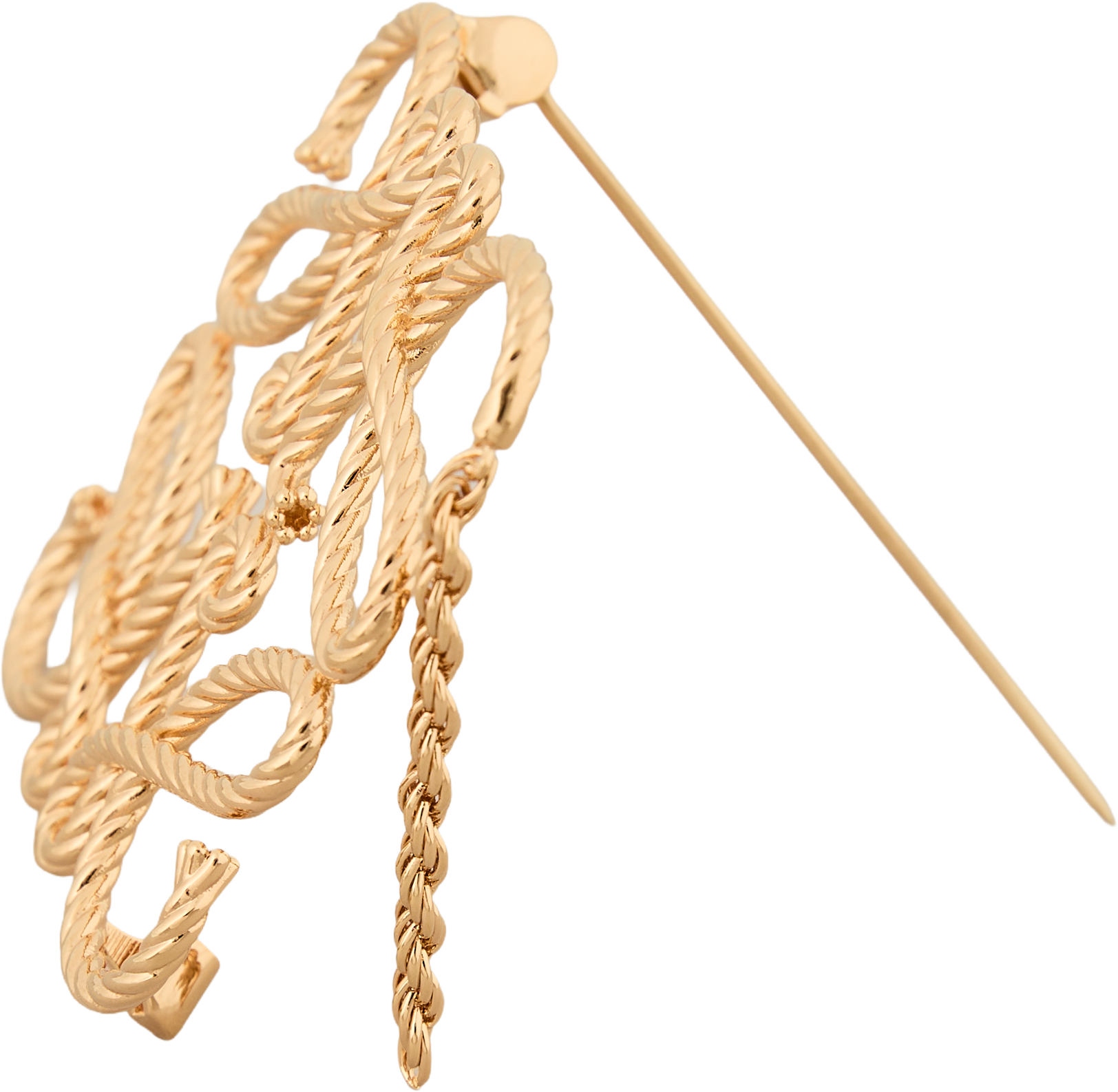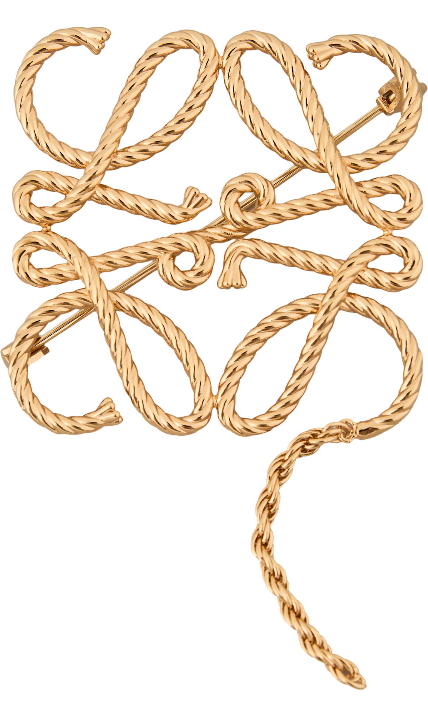 Diese Anagram-Brosche in Gold von LOEWE wurde aus Messing gefertigt und besticht durch die geflochtene Seilstruktur. Die Rückseite besticht durch einen Stiftverschluss mit Sicherheitshaken.