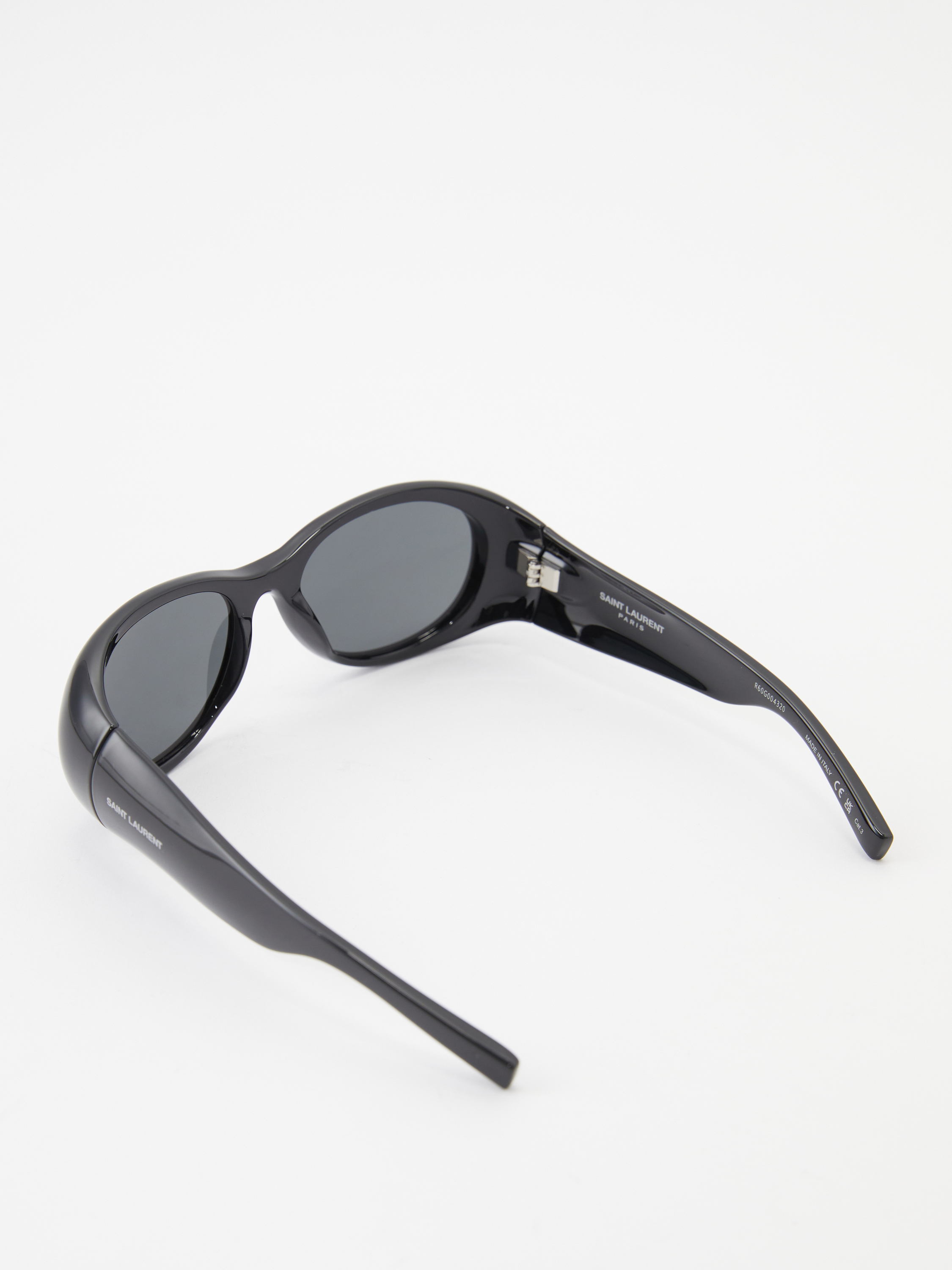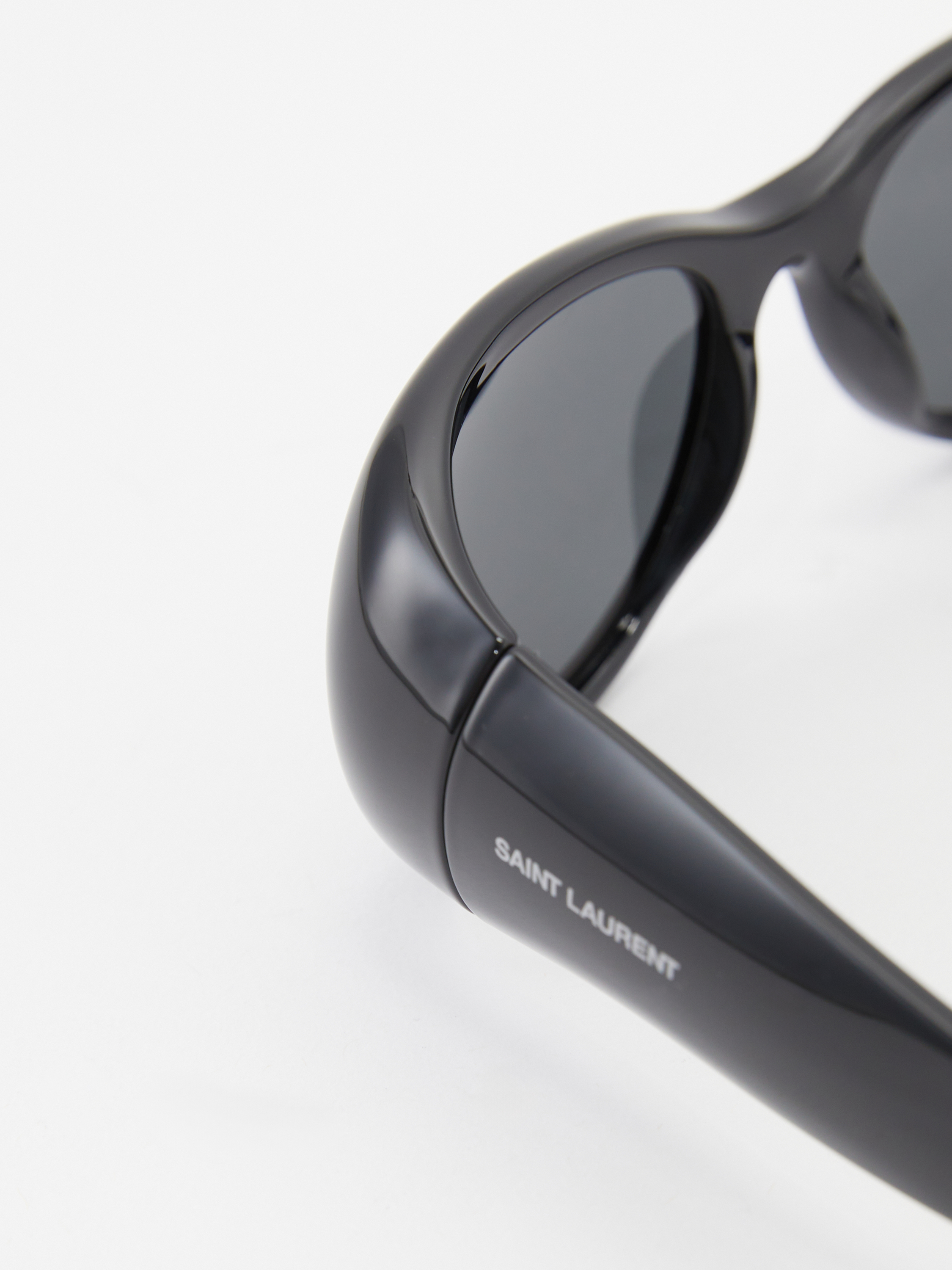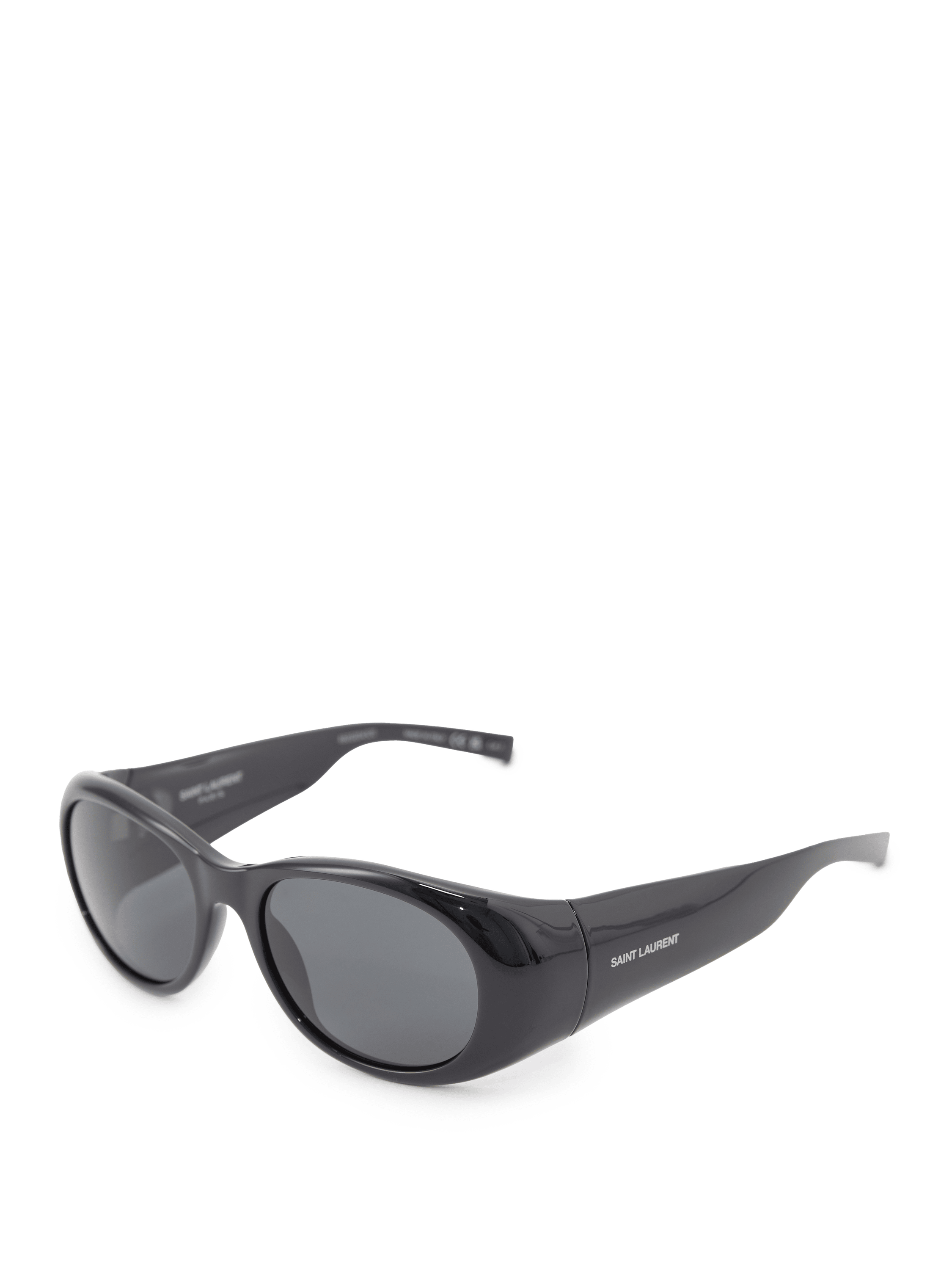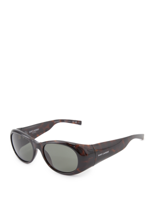 Diese Sonnenbrille in Schwarz von Saint Laurent wurde aus Acetat gefertigt und besticht durch das dezente Gestell. Der ovale Rahmen und der weiße Saint Laurent-Schriftzug am Bügel zeichnen dieses Design aus.