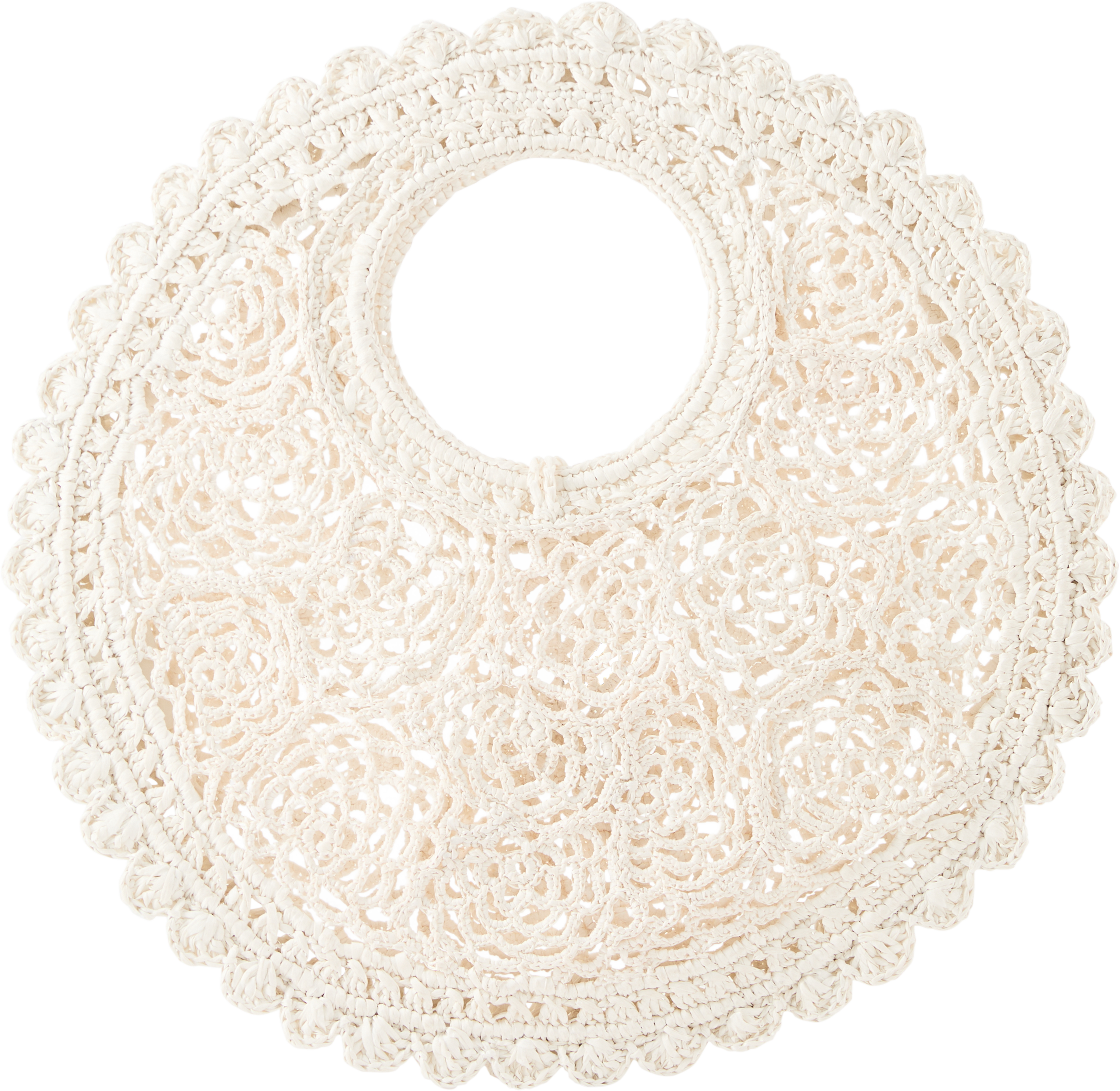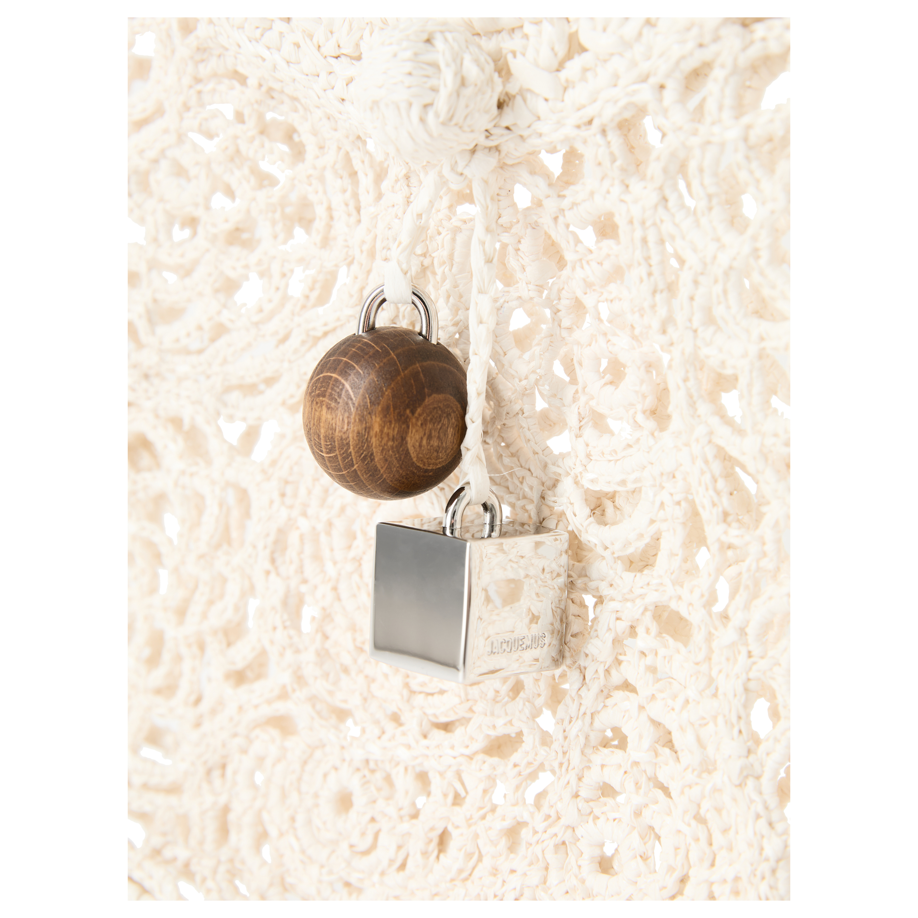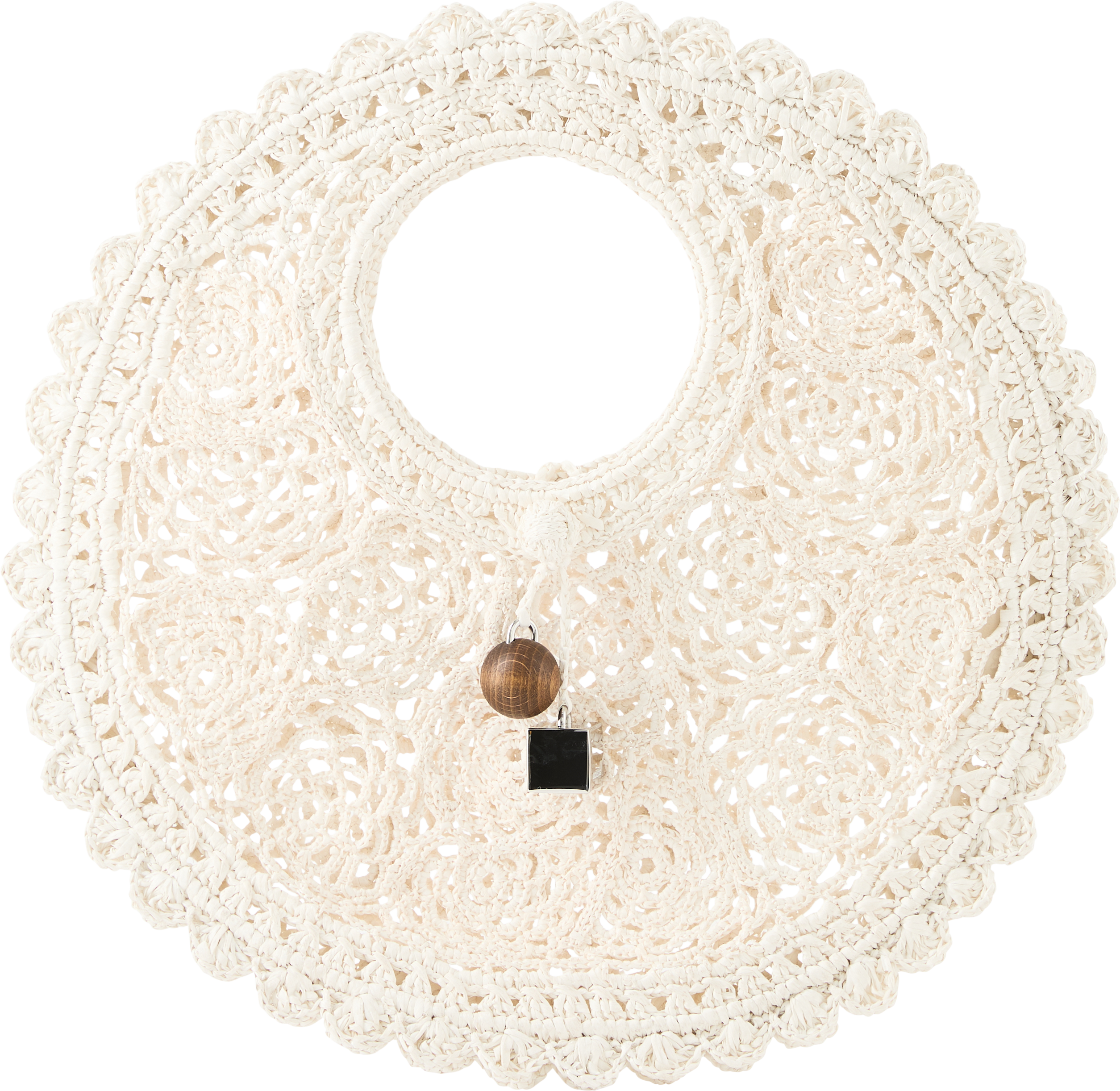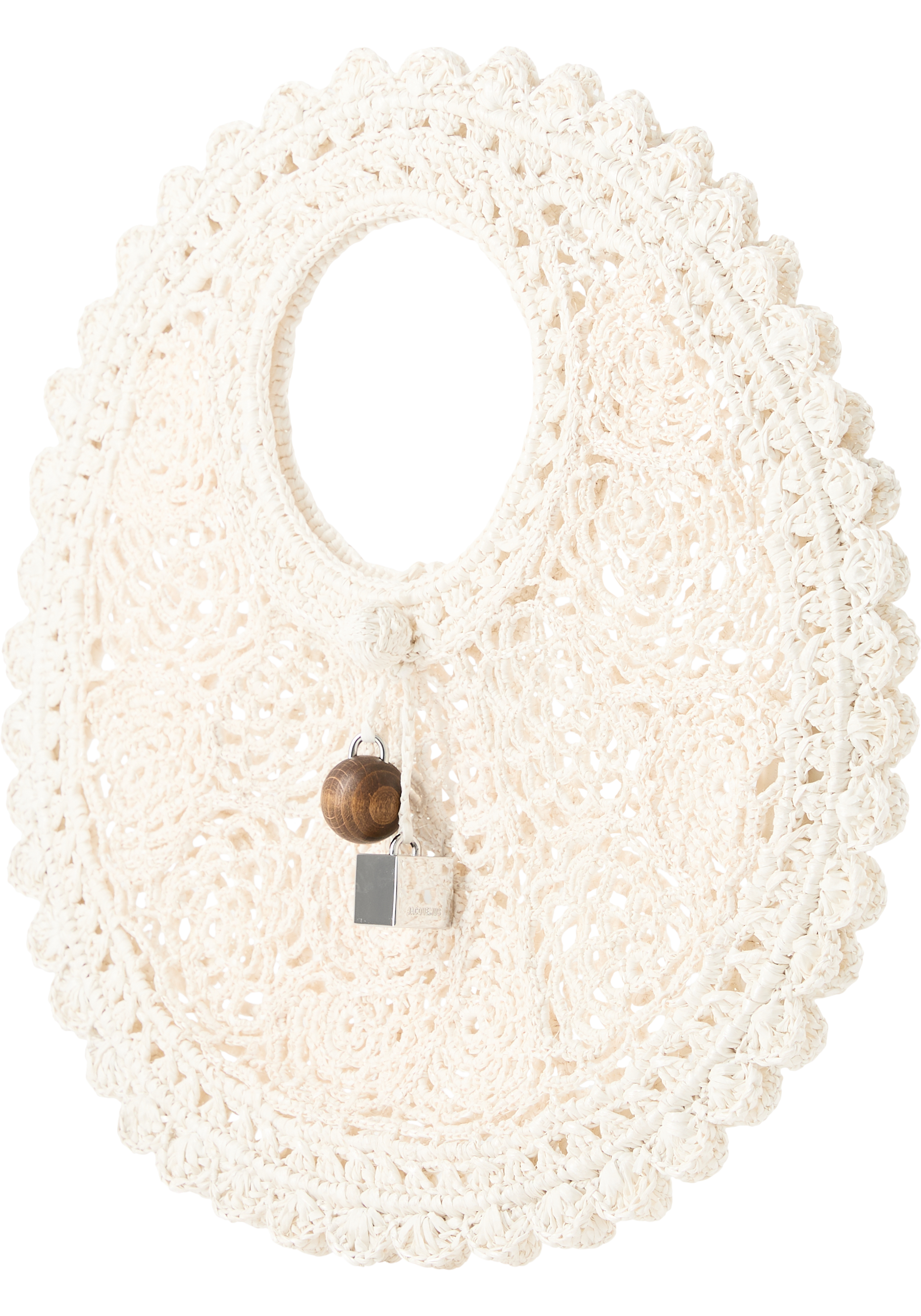 Die Handtasche 'Le Petit Rond Spiaggia' in Weiß von JACQUEMUS wurde aus Bast gefertigt und besticht durch die handgefertigte Verarbeitung. Der Knotenverschluss, der Anhänger ''Rond-Carré aus Holz und silberfarbenem Metall sowie die gezackten Kanten runden das Design ab.