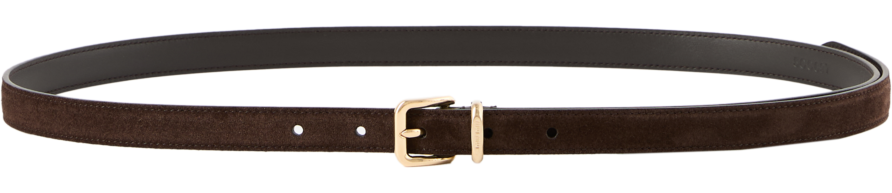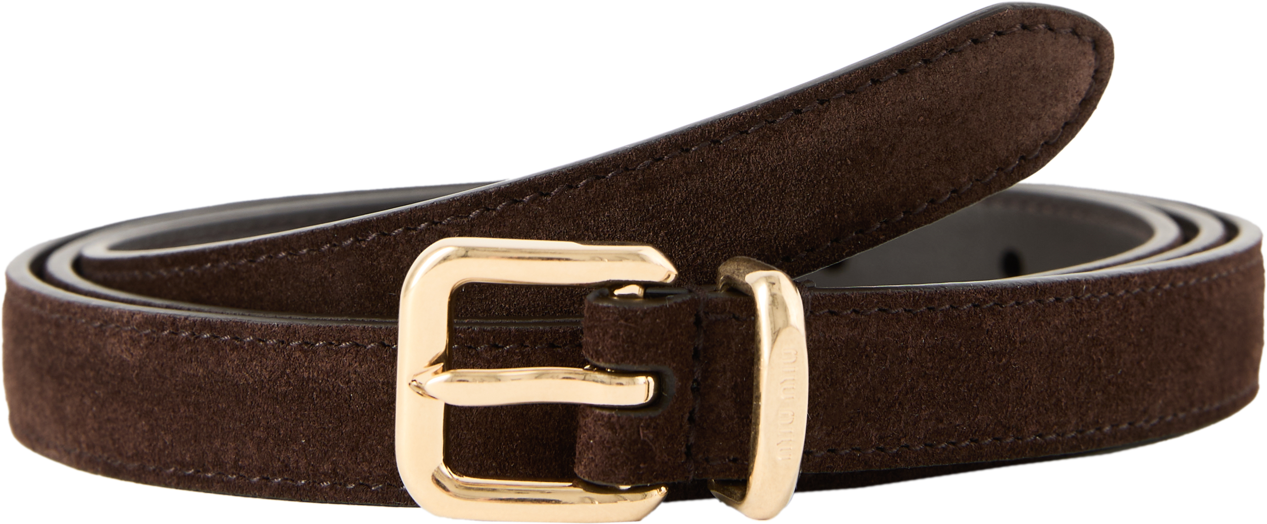 Dieser Gürtel in Dunkelbraun/Gold von miu miu wurde aus hochwertigem Kalbsleder gefertigt und besticht durch das klassische miu miu Logo auf der Schnalle. Das schmale Accessoire hat eine Breite von 15 Millimetern, weshalb Sie es einfach durch die Schlaufen einer Hose ziehen können.