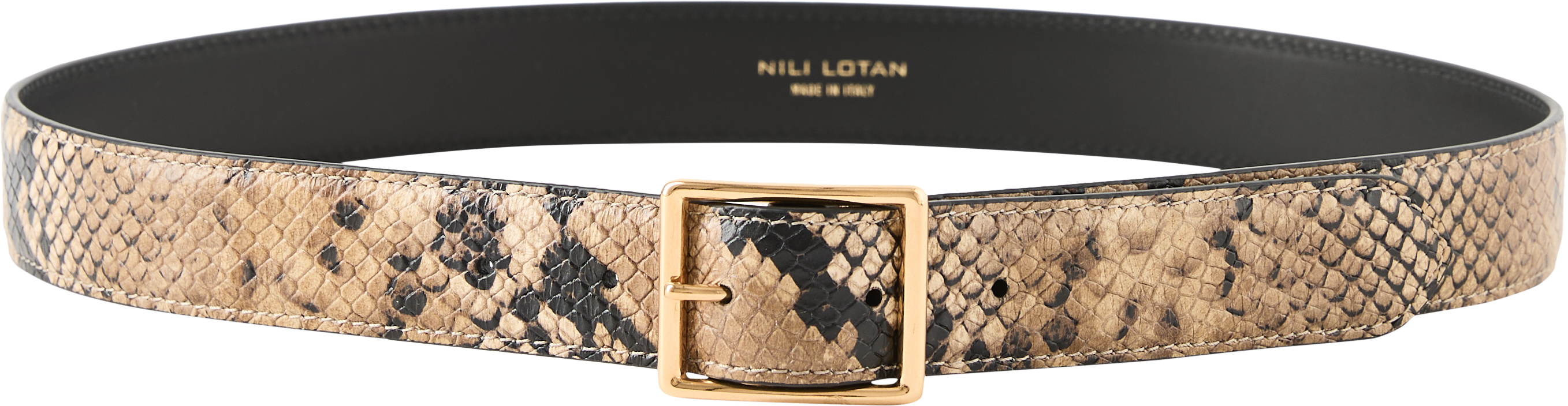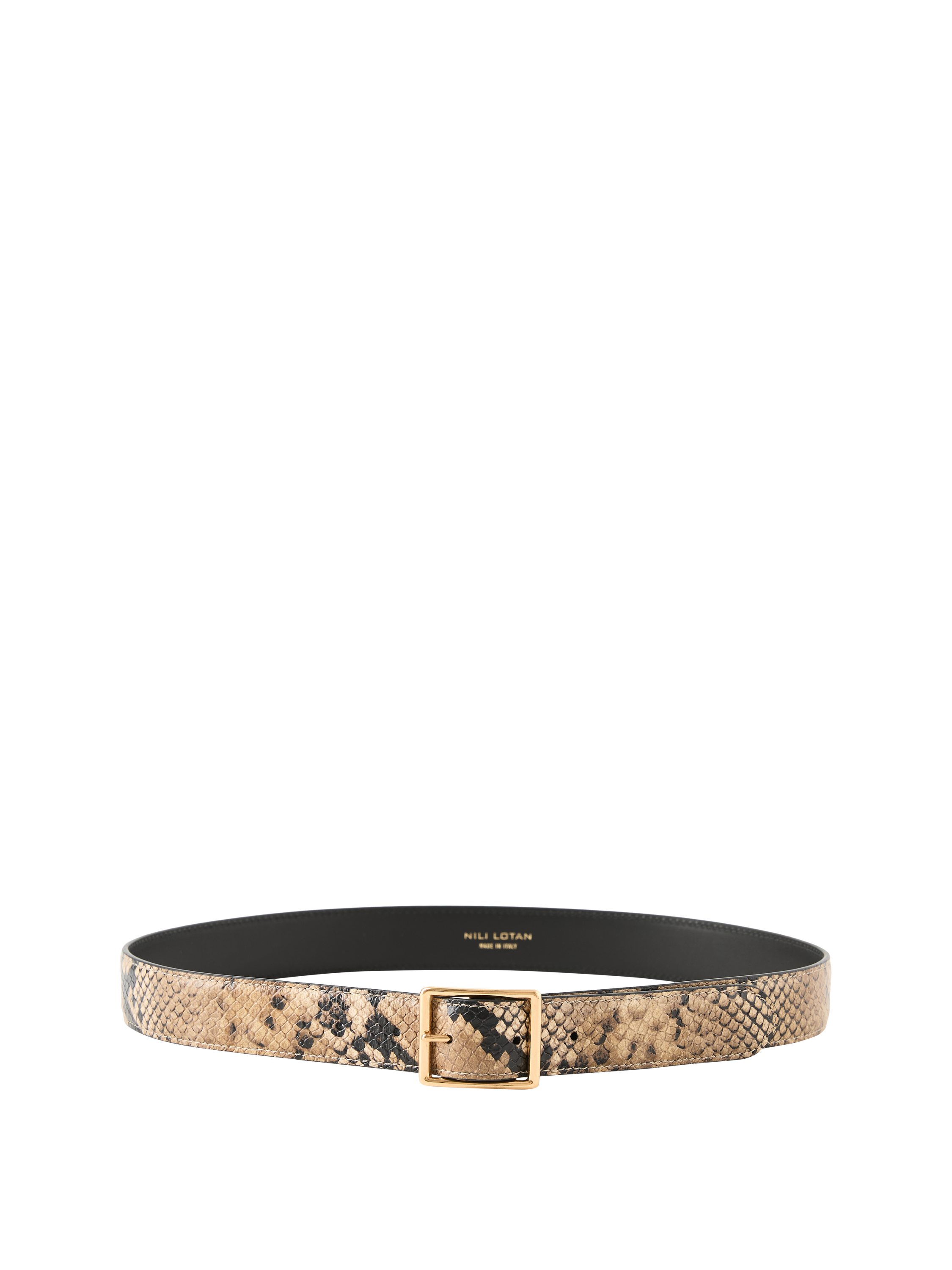 Der Gürtel 'Gabriele' in Taupe von NILI LOTAN wurde aus hochwertigem Ziegenleder gefertigt und besticht durch die klassische Schlangen-Optik. Die goldfarbene Schnalle verleiht dem Modell einen edlen Akzent und vollendet das stilvolle Design.