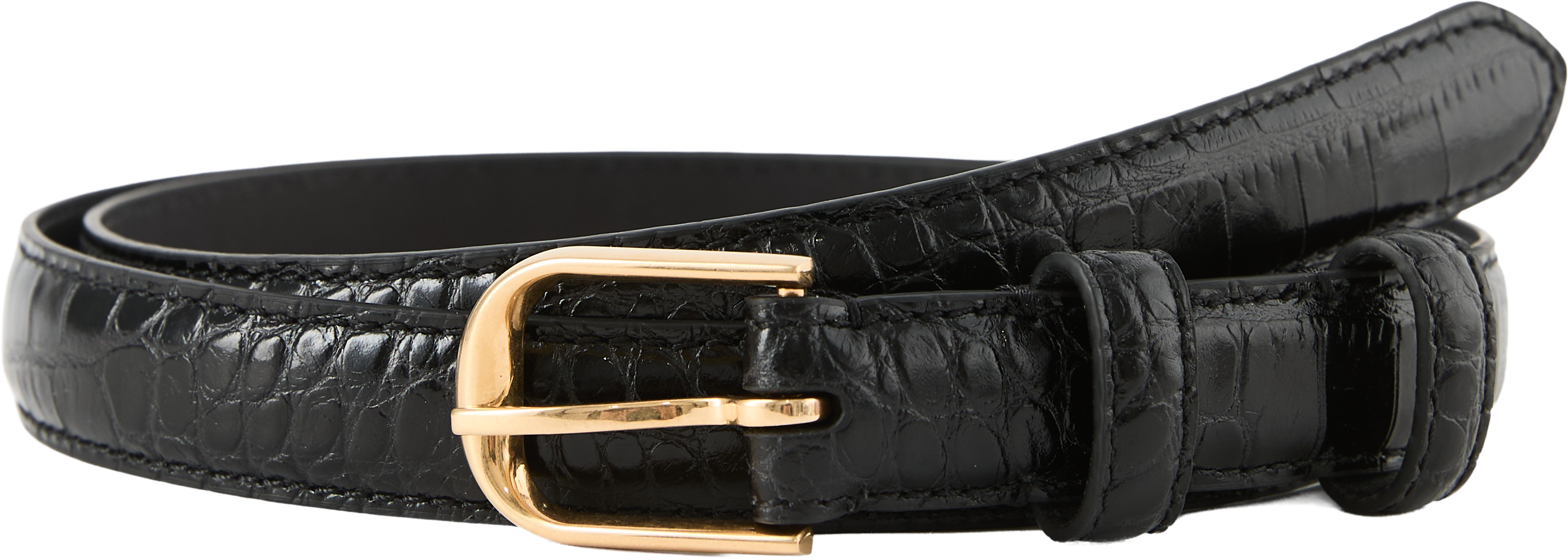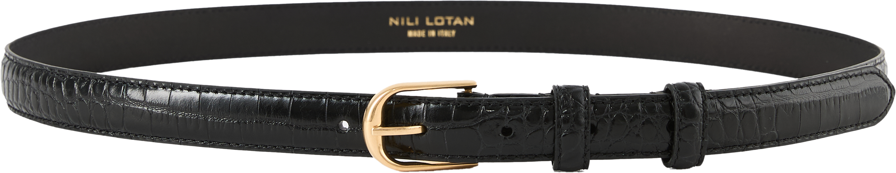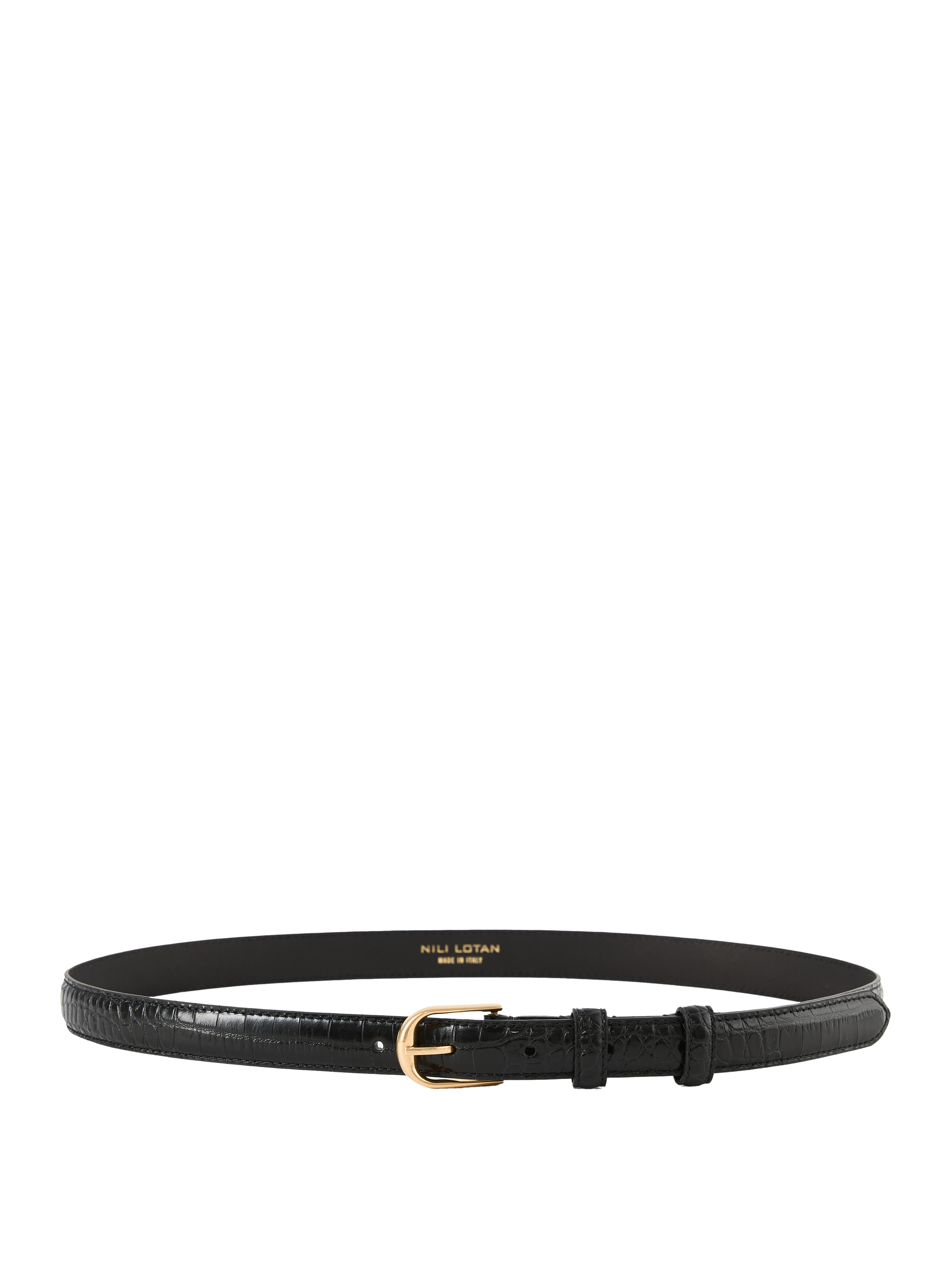 Der Gürtel 'Jane' von NILI LOTAN in Schwarz wurde aus hochwertigem Kalbsleder gefertigt und besticht durch die Kroko-Optik. Die goldfarbene Schnalle und die Logoprägung vollenden das zeitlose Modell.