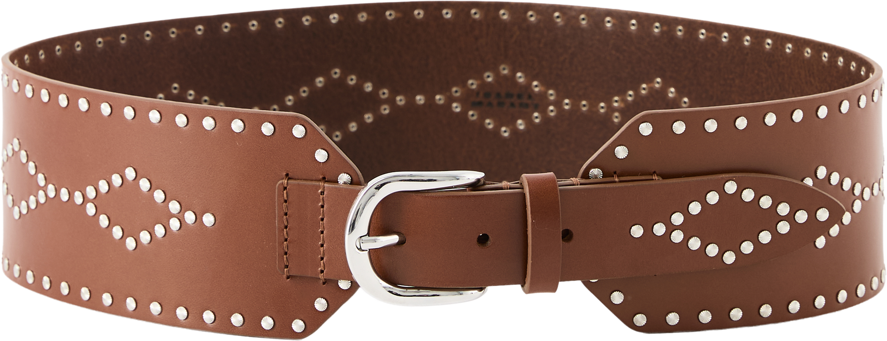 Der Ledergürtel 'Lucie' in Cognac von Isabel Marant wurde aus hochwertigem Rinderhaar gefertigt und besticht durch die Nieten. Der breite Gürtel, der verstellbare Verschluss mit Metallschnalle sowie die silberfarbenen Metallakzente zeichnen dieses Accessoire aus.