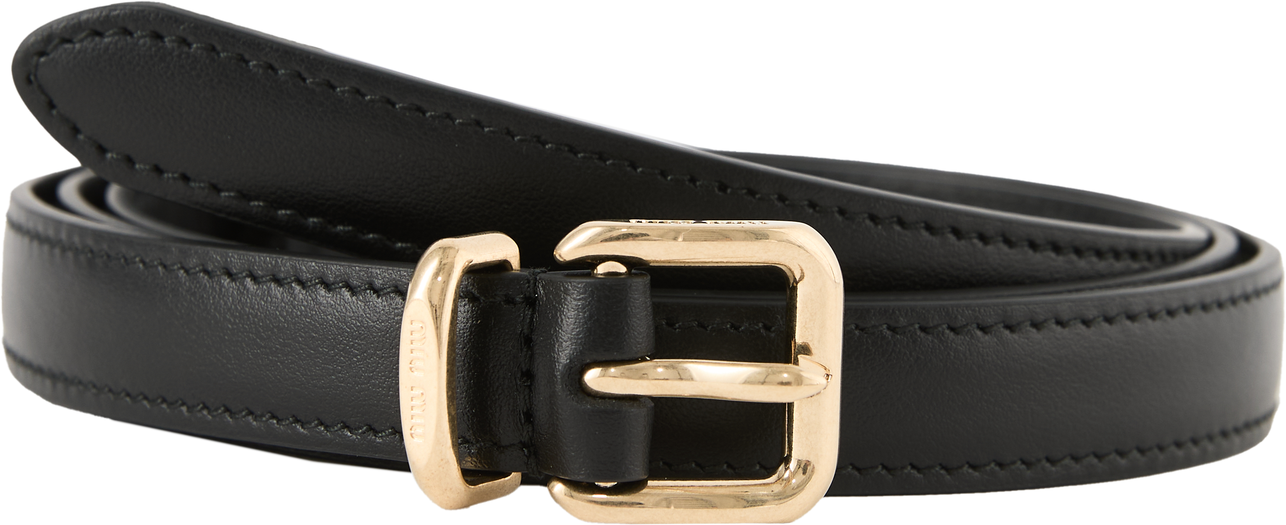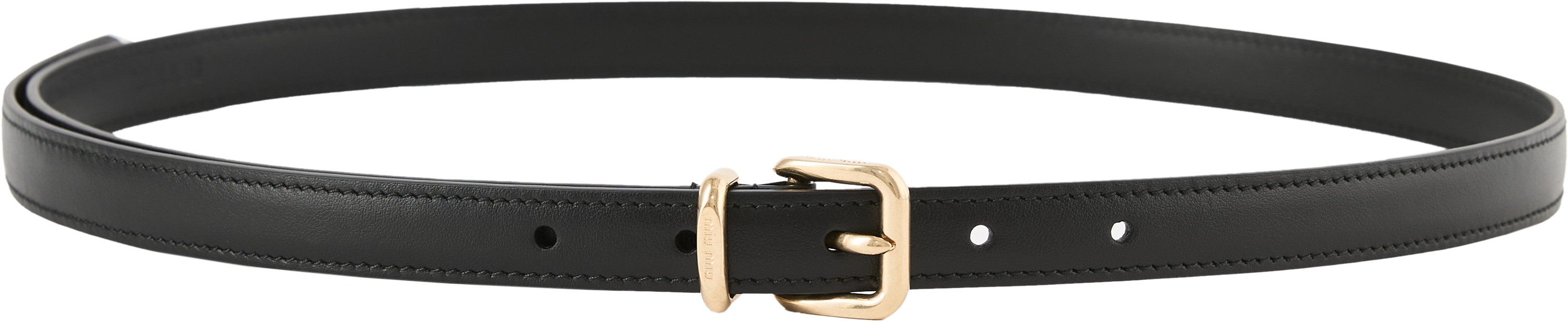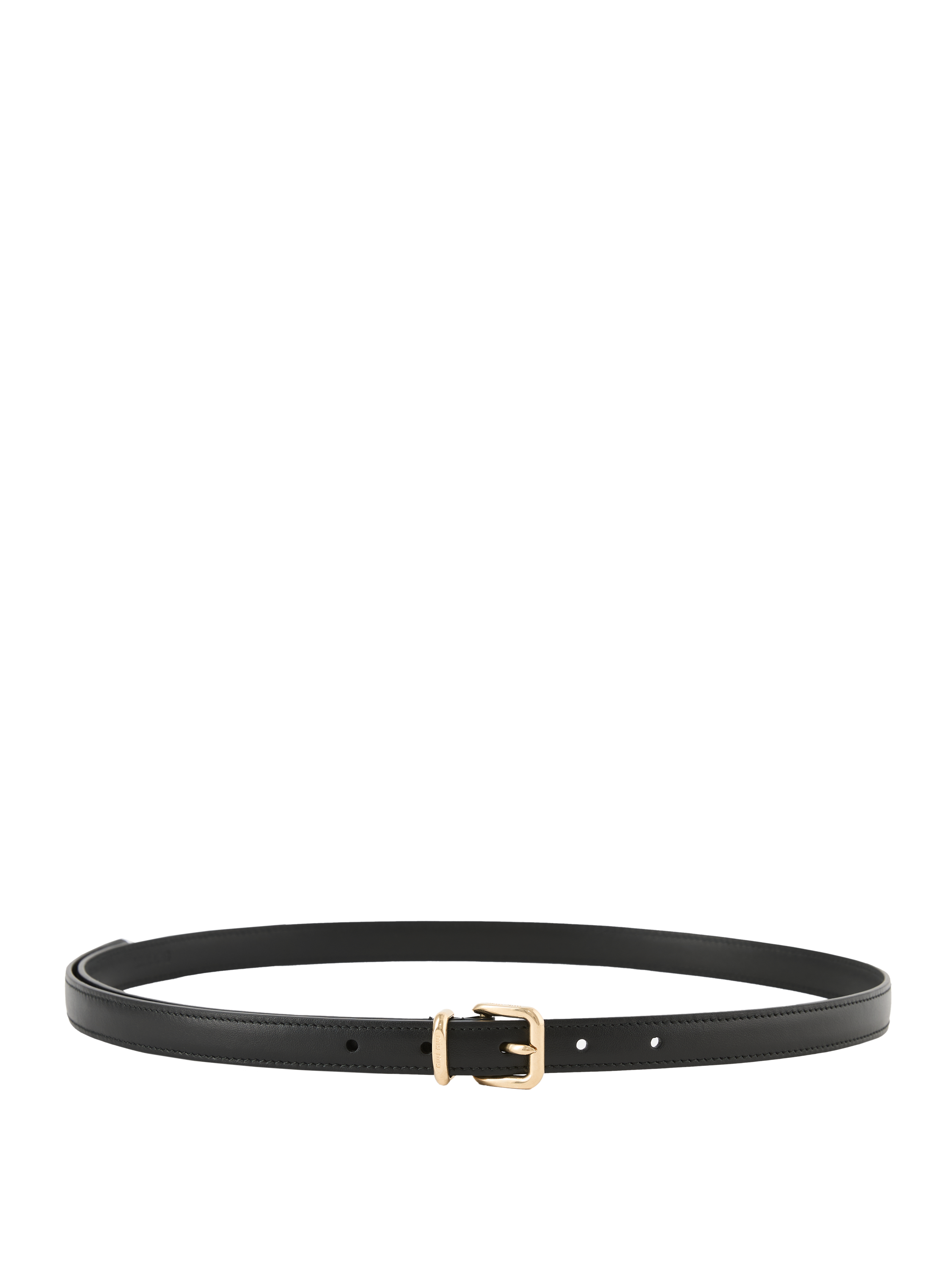 Dieser Gürtel in Schwarz von miu miu wurde aus hochwertigem Kalbsleder gefertigt und besticht durch die schmale Form. Die eckige Schnalle und der Metallring sind dezent mit dem Logo geprägt und verleihen dem Modell eine elegante, zeitlose Note.