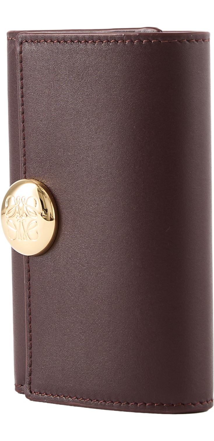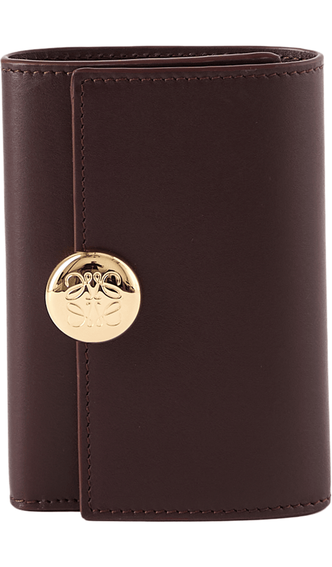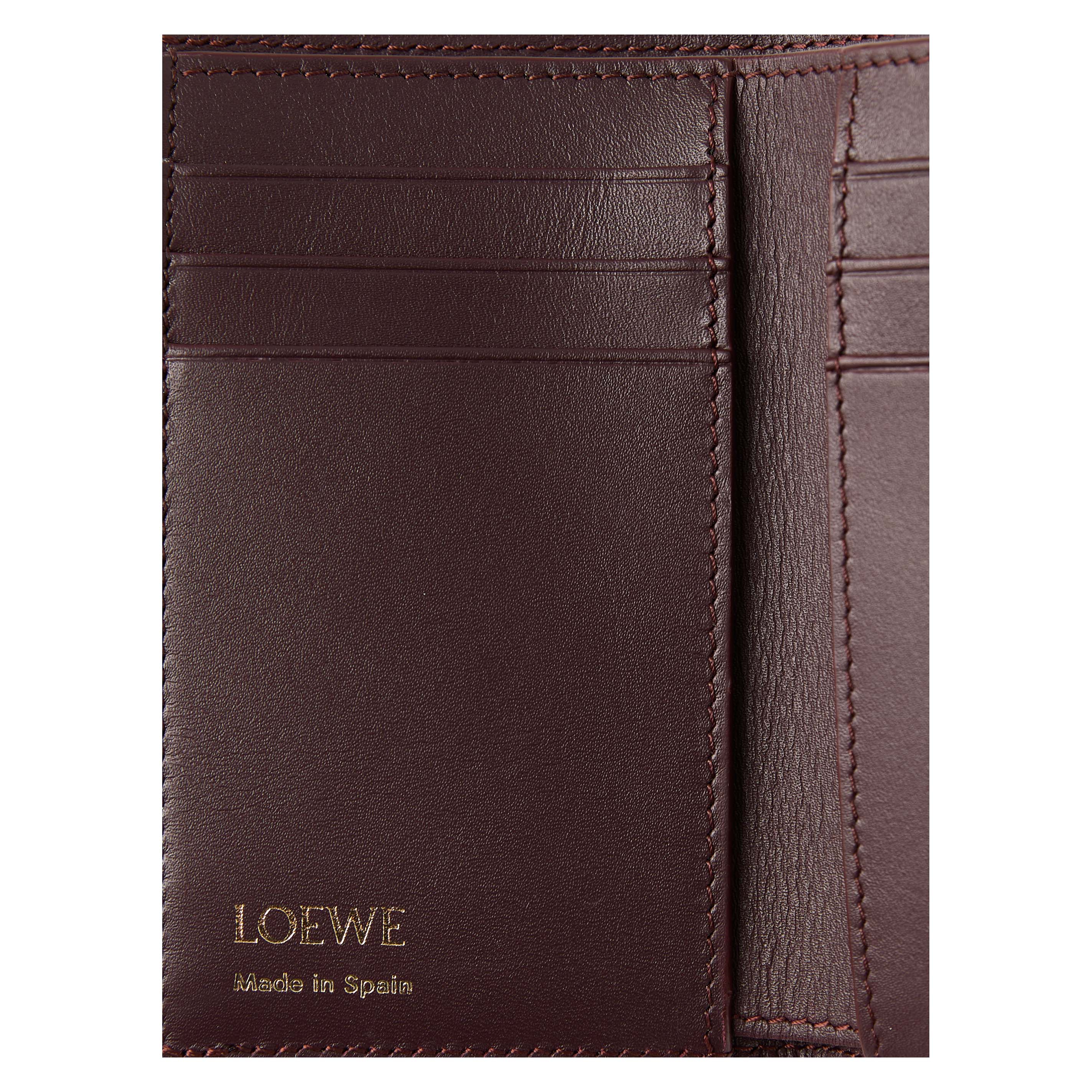 Die Geldbörse 'Pebble Small Vertical' in Burgundy von LOEWE wurde aus edlem Kalbsleder gefertigt und besticht durch den goldfarbenen Pebble-Verschluss mit dem geprägten Anagram. Mit einem großen Hauptfach, zwei kleineren Fächern, sechs Kartenfächern und einem Münzfach dient das Modell als funktionaler und stilvoller Begleiter im Alltag.