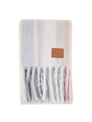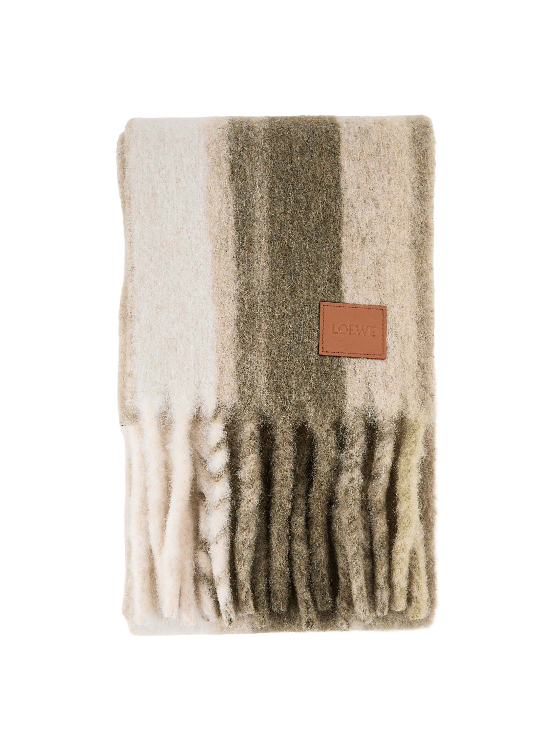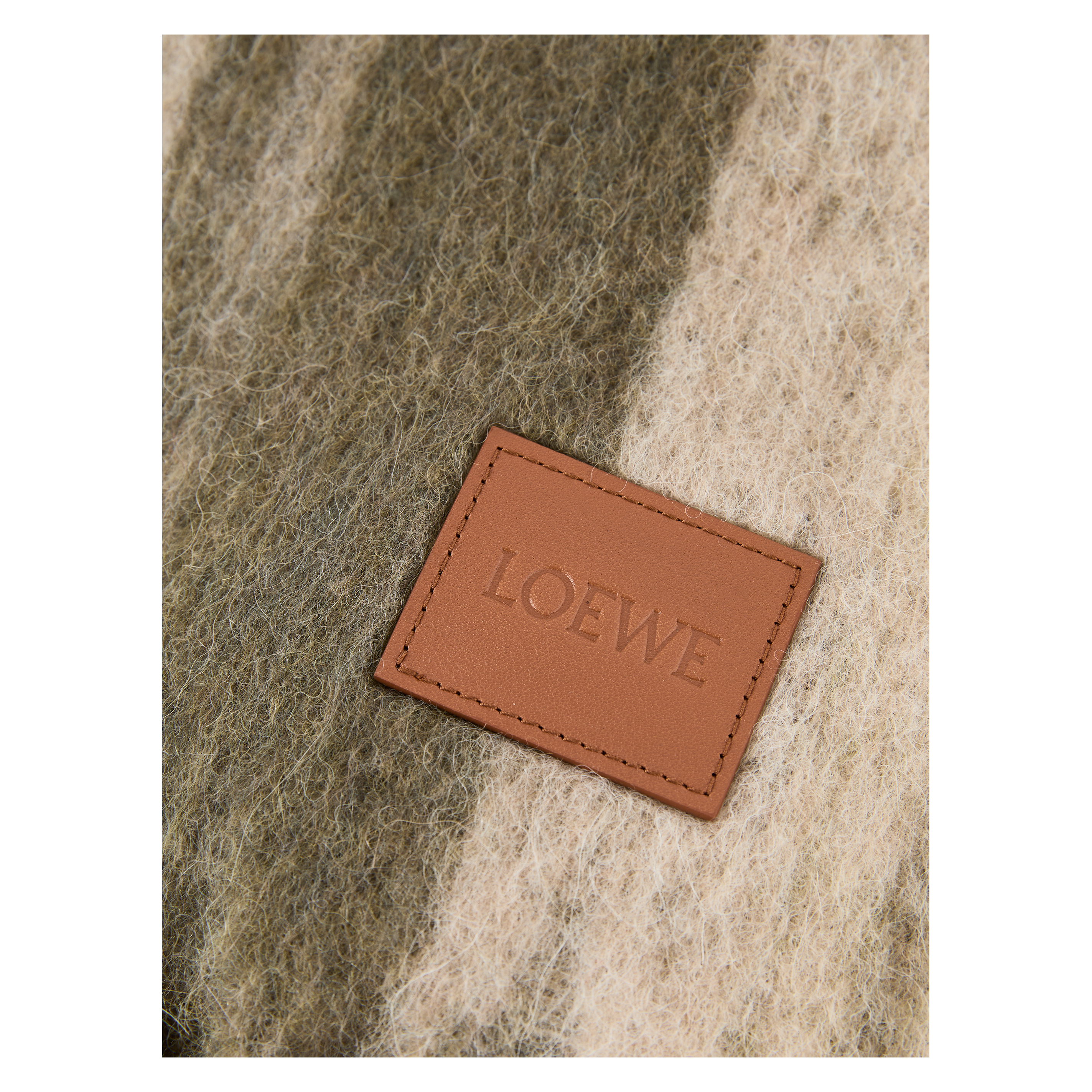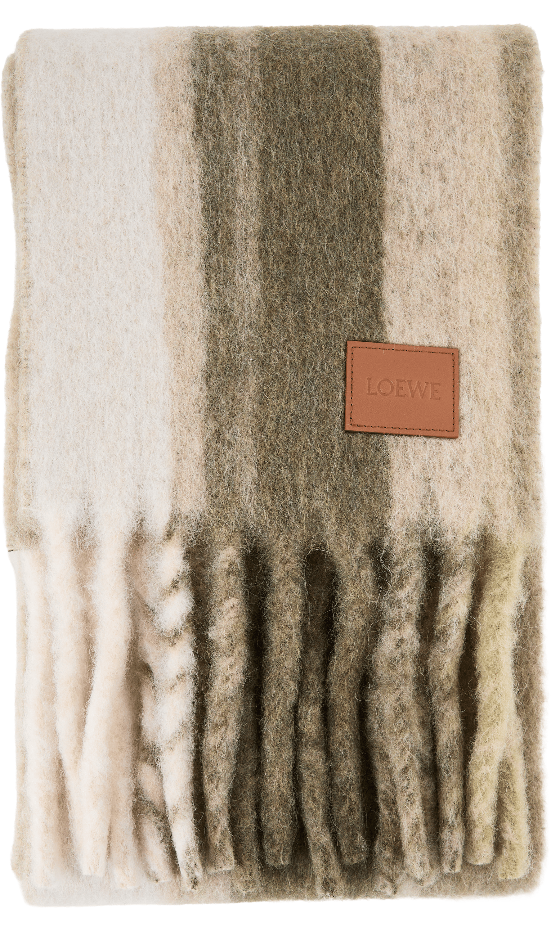 Dieser Schal in Crème von LOEWE wurde aus einer mittelschweren, gebürsteten Alpaka-Wollmischung gefertigt und besticht durch die weiche Haptik. Die mehrfarbigen Jacquard-Streifen, die klobigen Fransen an den Rändern sowie der LOEWE-Lederaufnäher mit Prägung an der Ecke setzen besondere Akzente. Der Schal kann auf verschiedene Weise getragen werden.