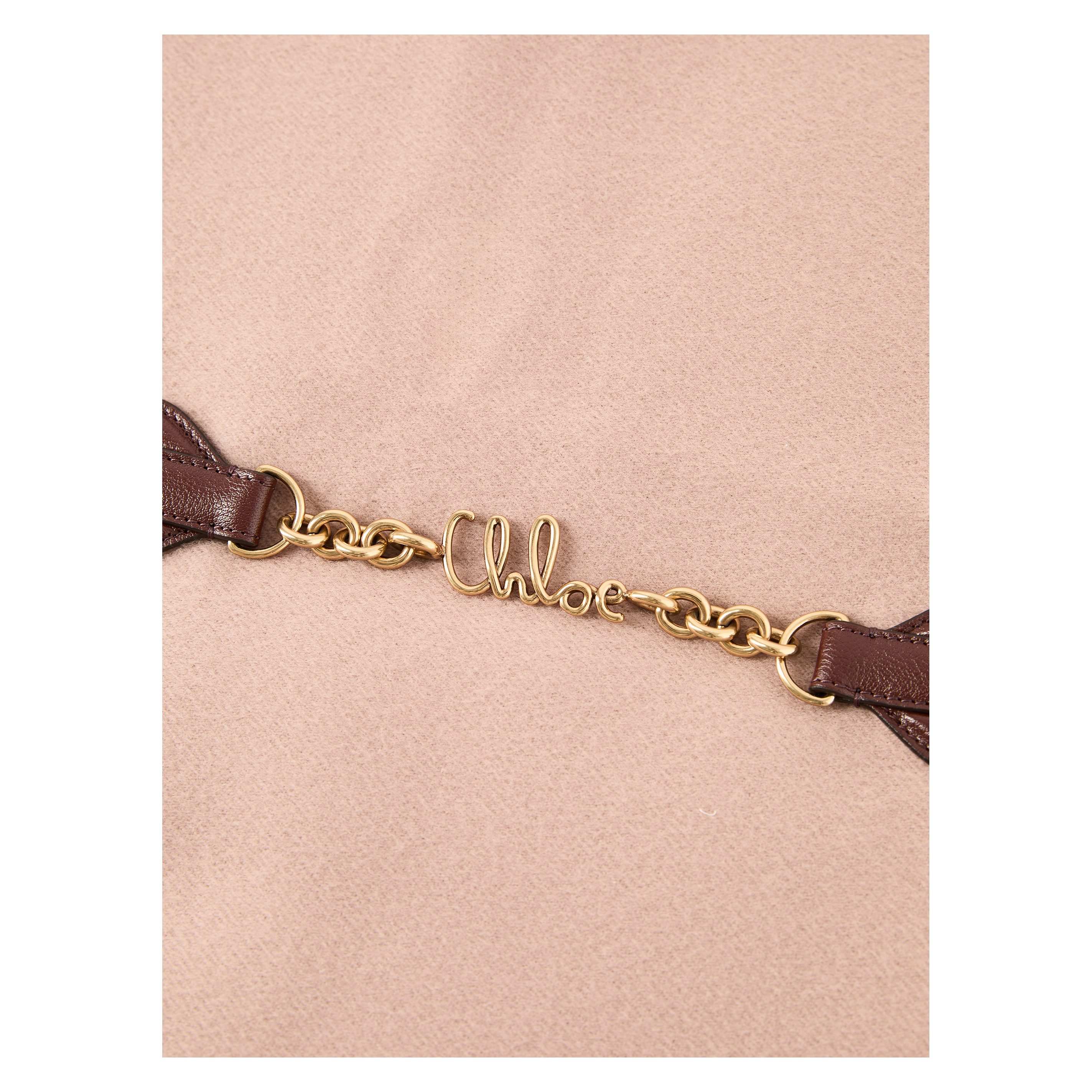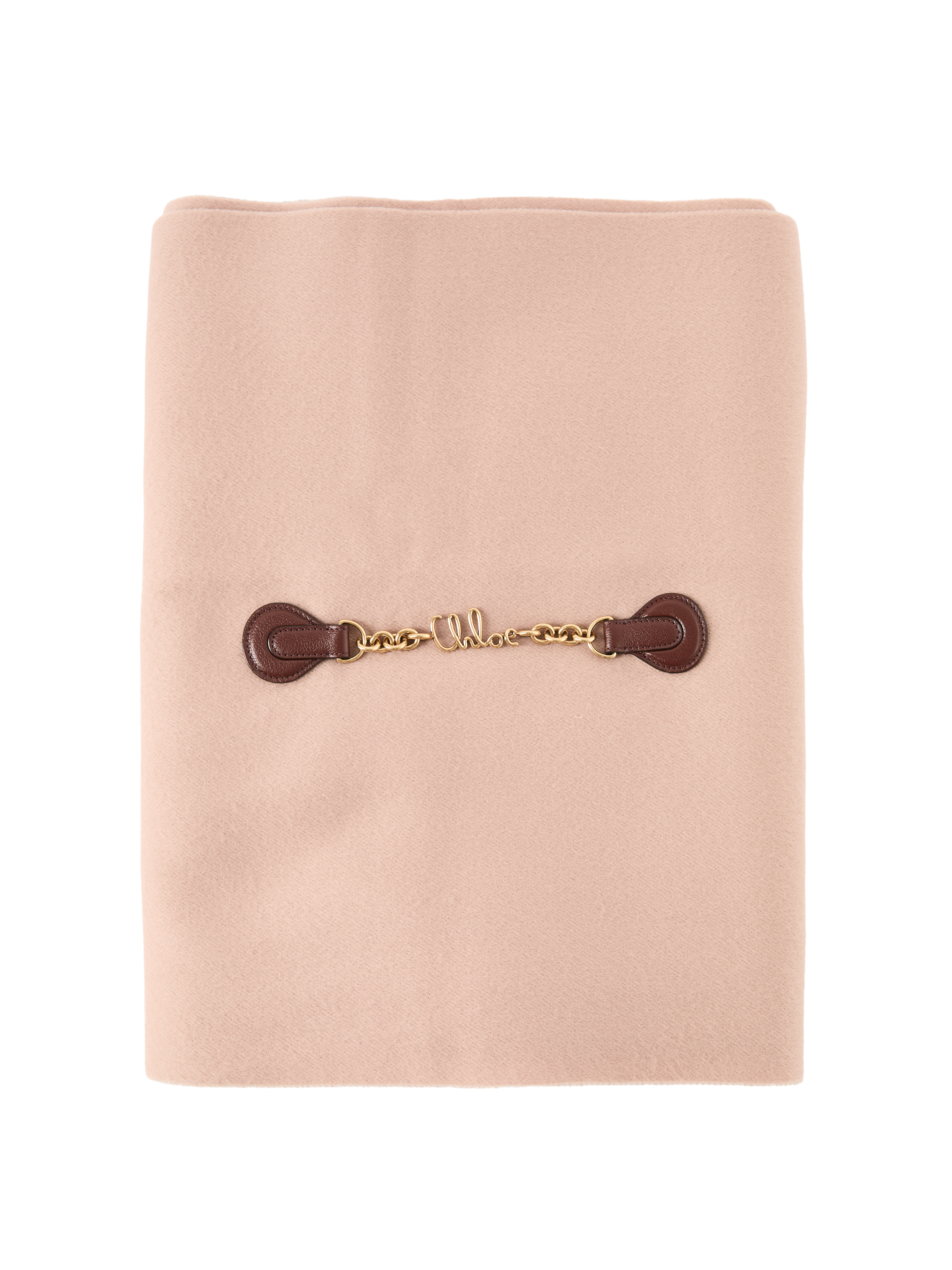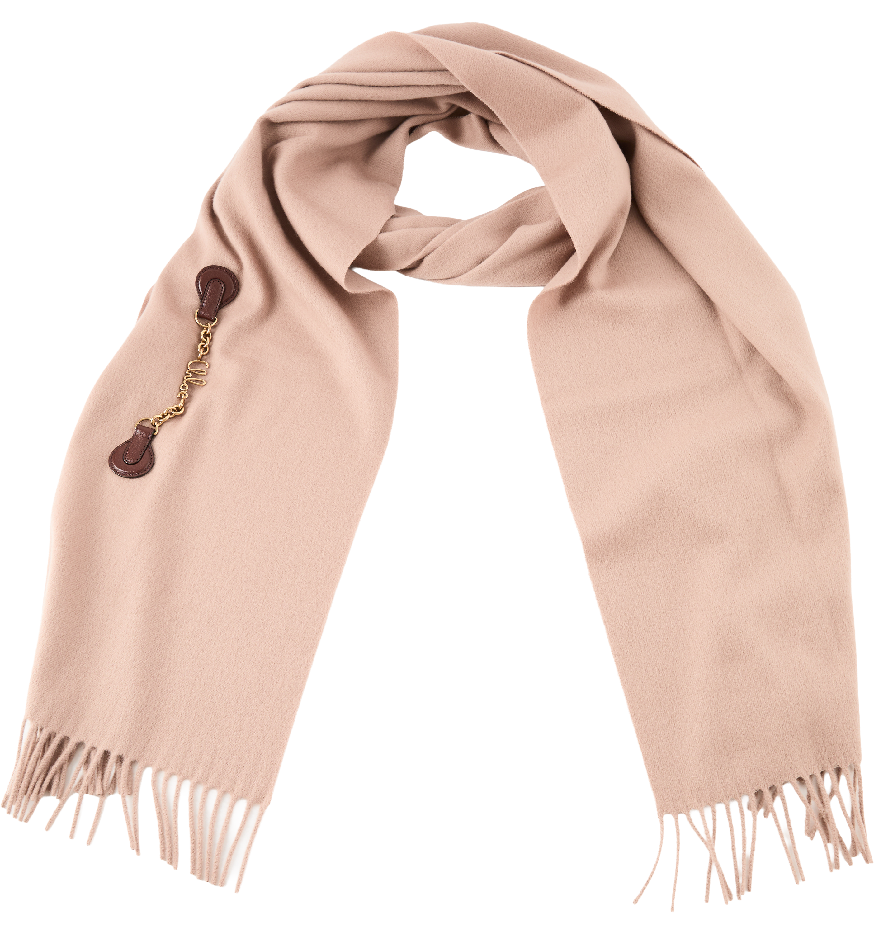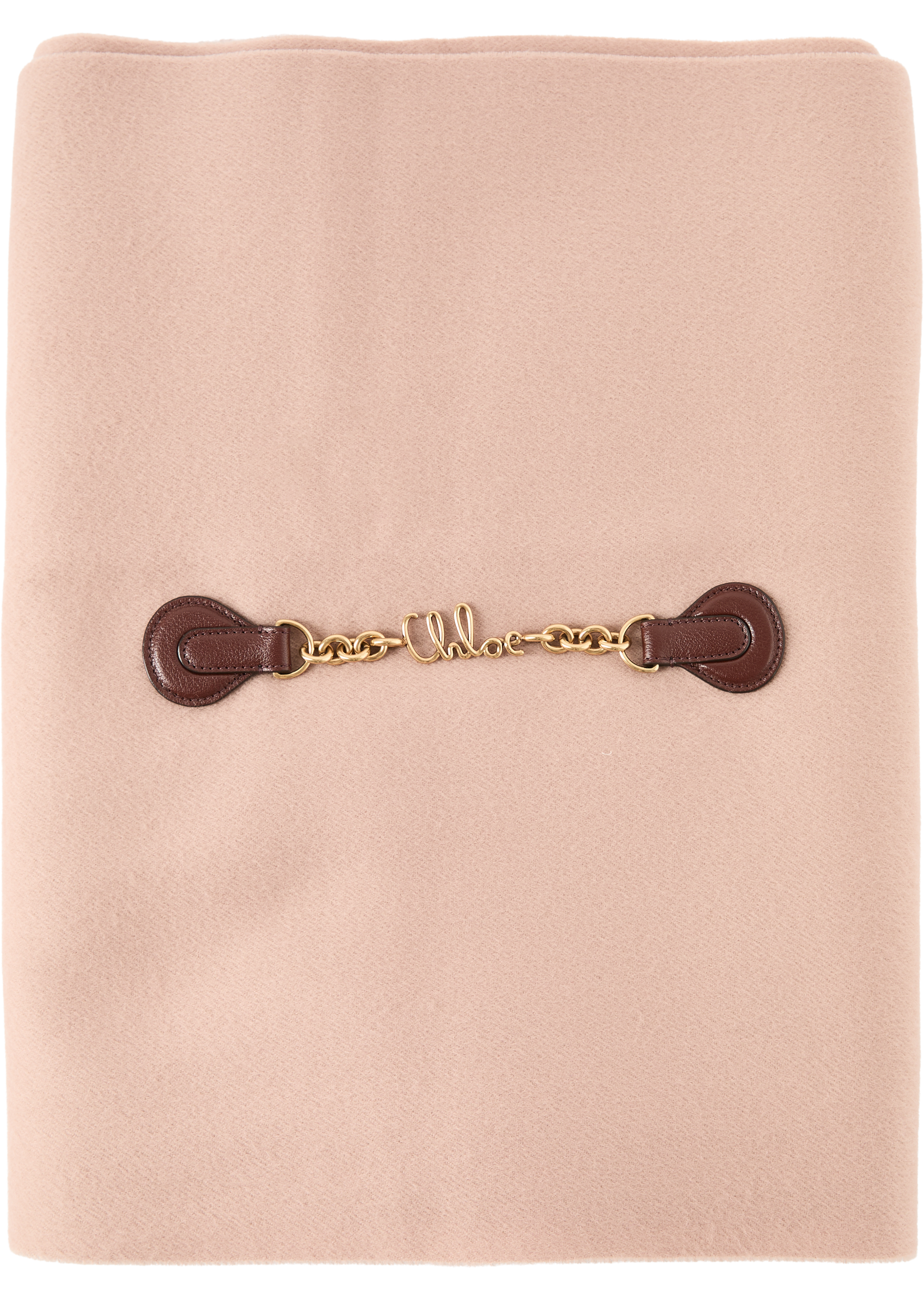 Der Schal 'Iconic' in Rosé von Chloé wurde aus weicher Schurwolle gefertigt und besticht durch den goldfarbenen Kettenverschluss mit ikonischem Marken-Schriftzug. Der Fransensaum verleiht dem Modell einen stilvollen Hingucker, während die weiche Haptik für besonderen Tragekomfort sorgt.