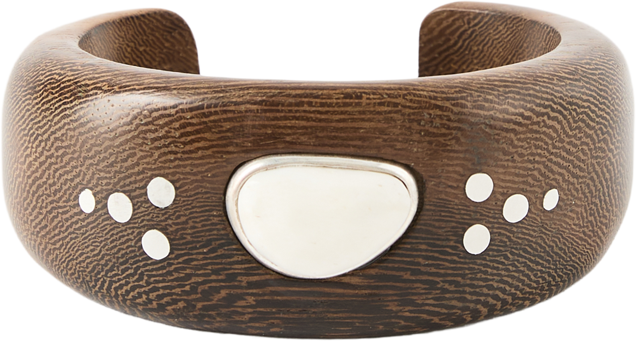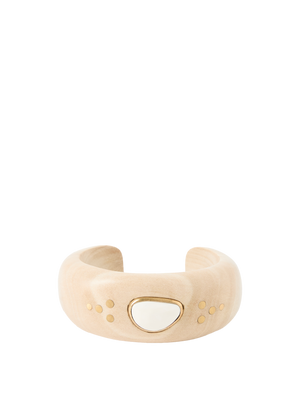 Der Armreifen 'Layla' in Braun/Silber von Isabel Marant wurde aus einer Holzmischung gefertigt und besticht durch die Manschettenform. Das Holz, das elegante Metalldekor sowie der facettierte Cabochon aus Büffelknochen verleihen dem Schmuckstück einen besonderen Charme.