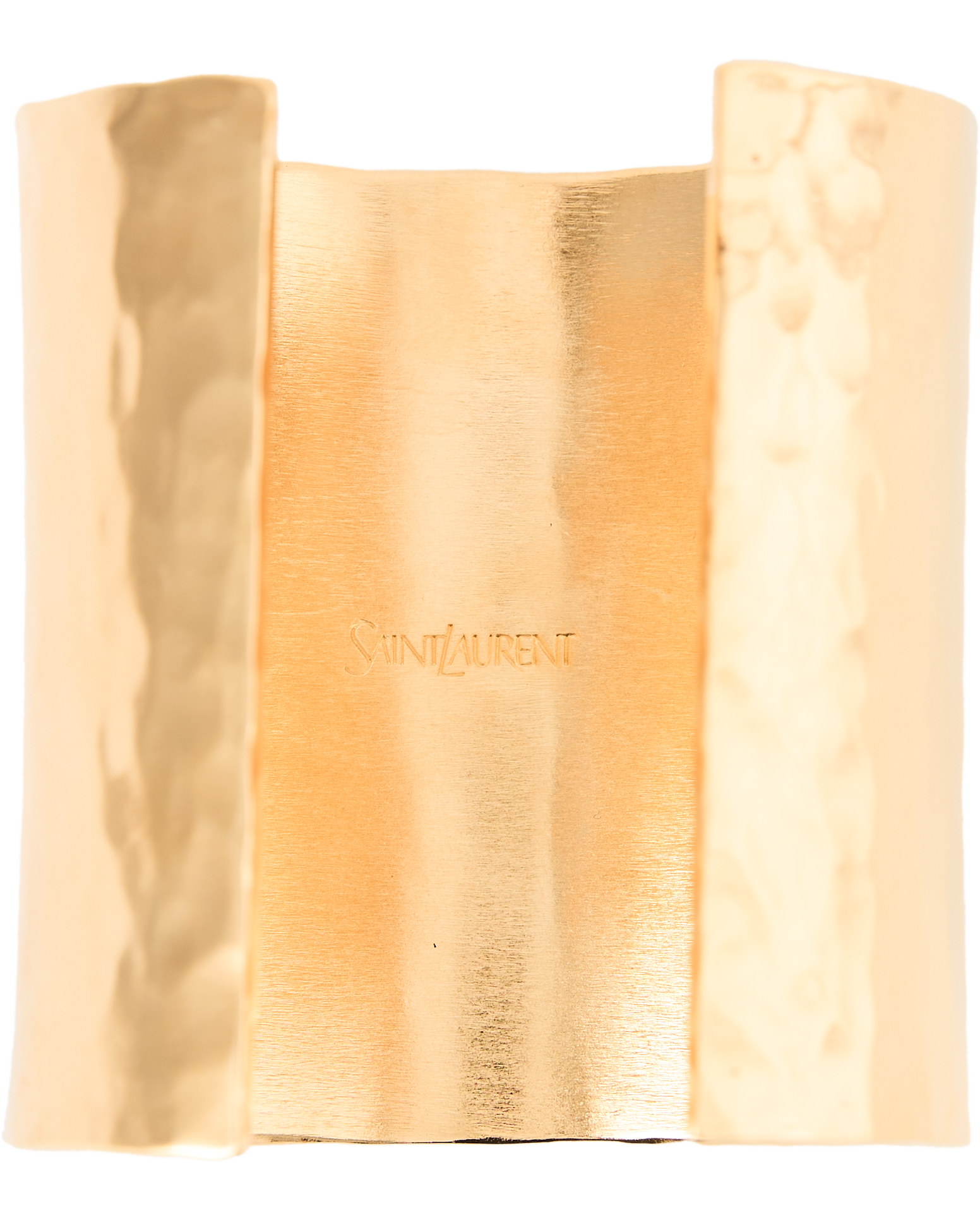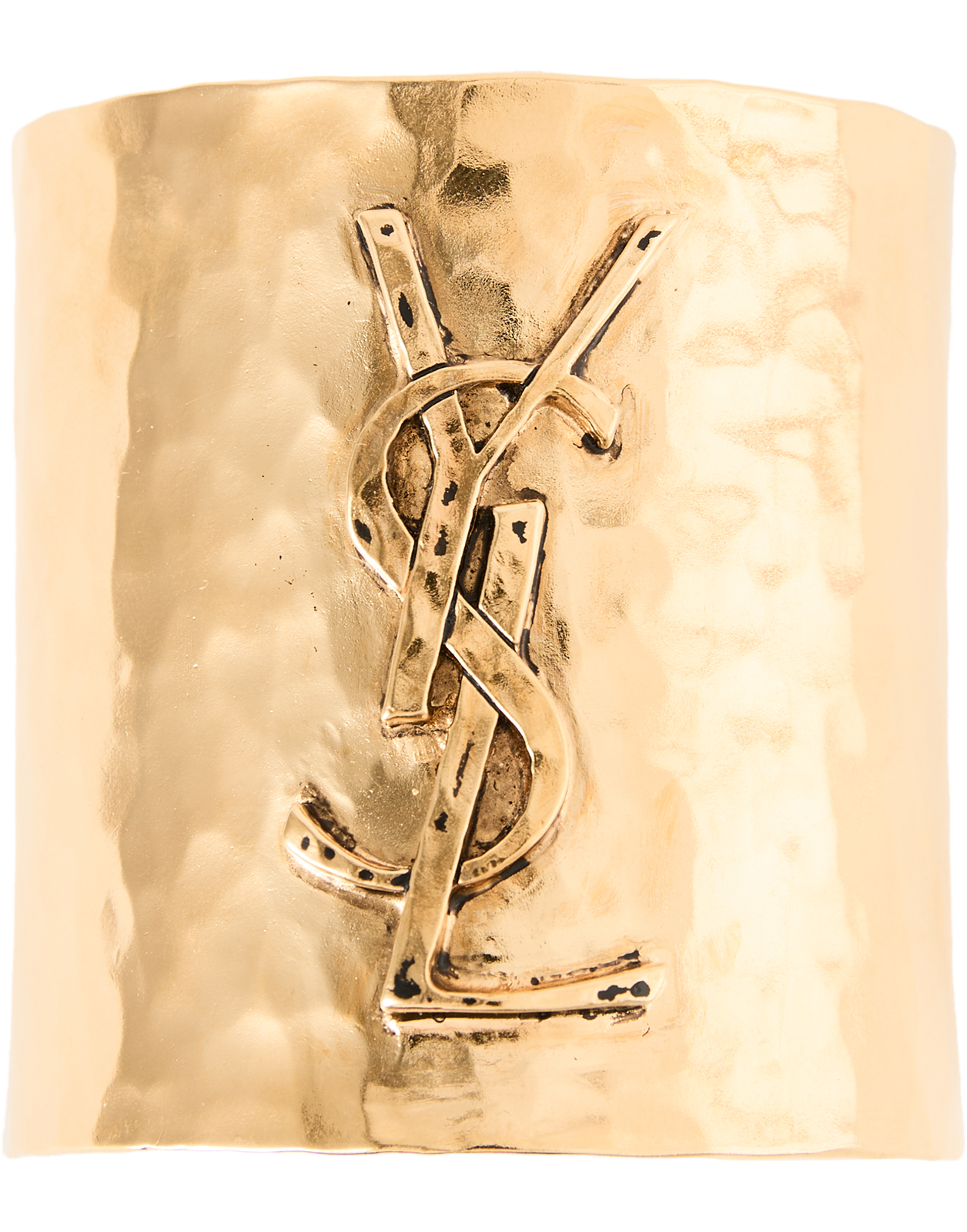 Dieser elegante Armreif von Saint Laurent ist aus Messing mit einem edlen Goldfinish gefertigt und besticht durch das eingehämmerte 'YSL' Logo. Durch die breite Passform wird er stilvoll abgerundet.