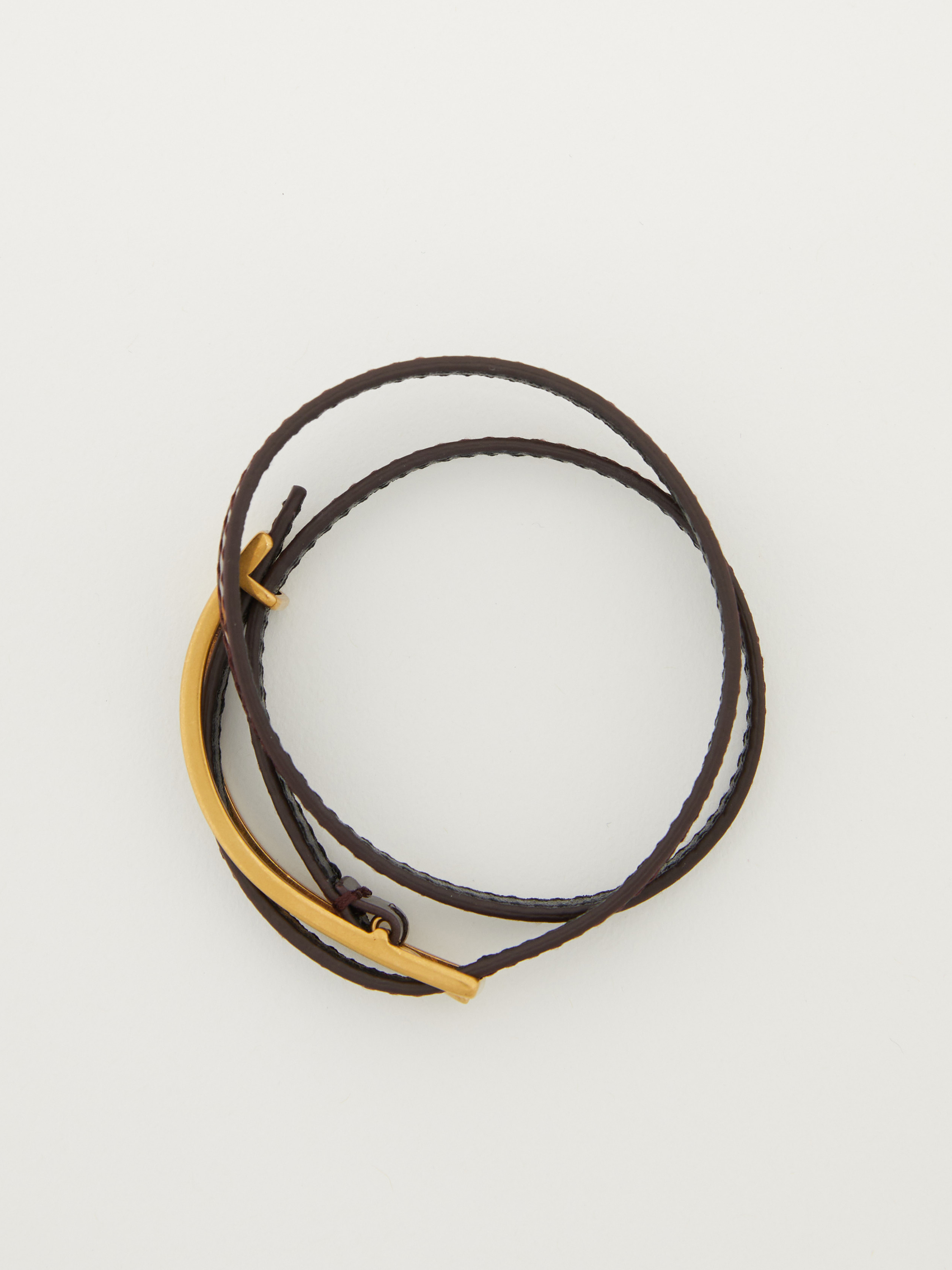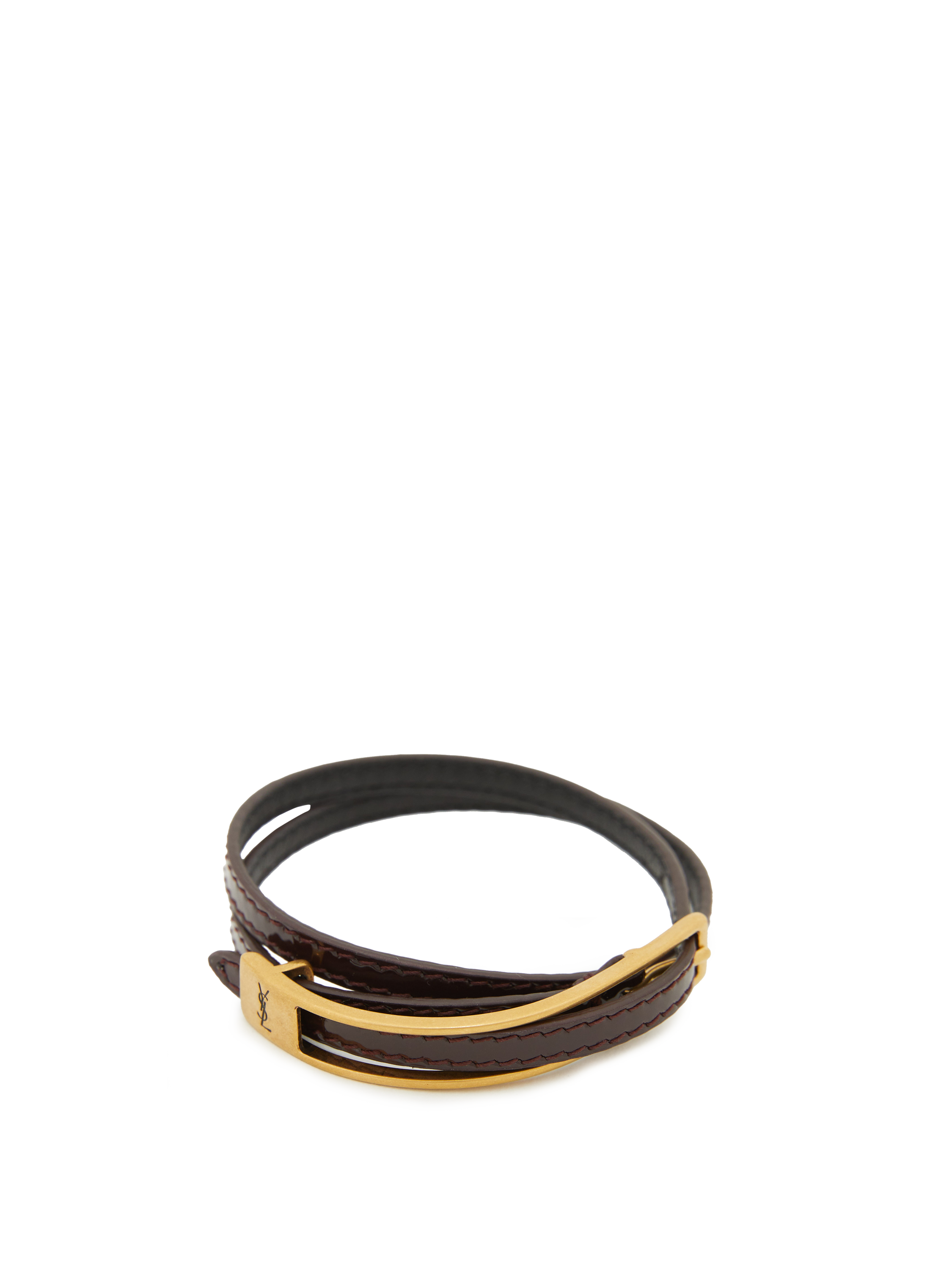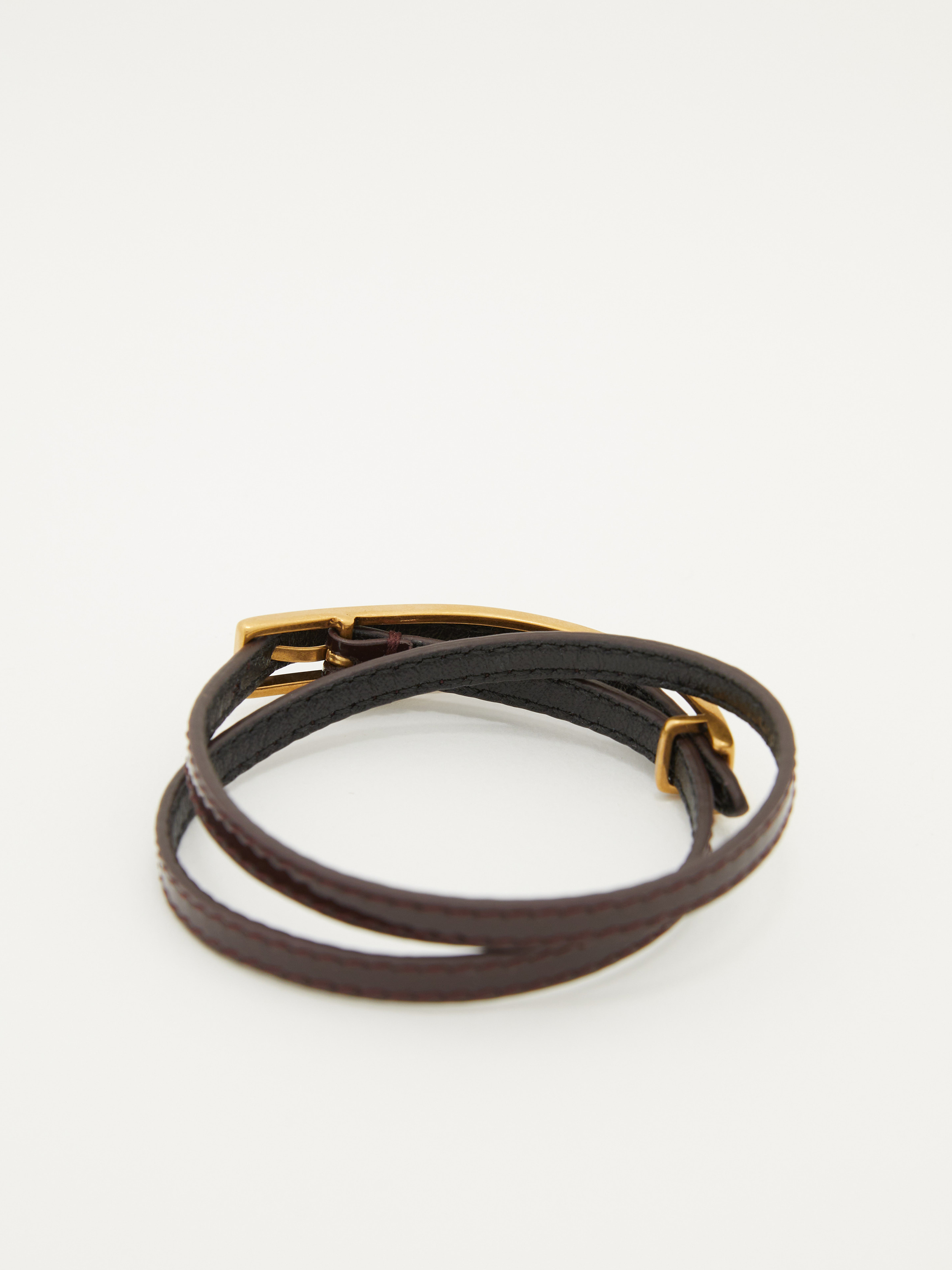 Dieses dünne, doppelt gewickelte Gürtelarmband in Lackleder-Optik wurde aus Kalbsleder gefertigt. Es besticht durch eine längliche, geschwungene, rechteckige Dornschließe mit der Gravur Cassandre.