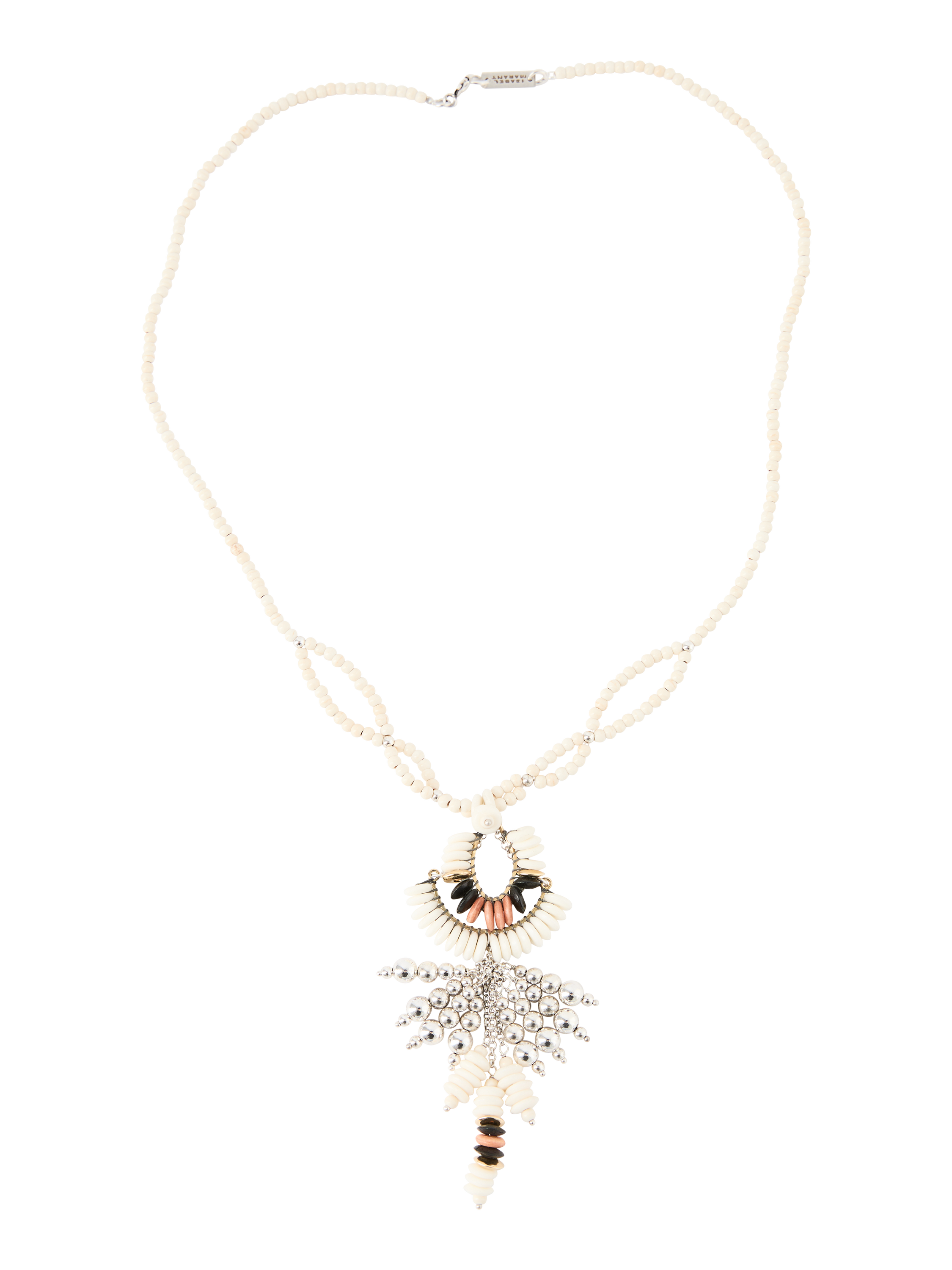 Diese Halskette in Silber von Isabel Marant wurde aus hochwertigen Materialien gefertigt. Der gestufte Anhänger aus Perlen sowie silberfarbenen Quasten und das auf der Innenseite gravierte Isabel-Marant-Logo verleihen dem Schmuckstück eine besondere, detailreiche Ausstrahlung.
