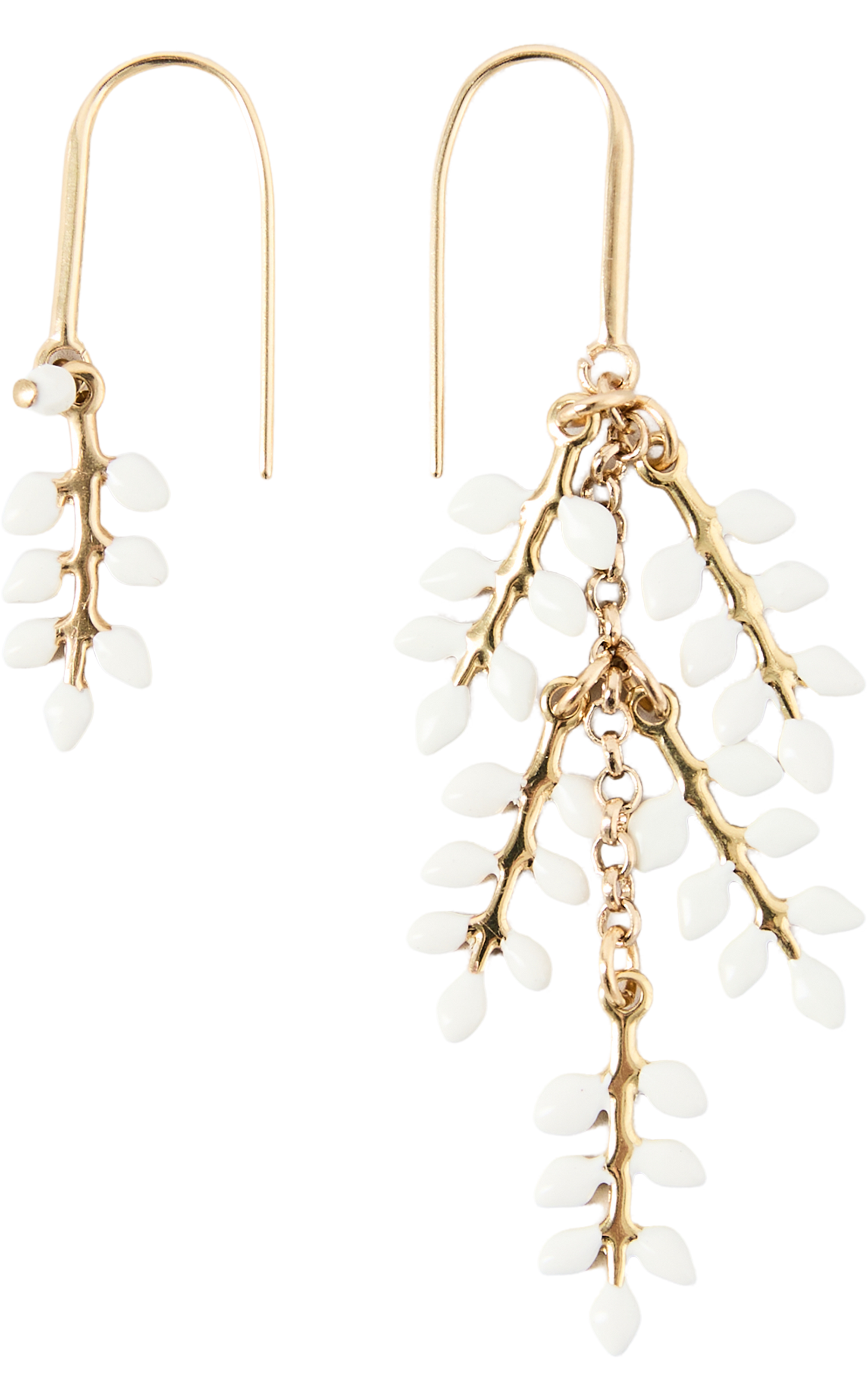 Diese Ohrringe in Crème/Gold von Isabel Marant wurden aus Messing und Harz gefertigt und besticht durch die asymmetrische Form. Im Stil eines pflanzlichen Zweiges gestaltet und mit elliptischen „Blättern“ verziert, rundet die Isabel Marant-Gravur auf der Rückseite dieses Modell elegant ab.