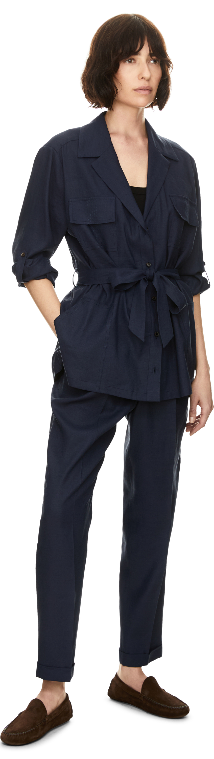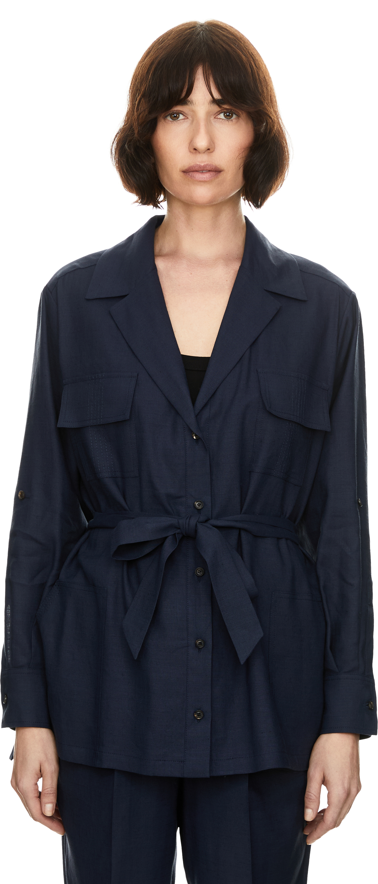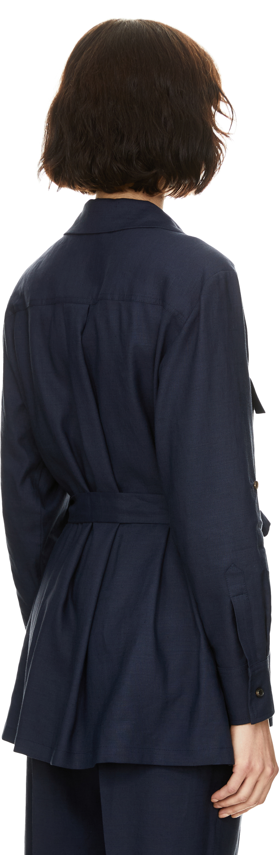 Diese Bluse in Marineblau von Kiton wurde aus einer Leinenmischung gefertigt und besticht durch den abnehmbaren Bindegürtel, der für eine schmeichelhafte Silhouette sorgt. Der Reverskragen und zwei Brusttaschen mit Patten setzen stilvolle Akzente und zeichnen das elegante Modell aus.