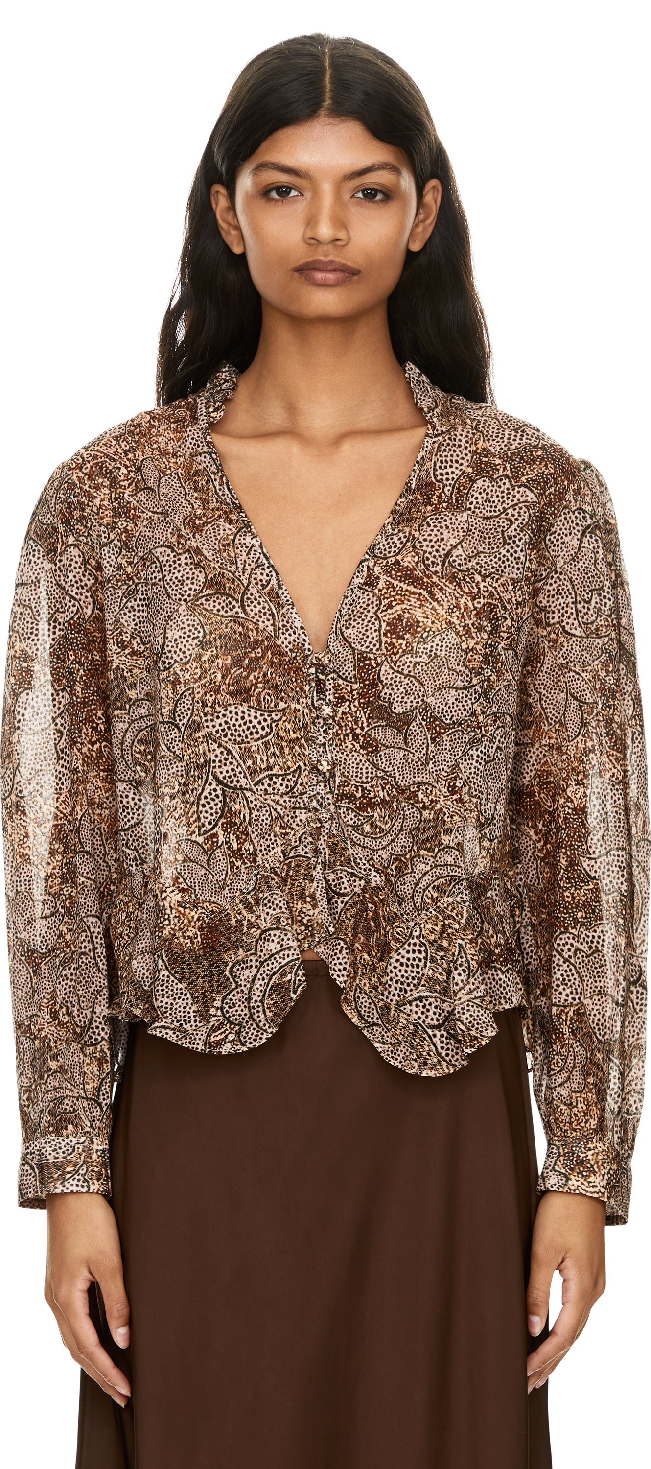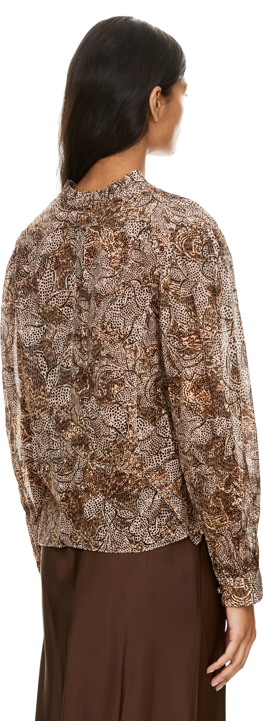 Die Bluse 'Celeny' in Braun von Isabel Marant wurde aus leichtem Baumwollvoile gefertigt und besticht durch die verspielten Volants am Saum. Der tiefe V-Ausschnitt wird von einer stoffbezogenen Knopfleiste auf der Vorderseite ergänzt. Die verstellbare Taille mit dezenten Knöpfen am Rücken lässt sich wahlweise als lockeres oder feminines, tailliertes Design tragen und verleiht dem Modell eine raffinierte Note.
