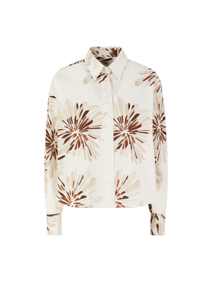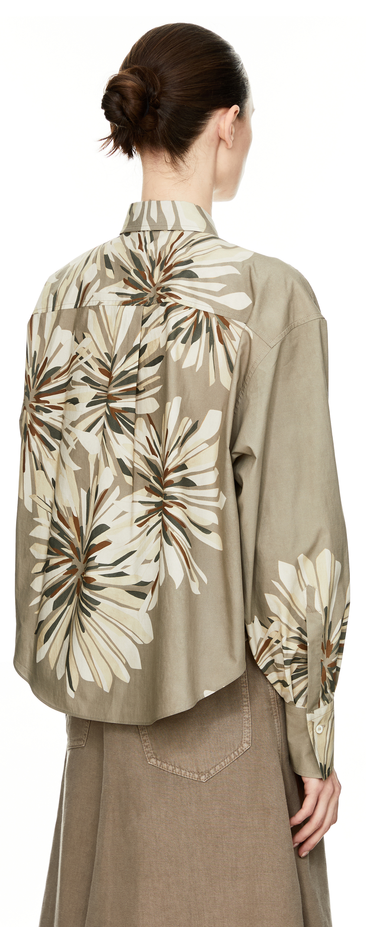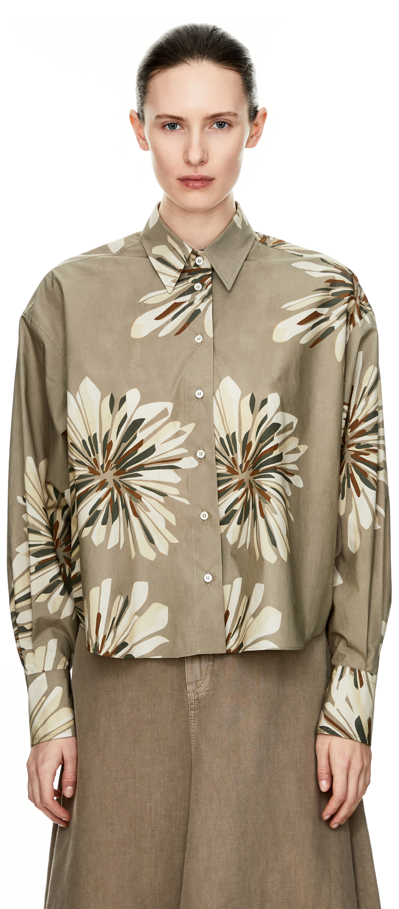 Diese Bluse in Khaki von Brunelo Cucinelli wurde aus reiner Baumwolle gefertigt und besticht durch das florale Muster. Die lockere Passform, der verkürzte Schnitt und die frontale Knopfleiste definieren dieses edle Stück.