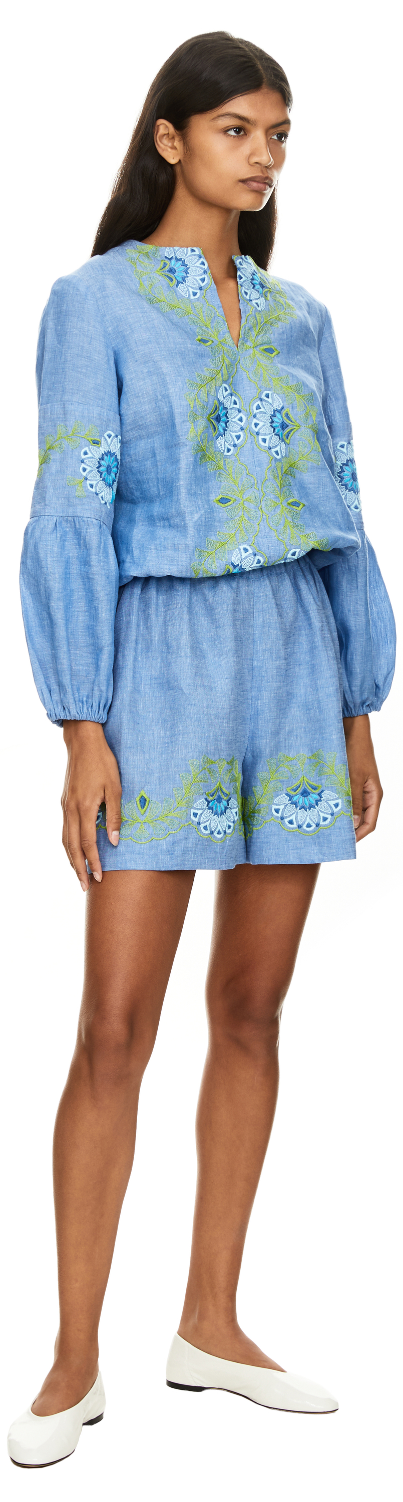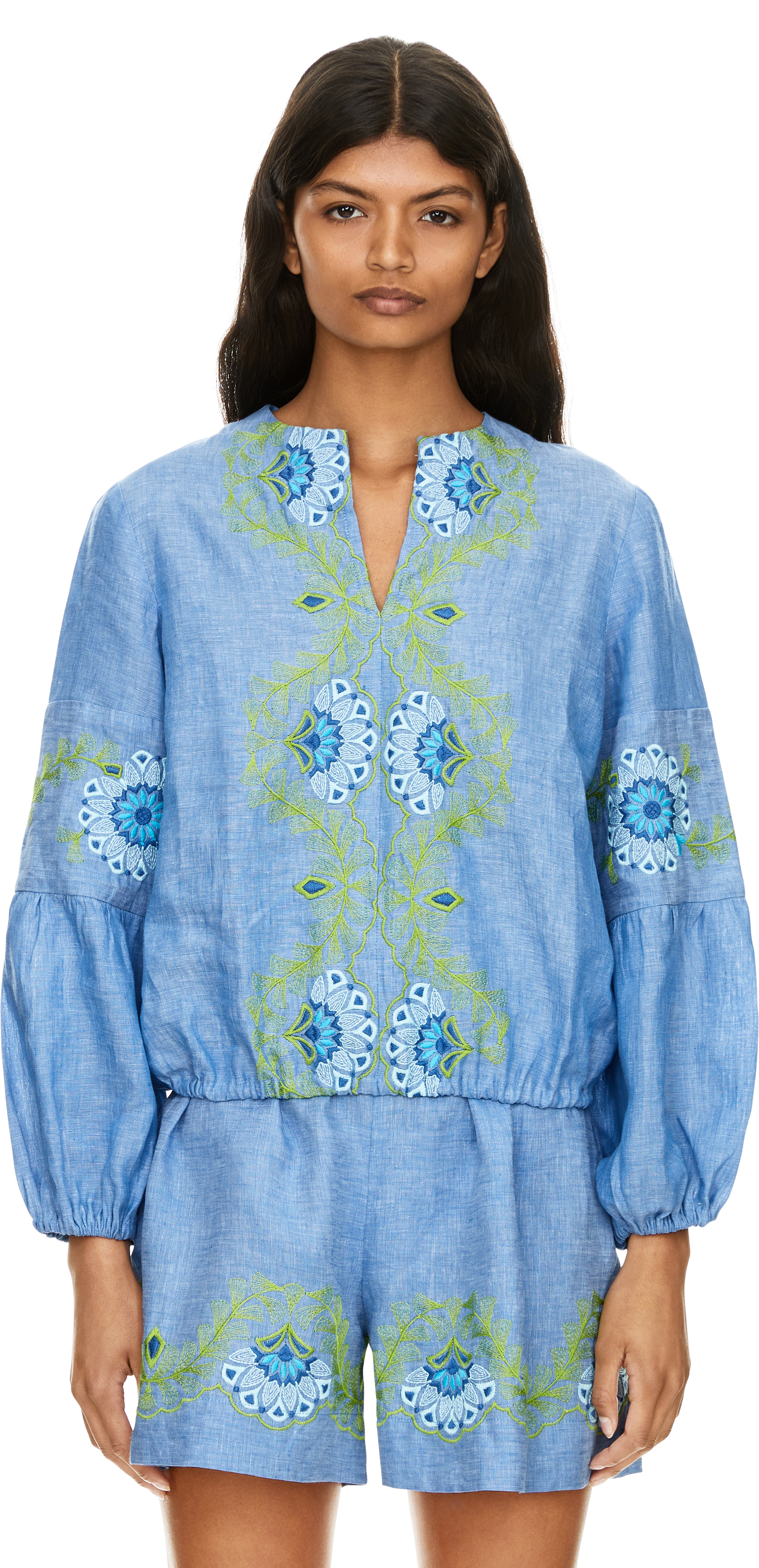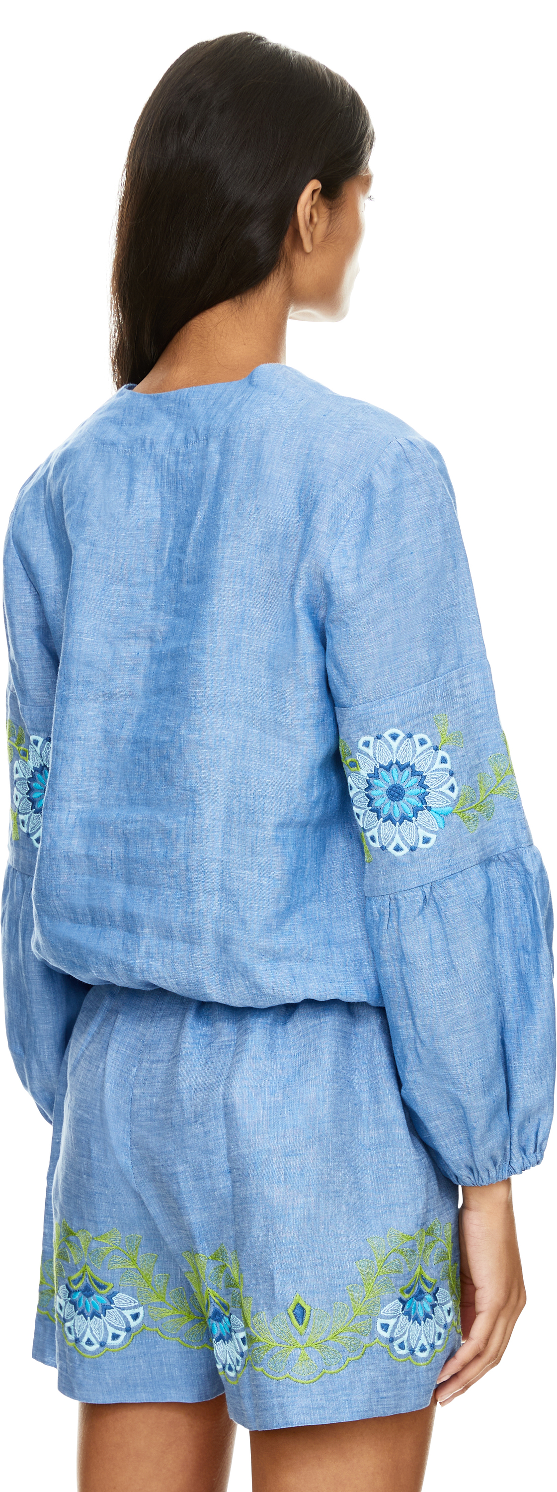 Florale Bluse 'Pepe' mit Stickerei aus Leinen Blau