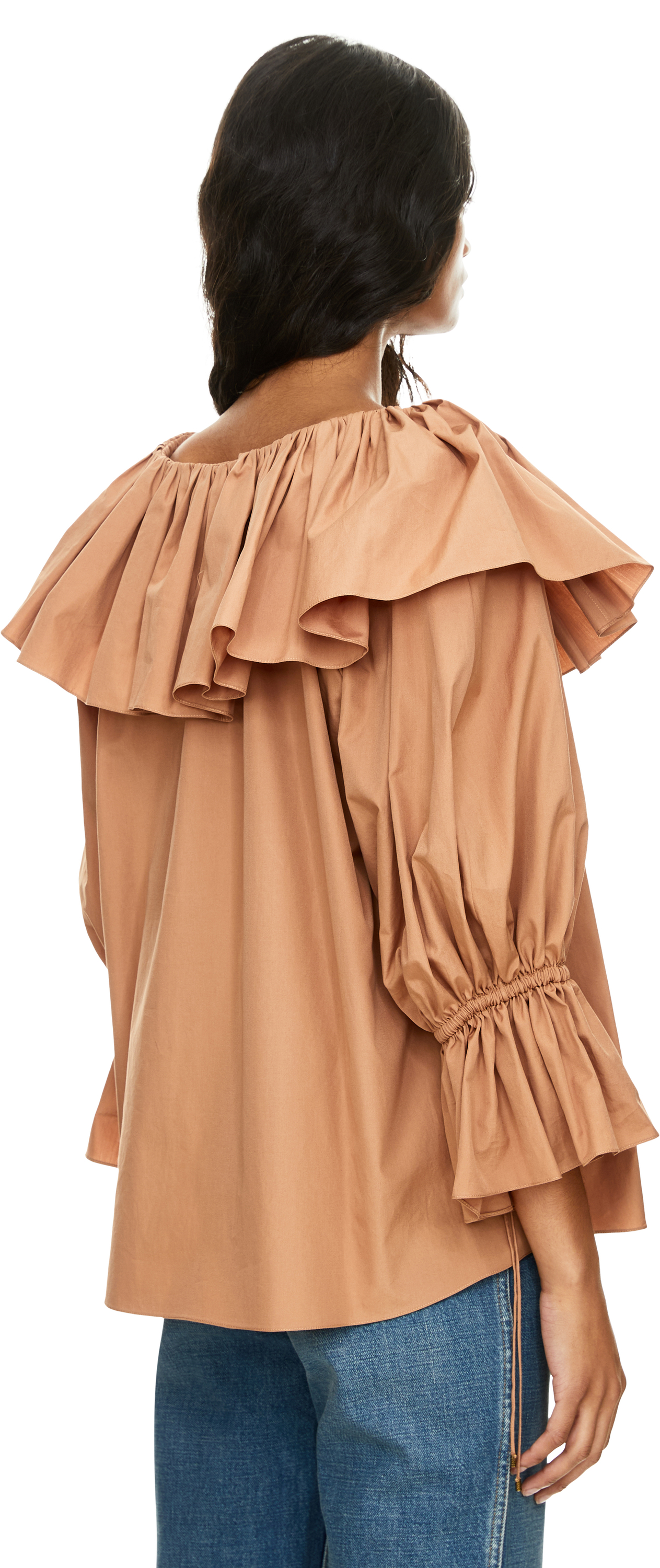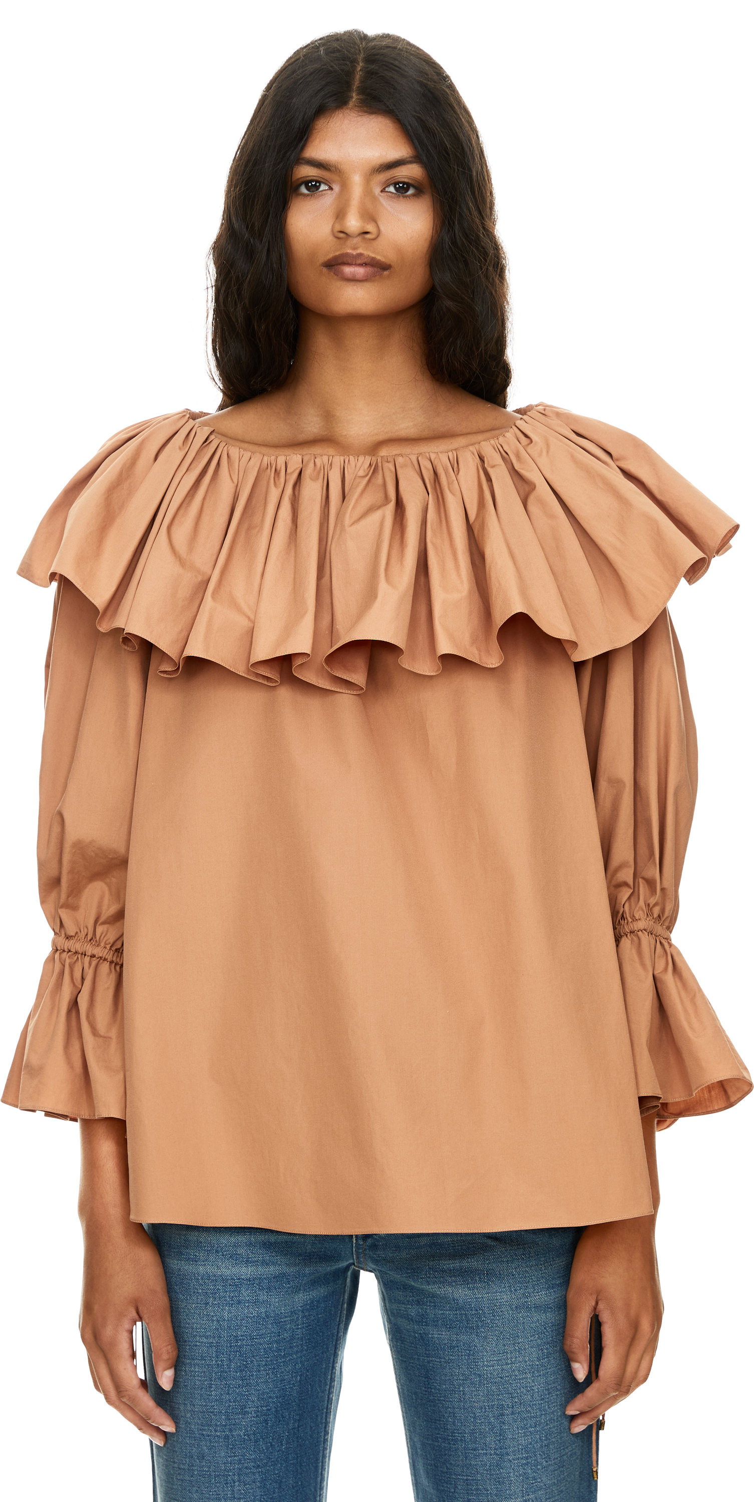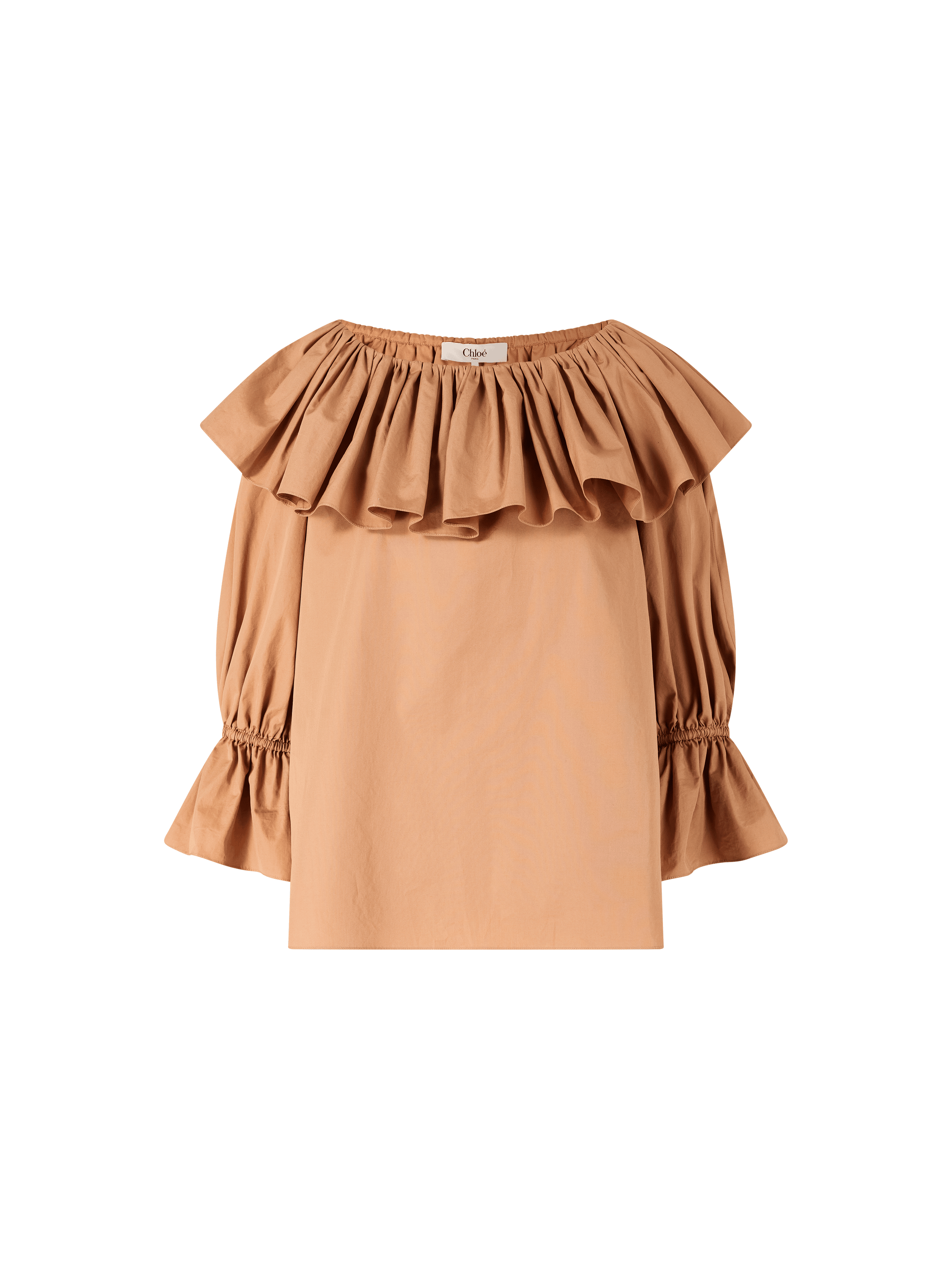Diese Bluse in Braun von Chloé wurde aus reiner Baumwolle gefertigt und besticht durch ihre fließende Silhouette. Der geraffte U-Boot-Ausschnitt wird von einer großen Rüsche verziert, während die gerafften 3/4-Ärmel mit Bindebändern die feminine, lockere Passform unterstreichen.
