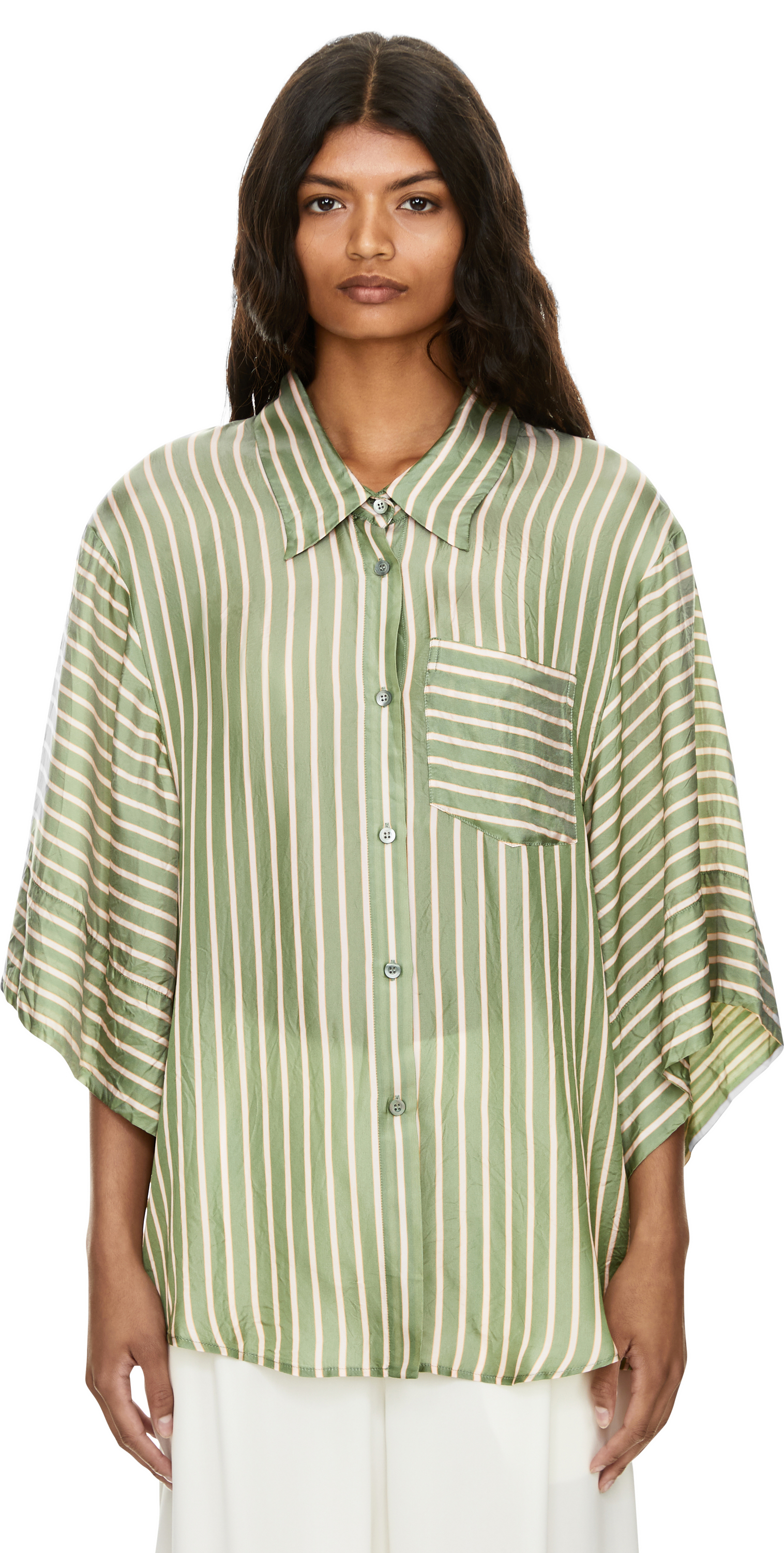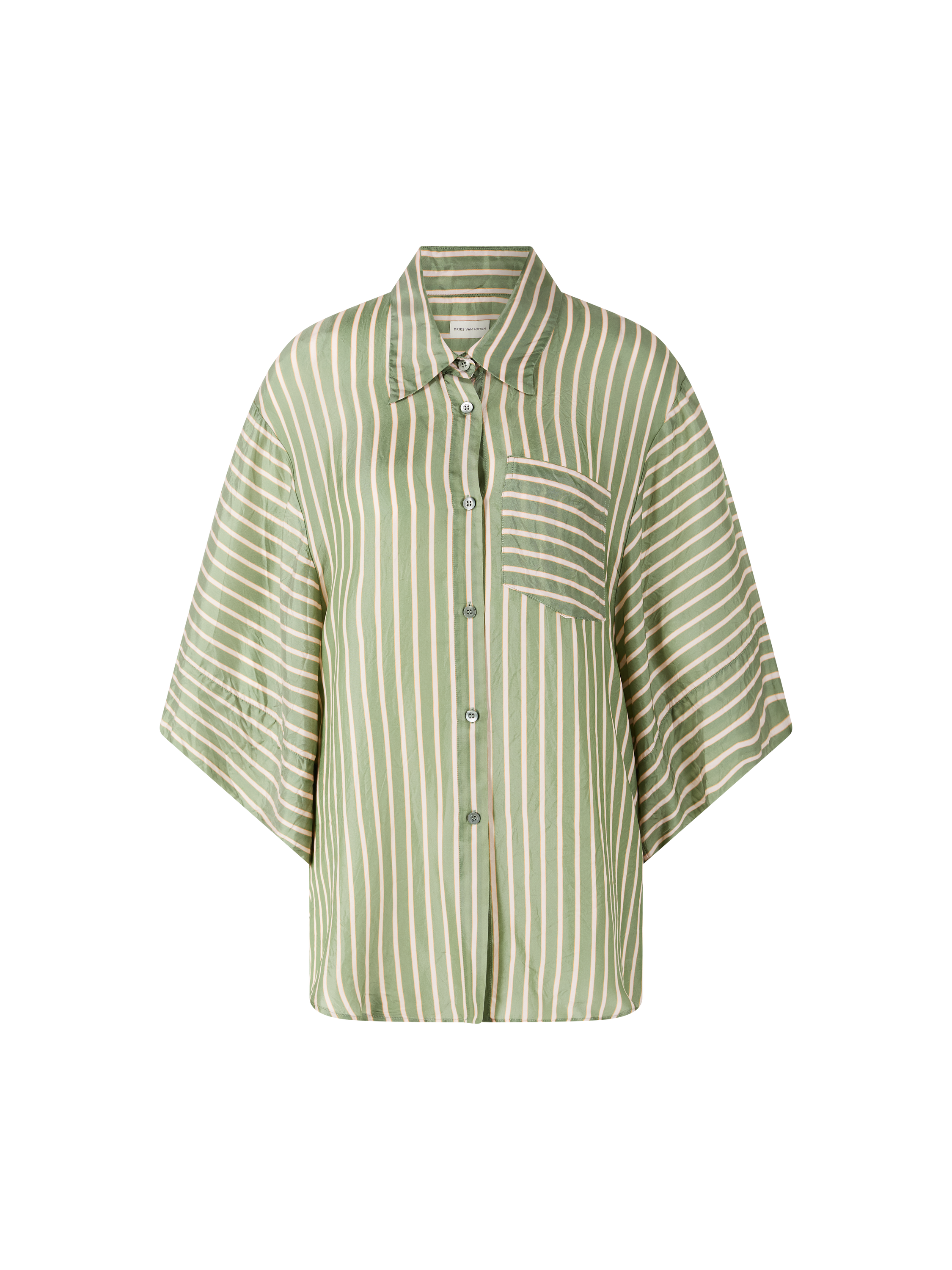 Das Hemd 'Clea' in Grün von Dries van Noten wurde aus Cupro gefertigt und besticht durch die seidige Haptik. Der klassische Kragen, die 3/4-Ärmel, die durchgehende Knopfleiste sowie die aufgesetzte Brusttasche prägen das leichte Design.