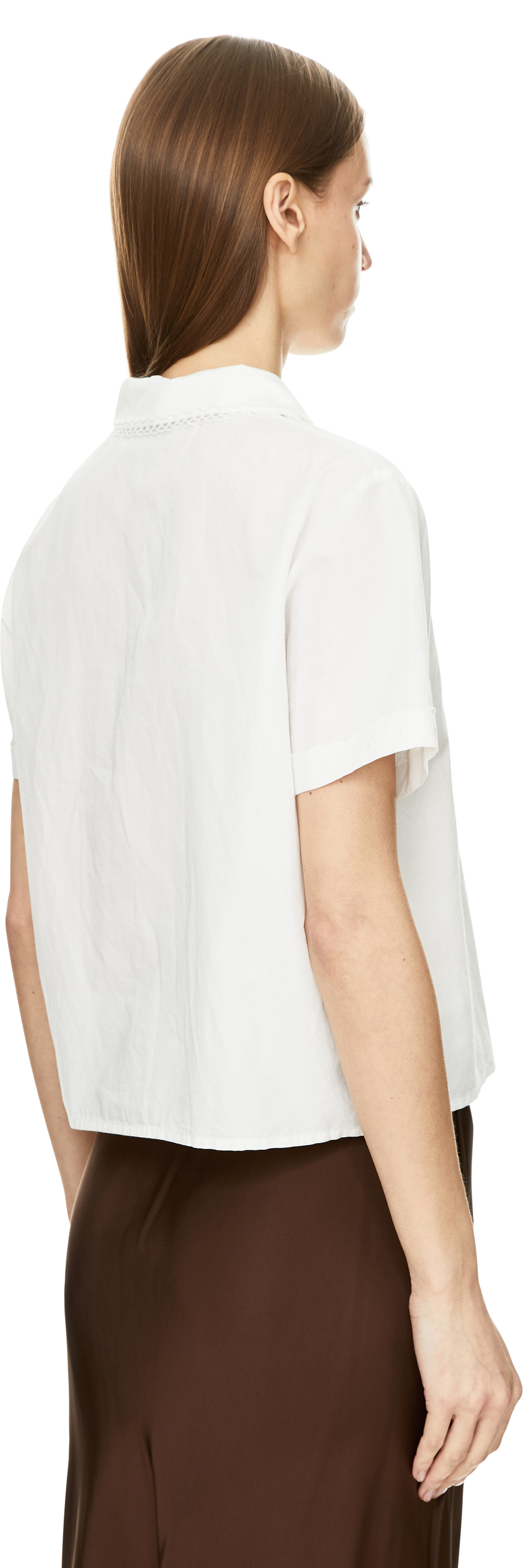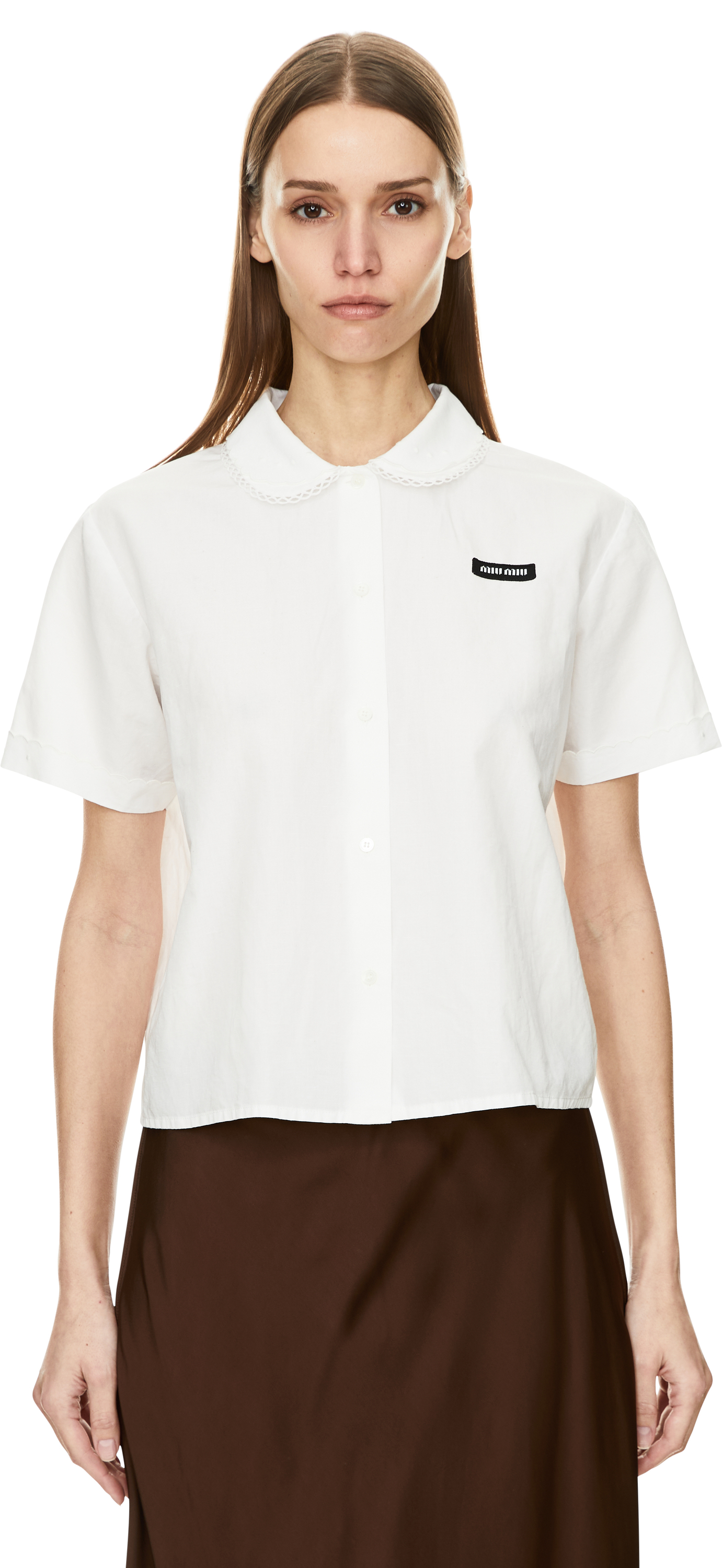 Diese Bluse in Weiß von Miu Miu wurde aus einer hochwertigen Baumwoll-Leinenmischung gefertigt und besticht durch das gestrickte Logo-Etikett im Brustbereich. Der Bubikragen mit feiner Stickerei sowie Armbündchen mit Klöppelspitze verleihen dem Modell verspielte Details und prägen das raffinierte Design.