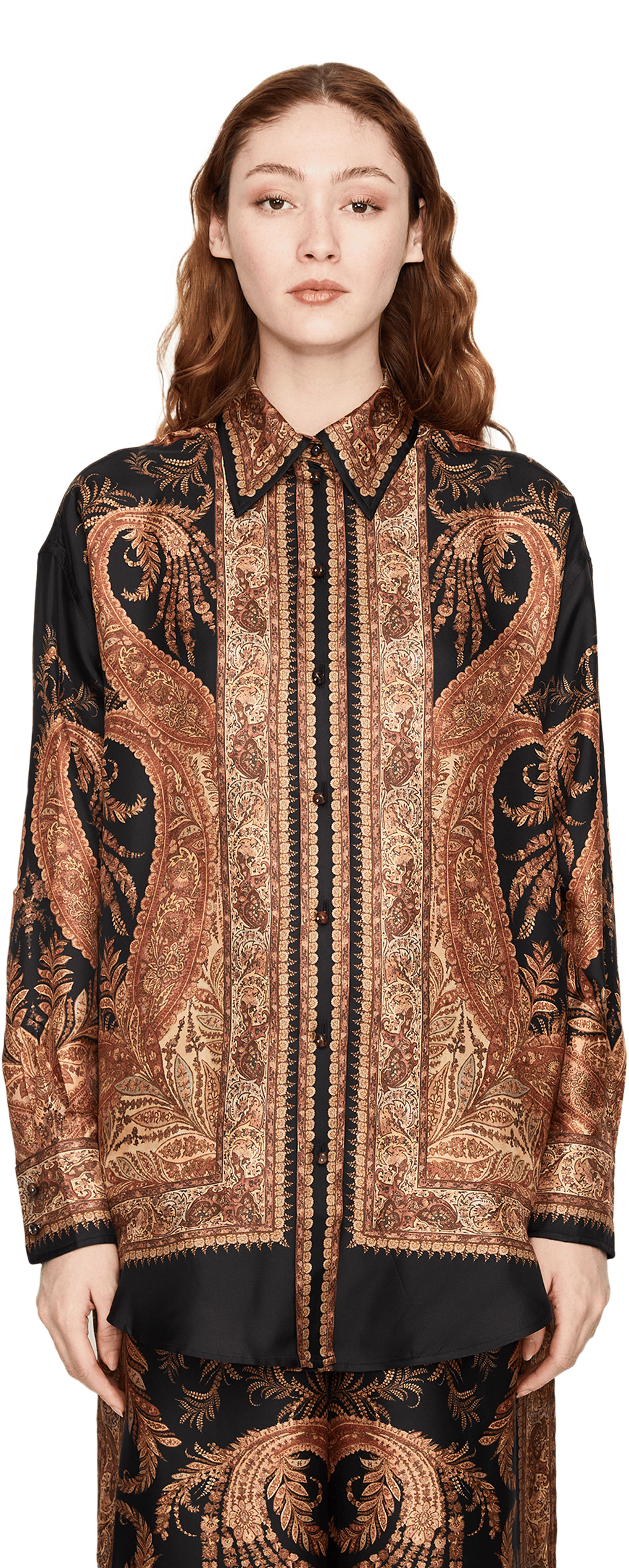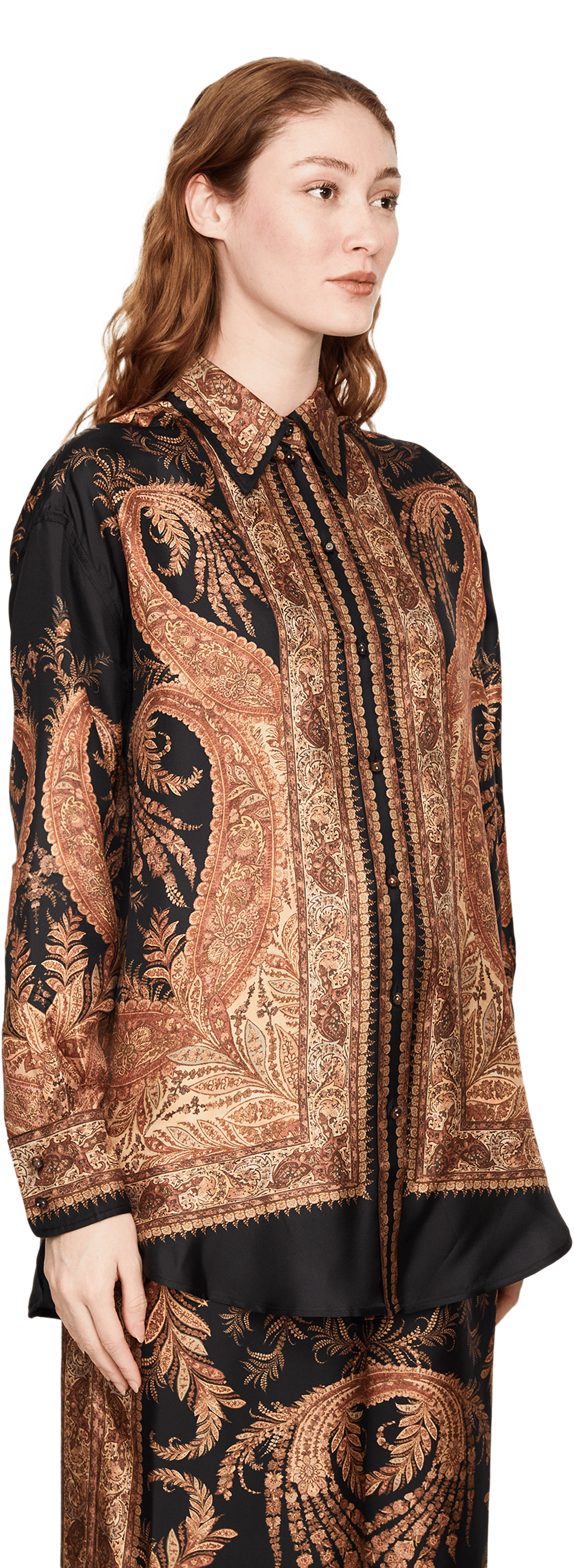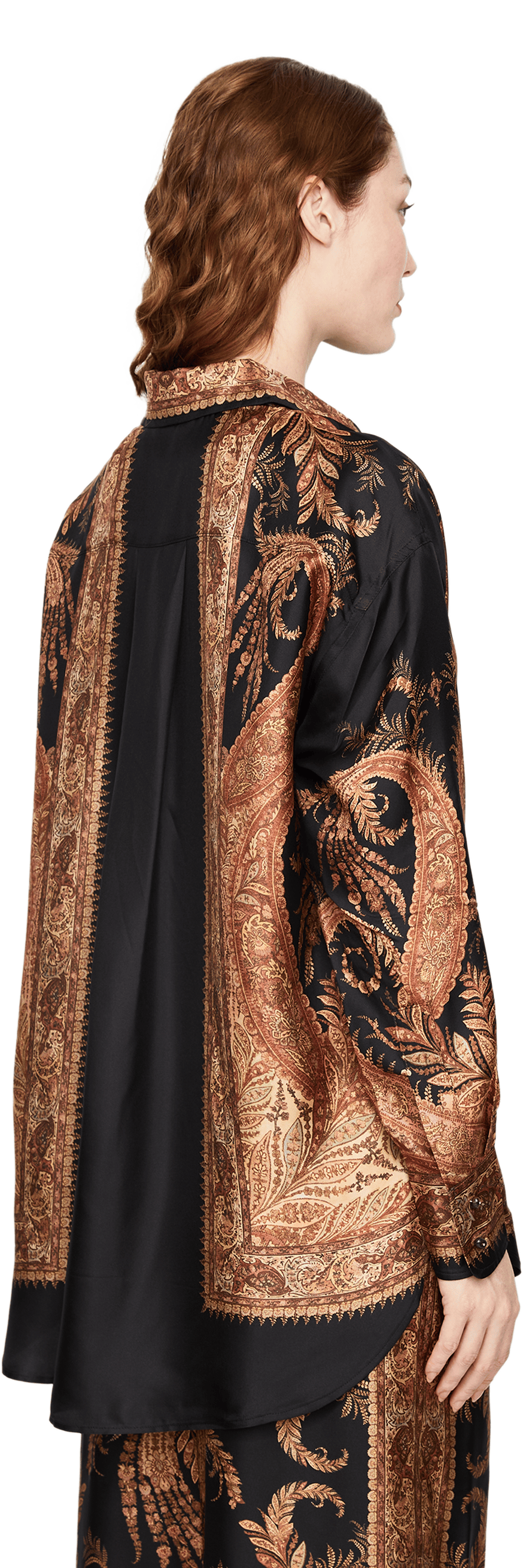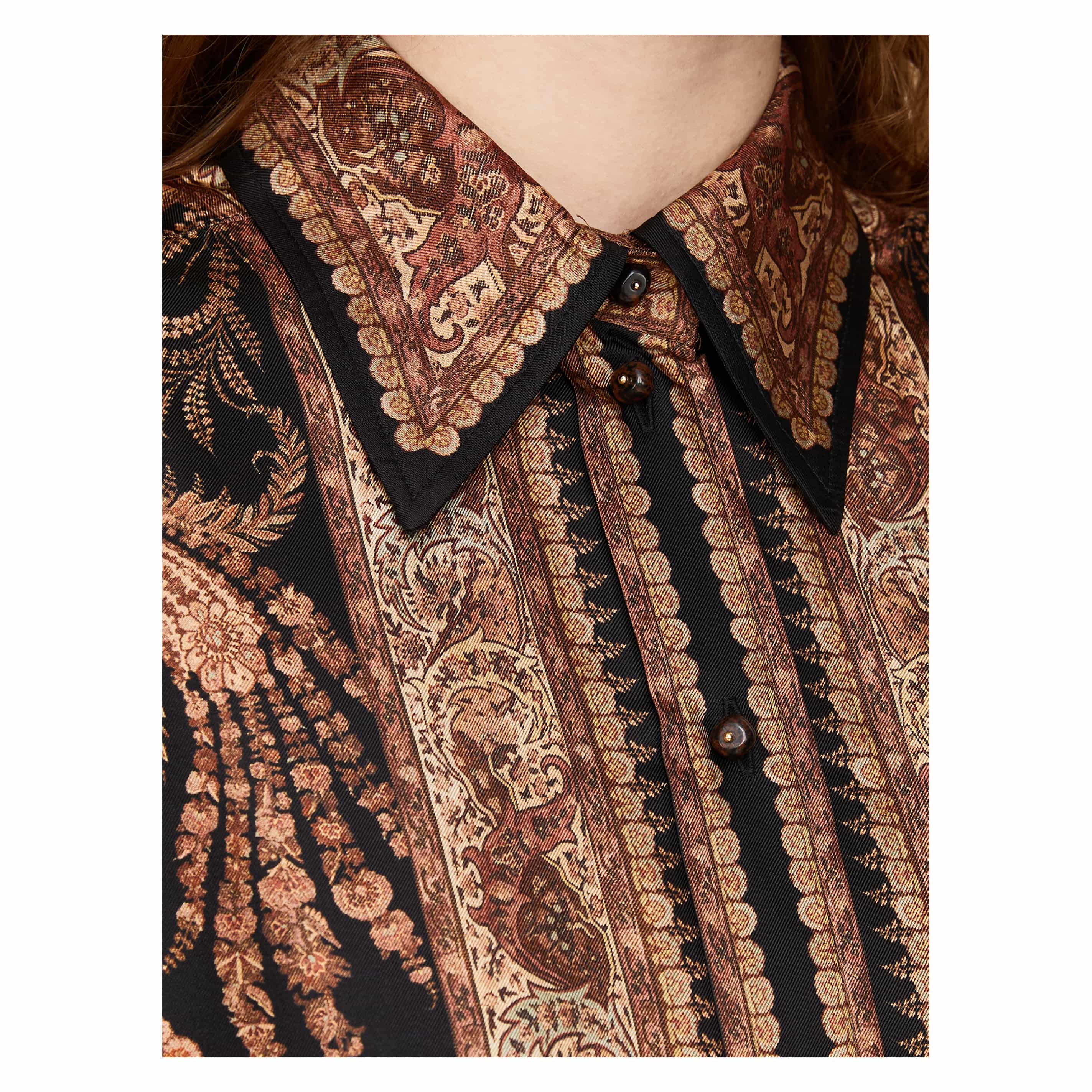 Die Bluse 'Hypnotic Relaxed' in Schwarz von Zimmermann wurde aus reiner Seide gefertigt und besticht durch das Paisley-Muster. Die oversized Passform, der spitze Kragen und die durchgehenden Steinknöpfe runden den Look stilvoll ab.