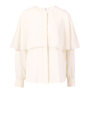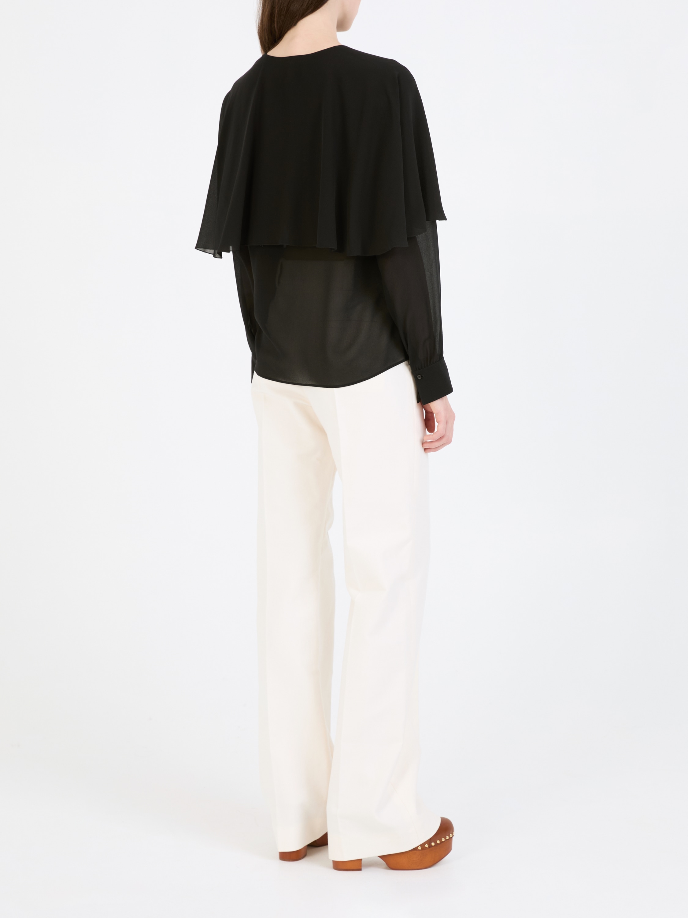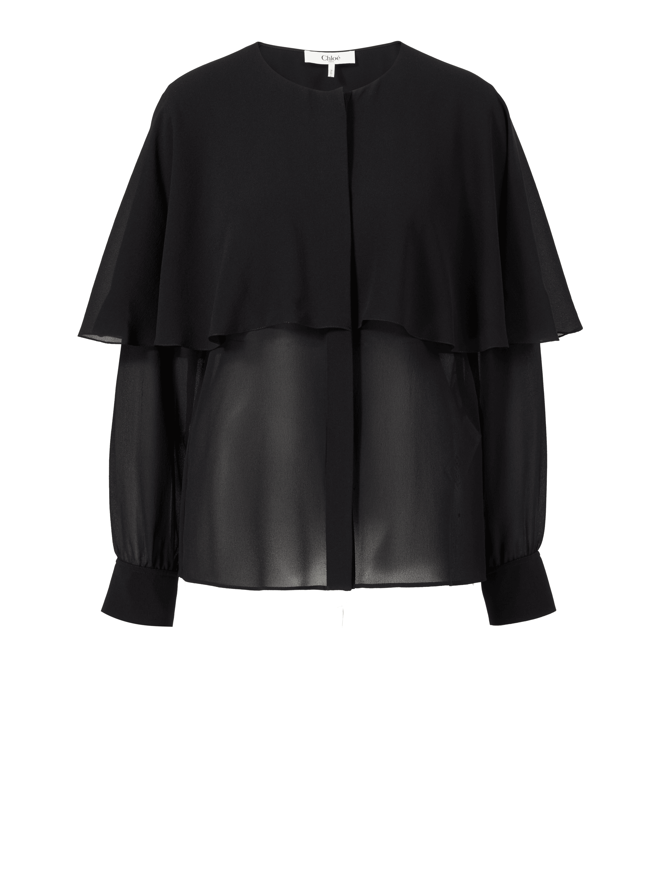 Diese Bluse in Schwarz von Chloé wurde aus reiner Seide gefertigt und besticht durch das elegante Cape. Die matte Optik, die verdeckte Knopfleiste und die lockere Passform zeichnen diesen femininen Look aus.