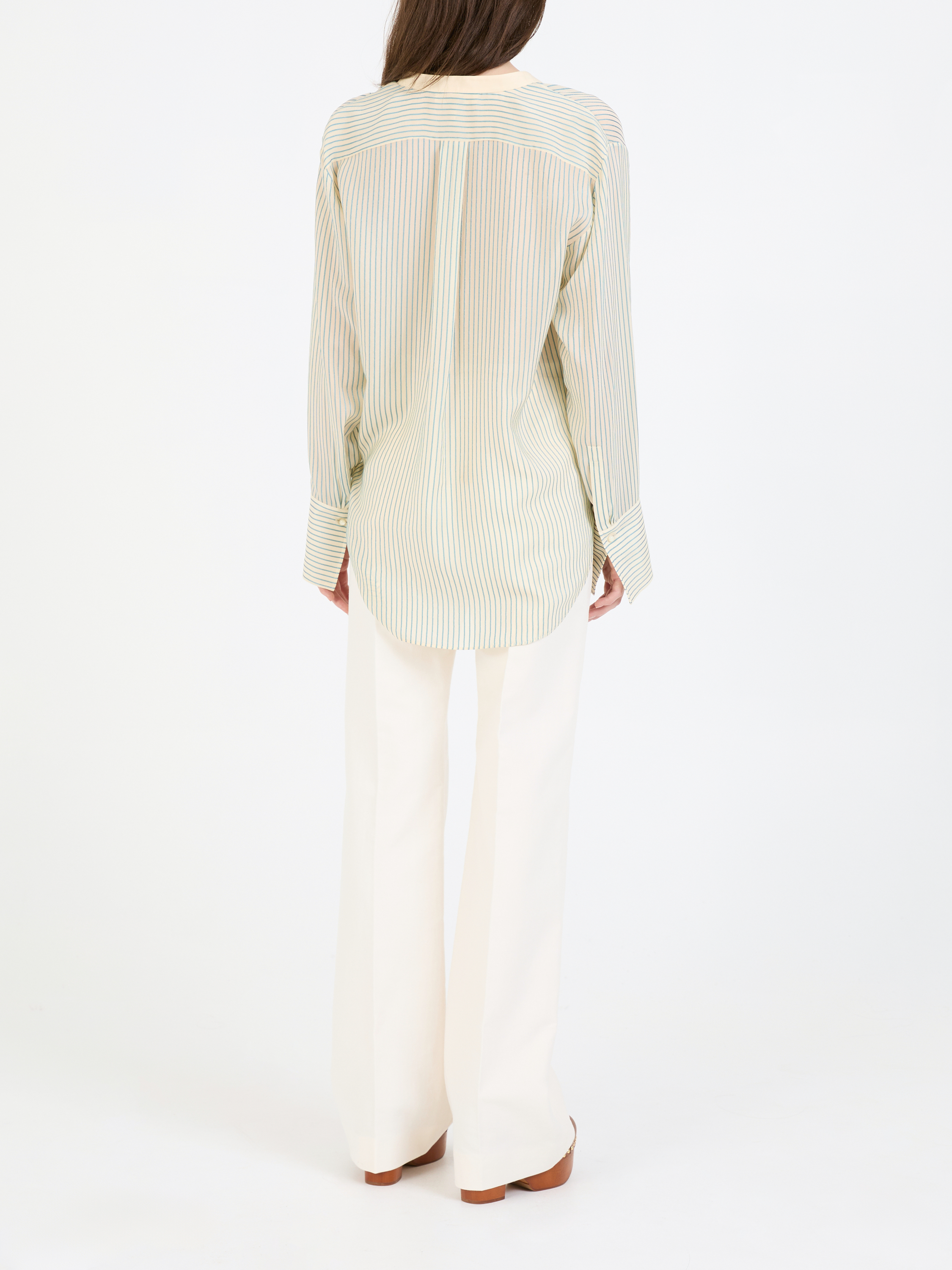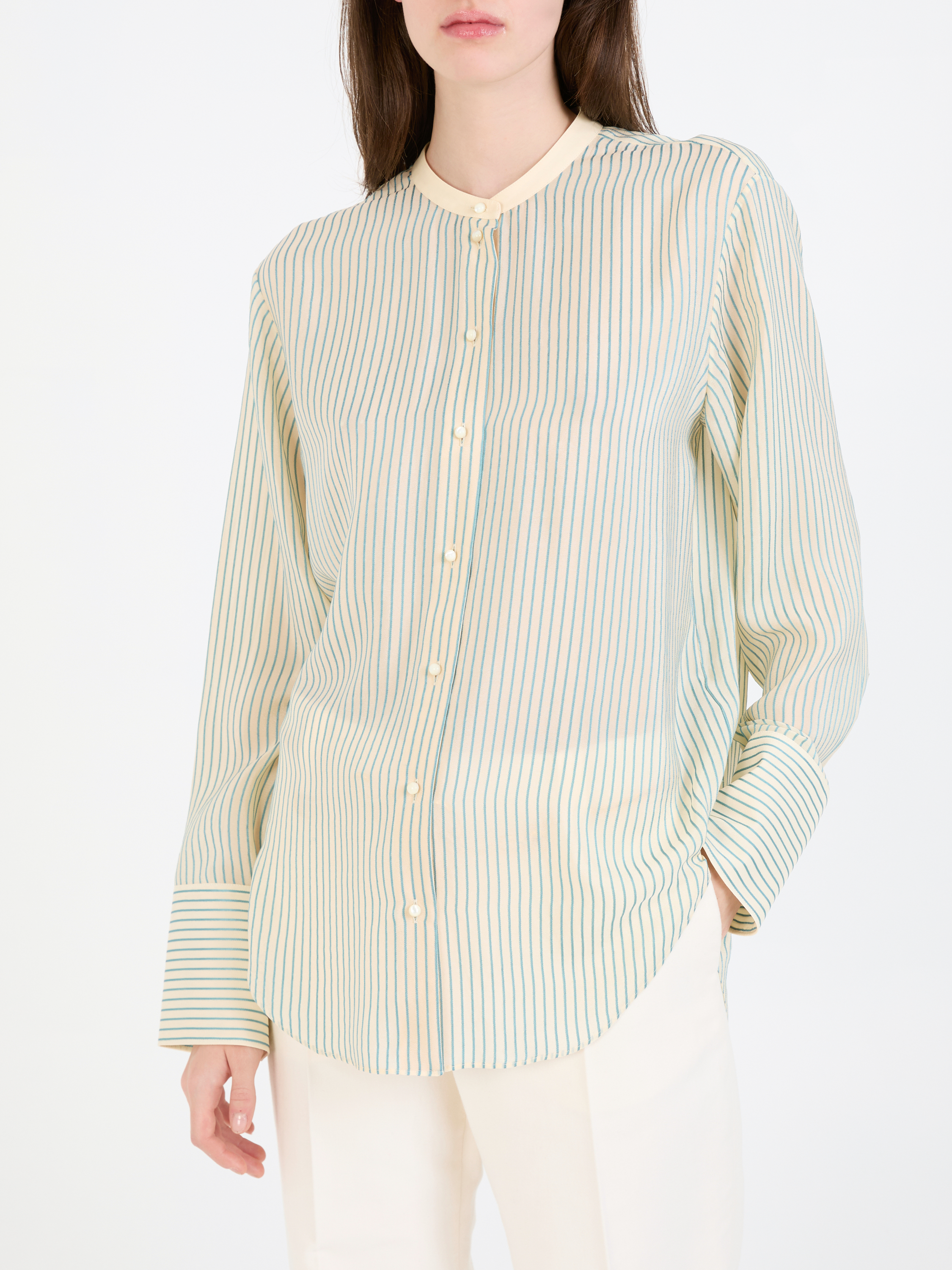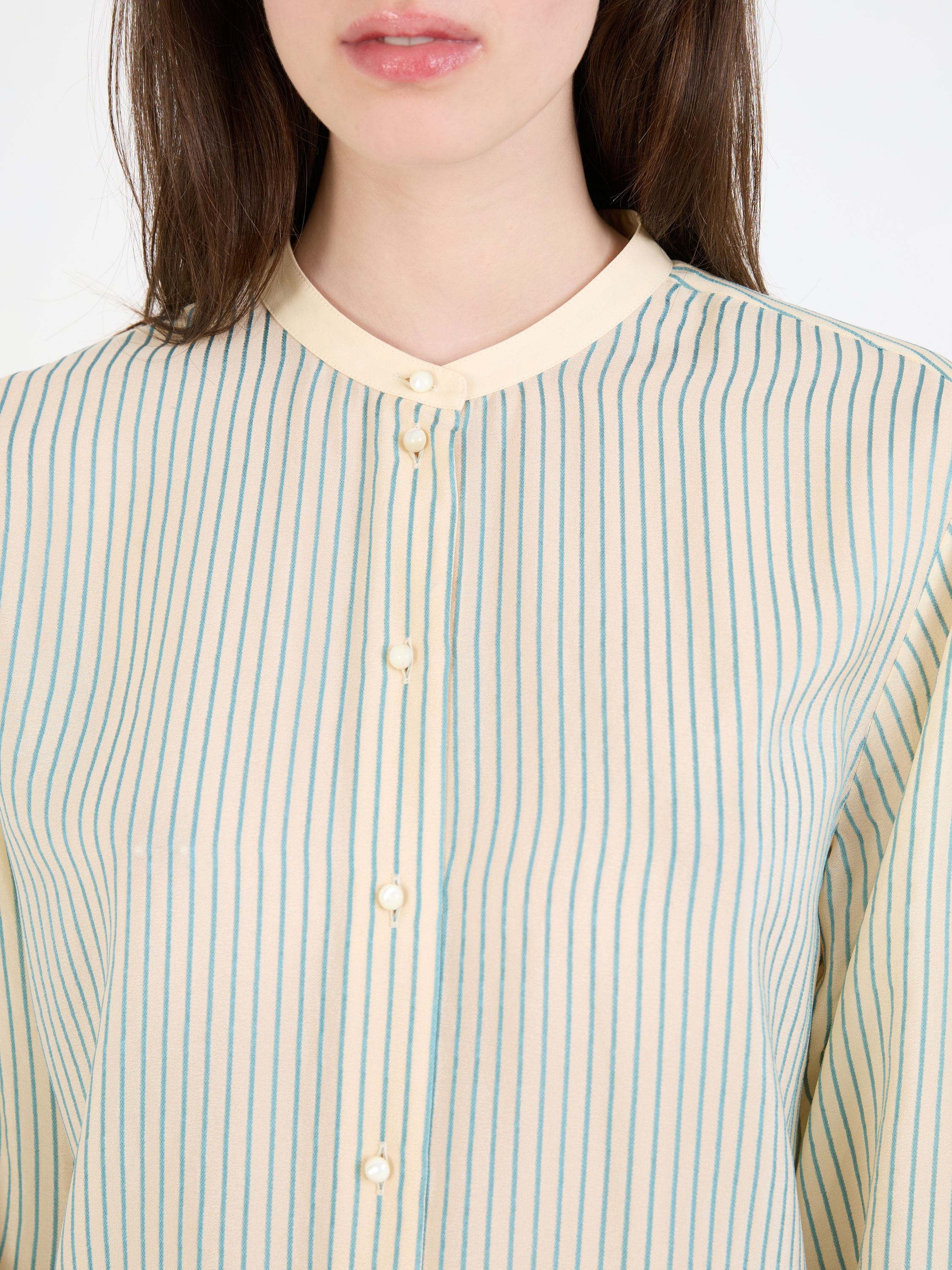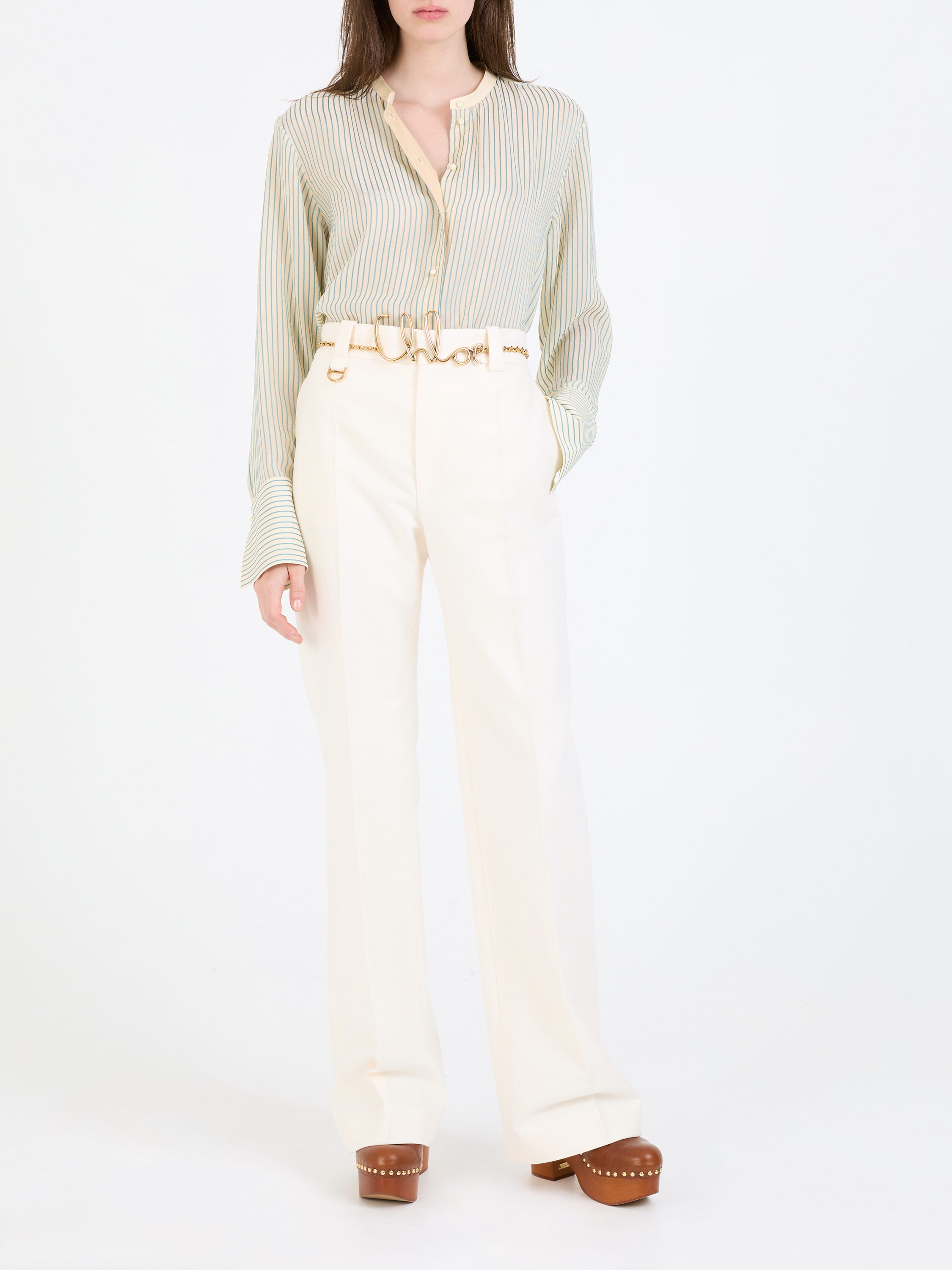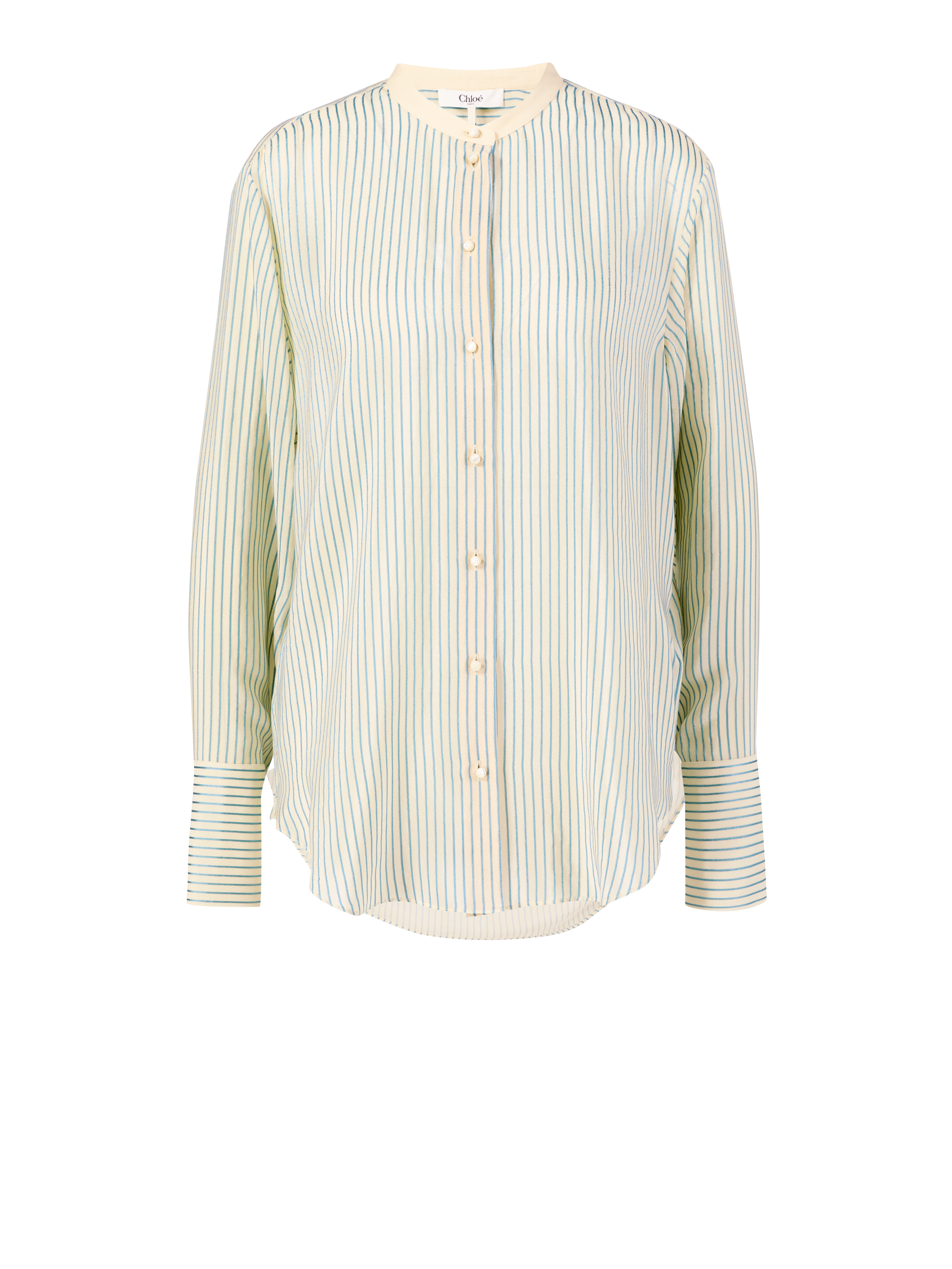 Diese Bluse in Beige/Grün von Chloé wurde aus reiner Seide gefertigt und besticht durch die lockere Passform und die seidig leichte Haptik. Der Mao-Kragen und die klassische, vorderseitige Knopfleiste zeichnen diesen Look aus.