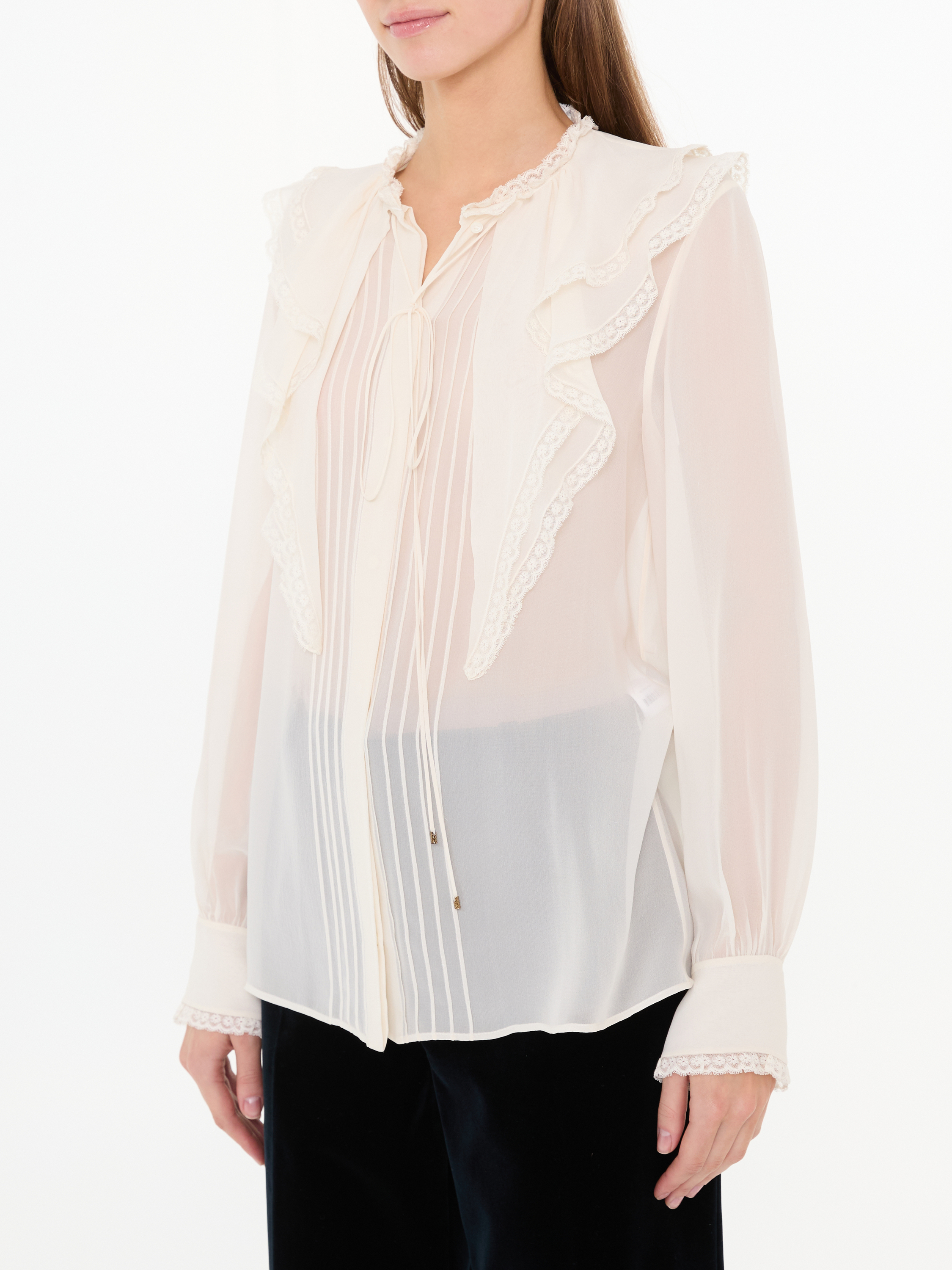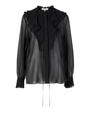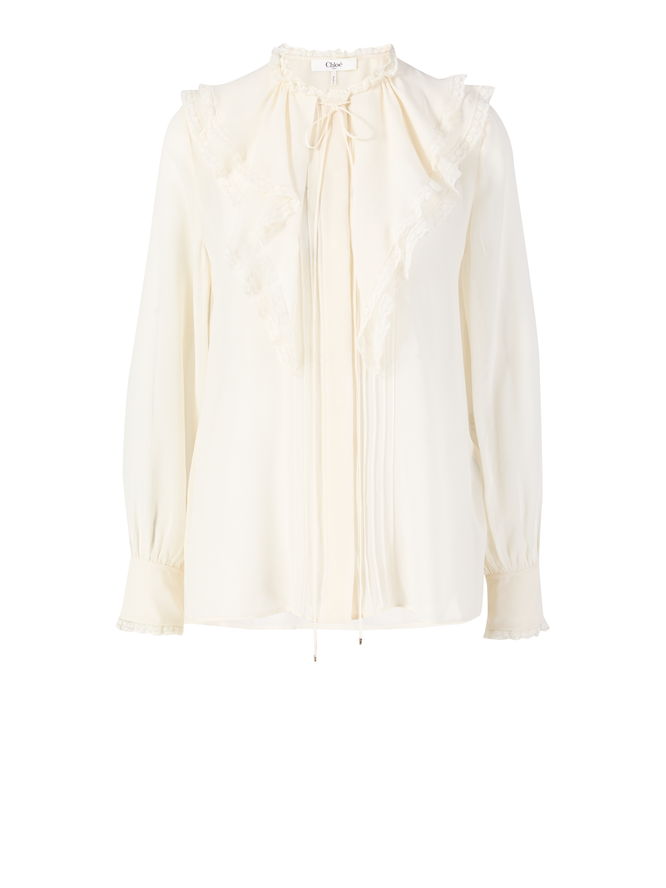 Diese Bluse in Crème von Chloé wurde aus reiner Seide gefertigt und besticht durch die Rüschendetails. Die matte Optik, die verdeckte Knopfleiste mit Perlmutt Knöpfen und die lockere Passform zeichnen diesen femininen Look aus.