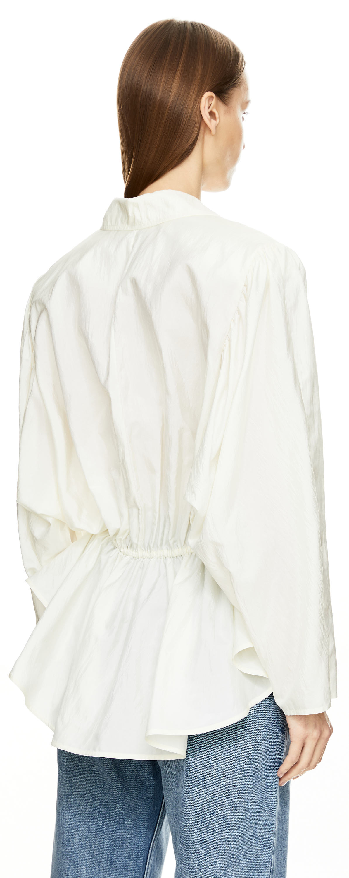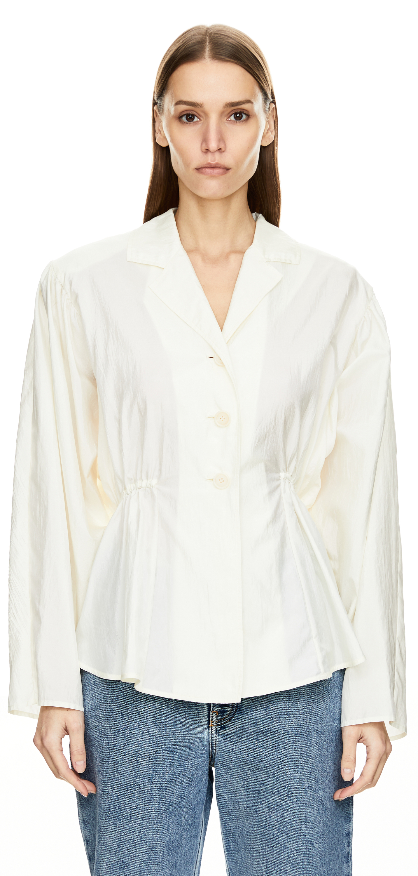 Diese Bluse in Crème von Chloé wurde aus einer Seidenmischung gefertigt und besticht durch die taillierte Silhouette mit elastischem Taillenbund. Die gepolsterten Schultern verleihen dem Modell eine leicht jackettartige Silhouette, während der asymmetrische Saum eine raffinierte Note setzt. Weite Ärmel und das schimmernde Finish runden das Design harmonisch ab.