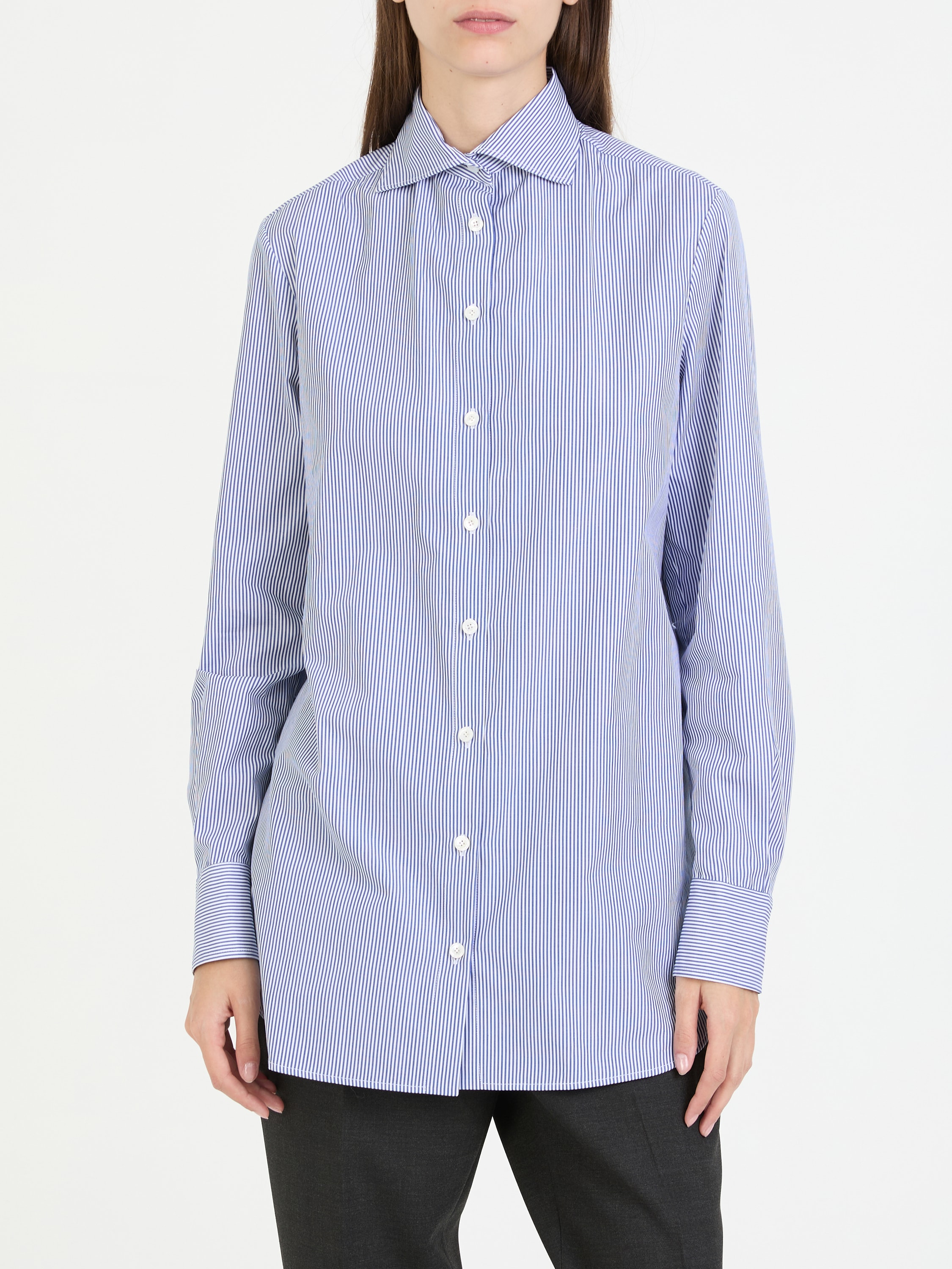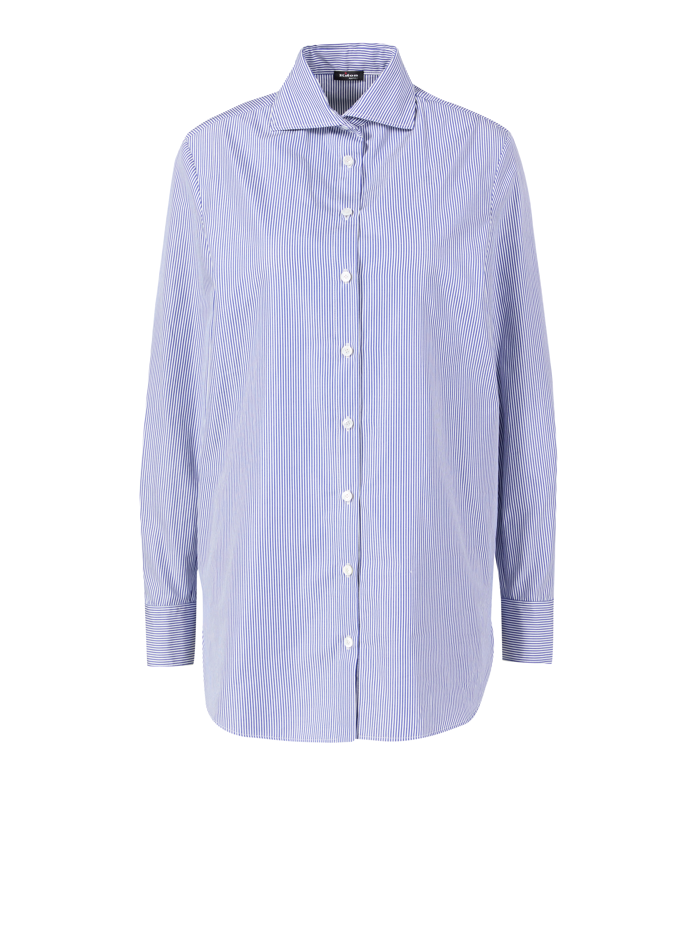 Dieses klassische Hemd in Blau/Weiß von Kiton wurde aus reiner Baumwolle gefertigt und besticht durch die gestreifte Optik. Der klassische Kentkragen, die frontal Knopfleiste und die langen Ärmel zeichnen dieses moderne Design aus.