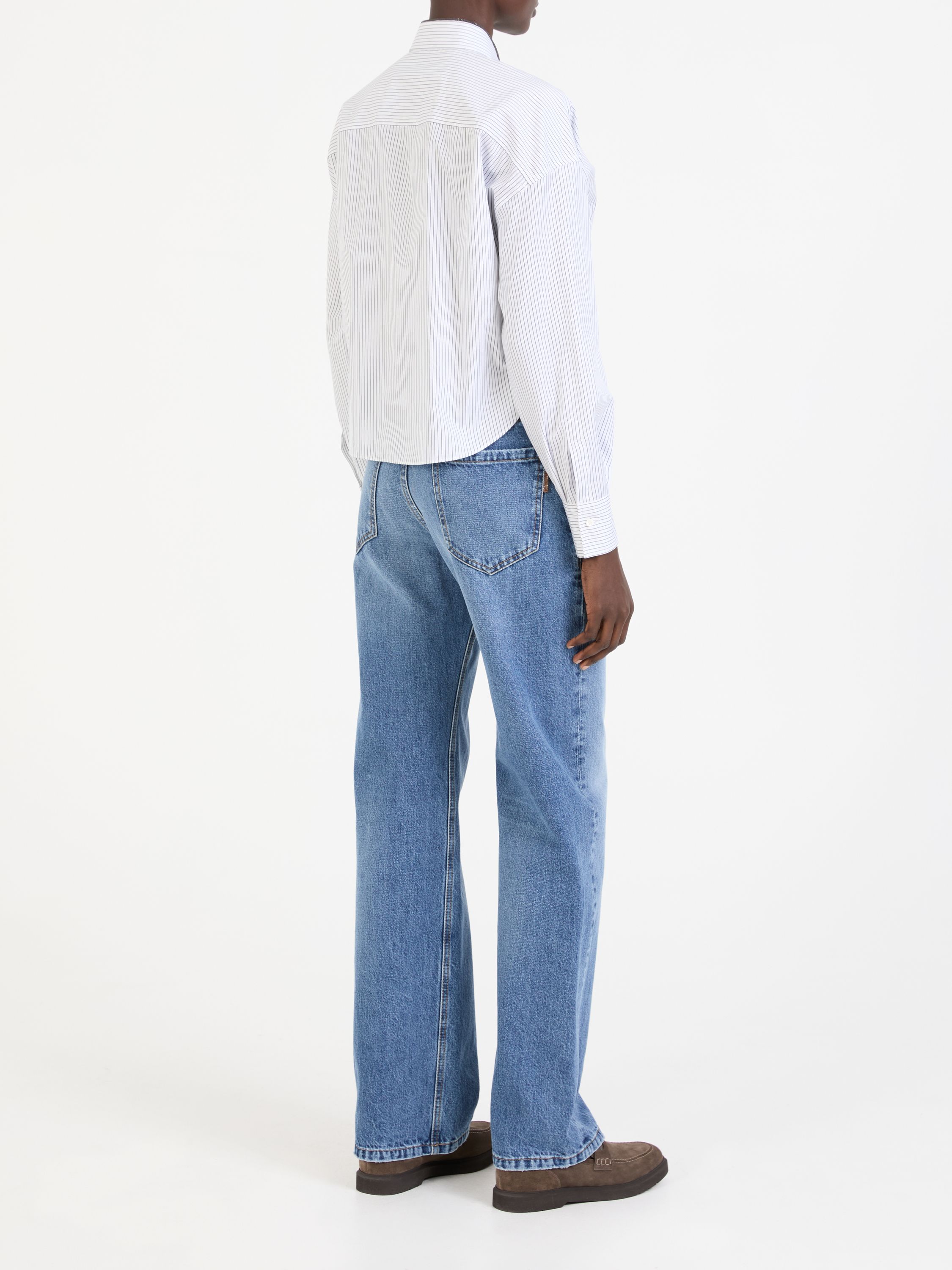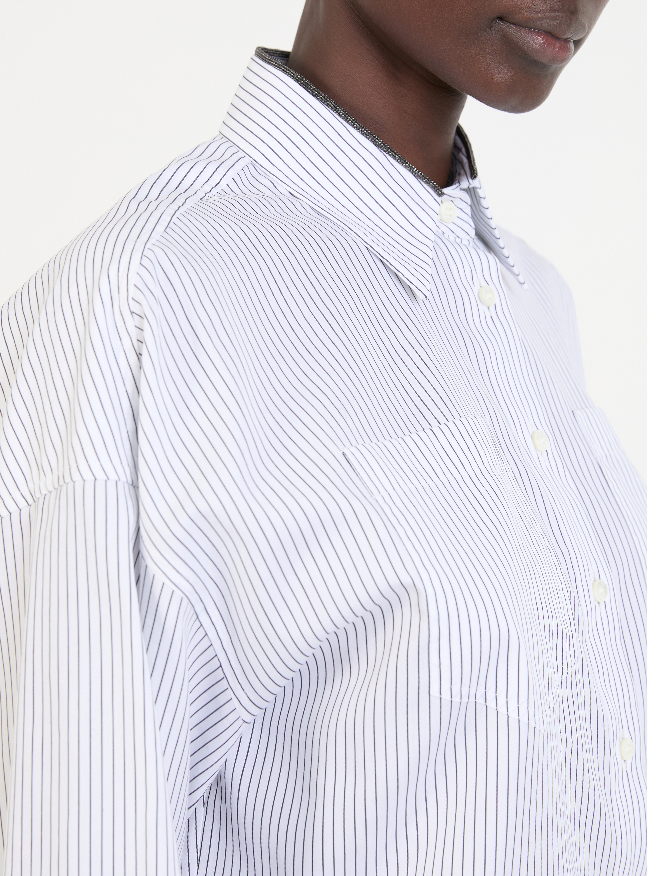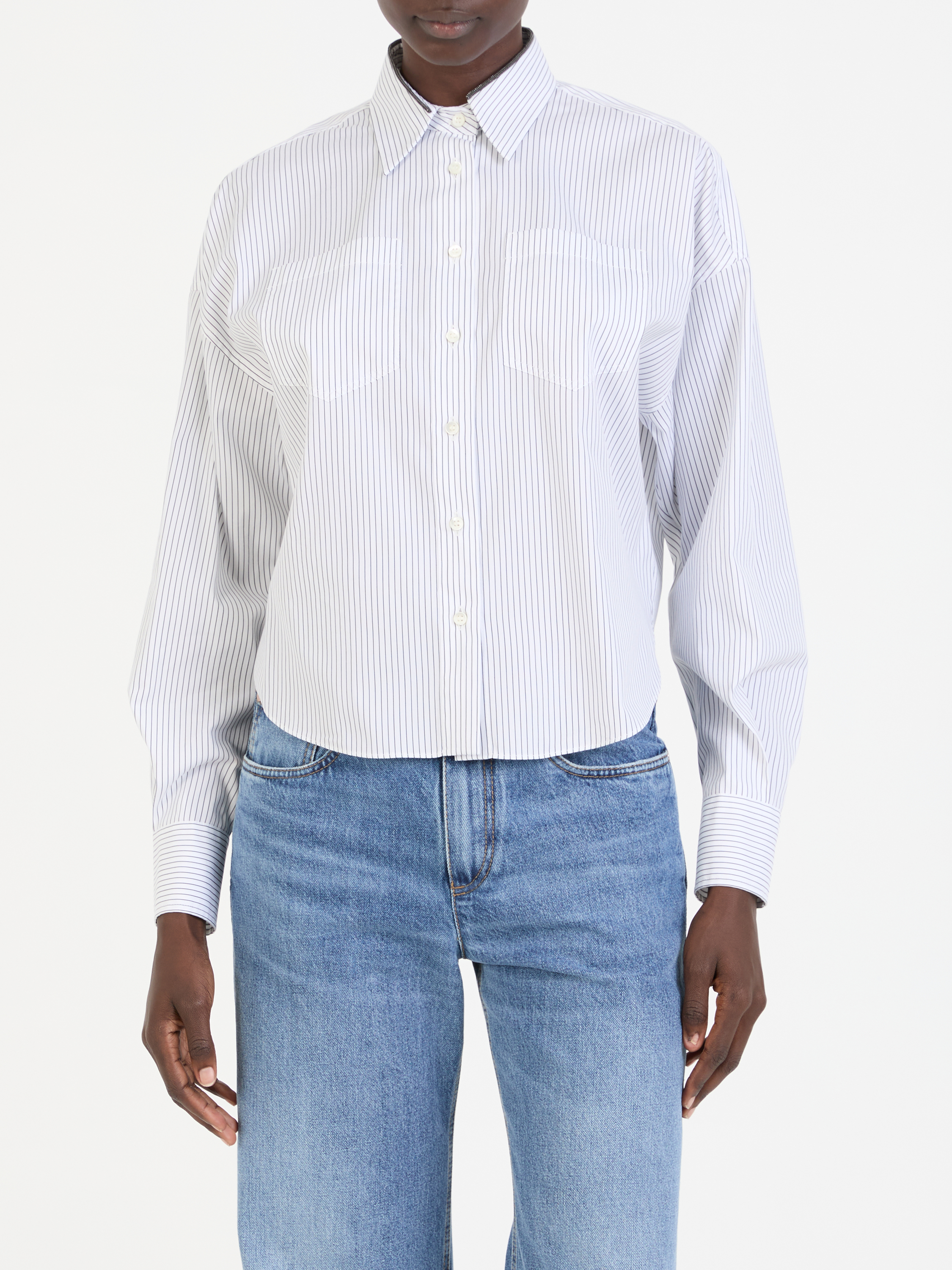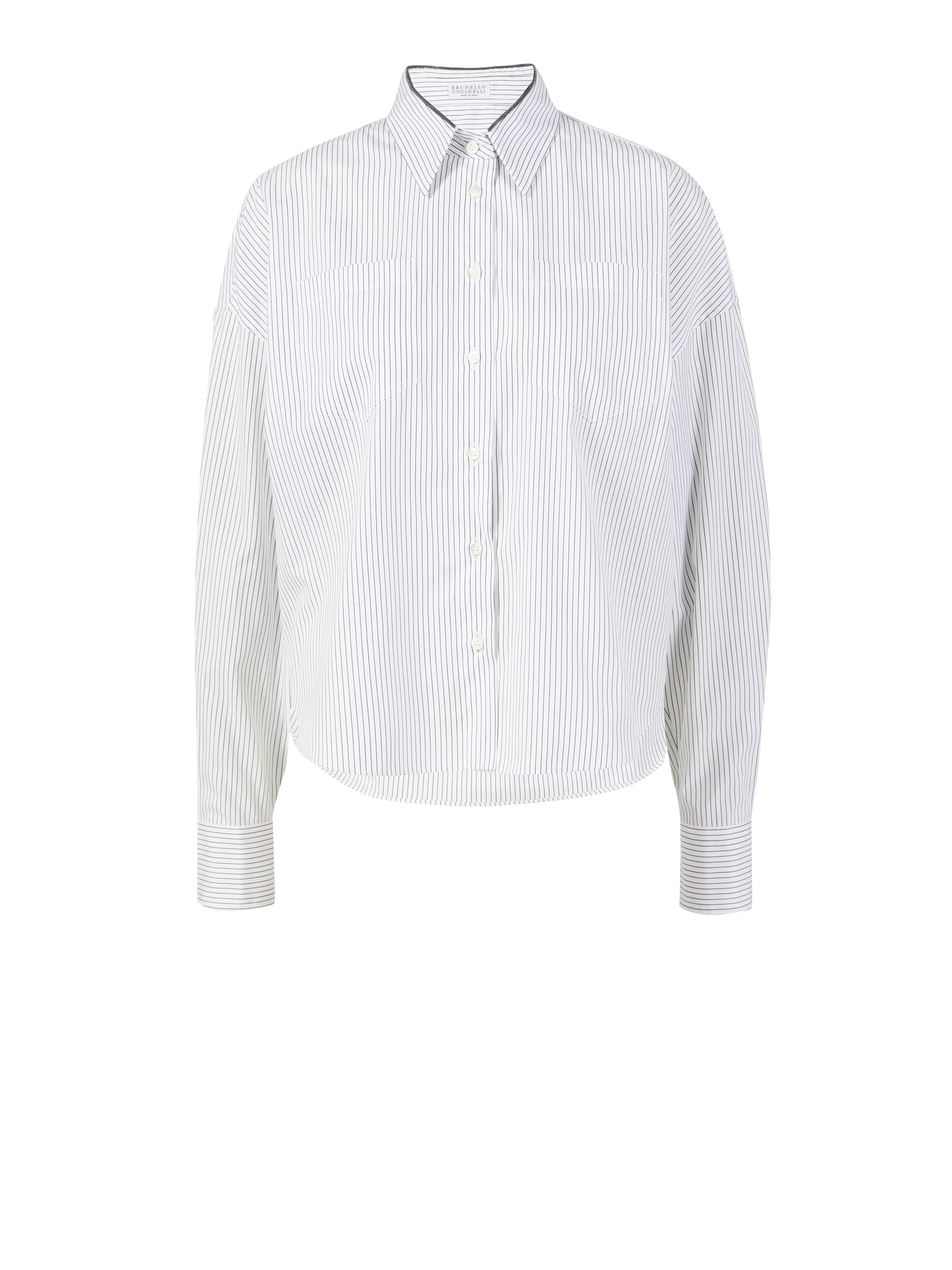 Dieses Hemd in Weiß/Blau von Brunello Cucinelli wurde aus einem hochwertigen Baumwollgemisch gefertigt und besticht durch das gestreifte Design. Die lockere Passform und die frontale Knopfleiste definieren dieses edle Design. Die geknöpften Manschetten vollenden dieses legere Modell.