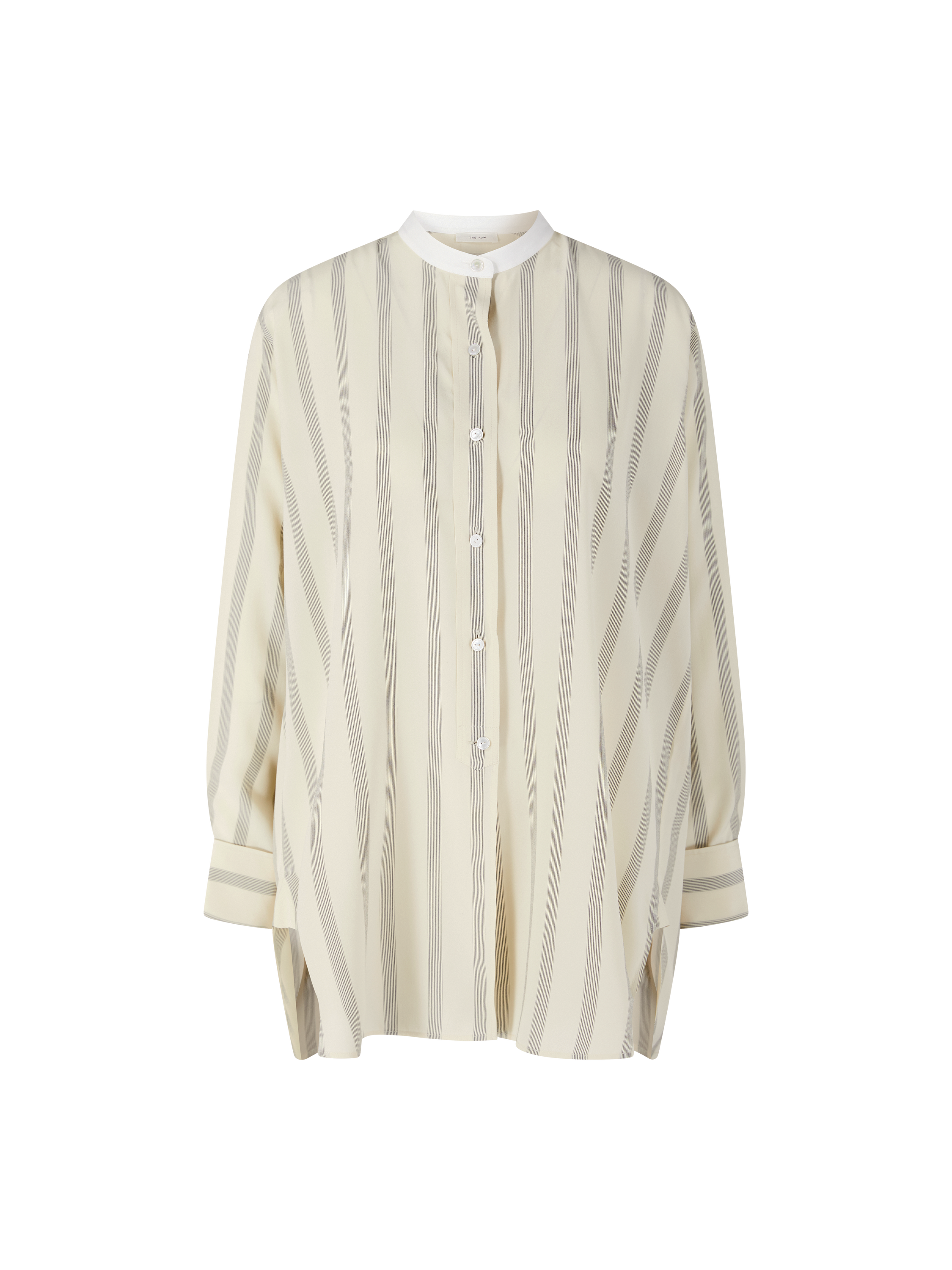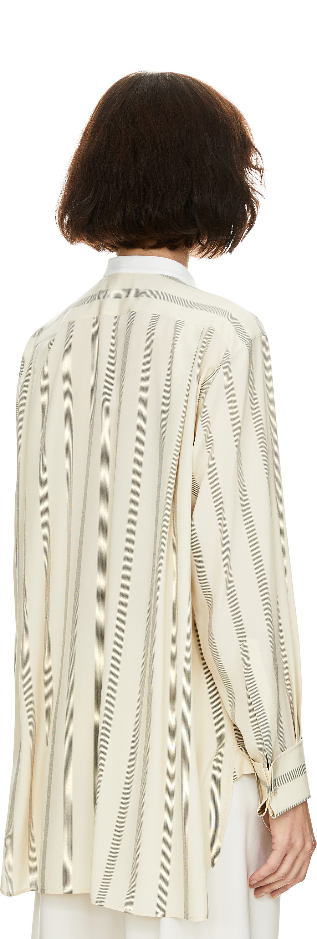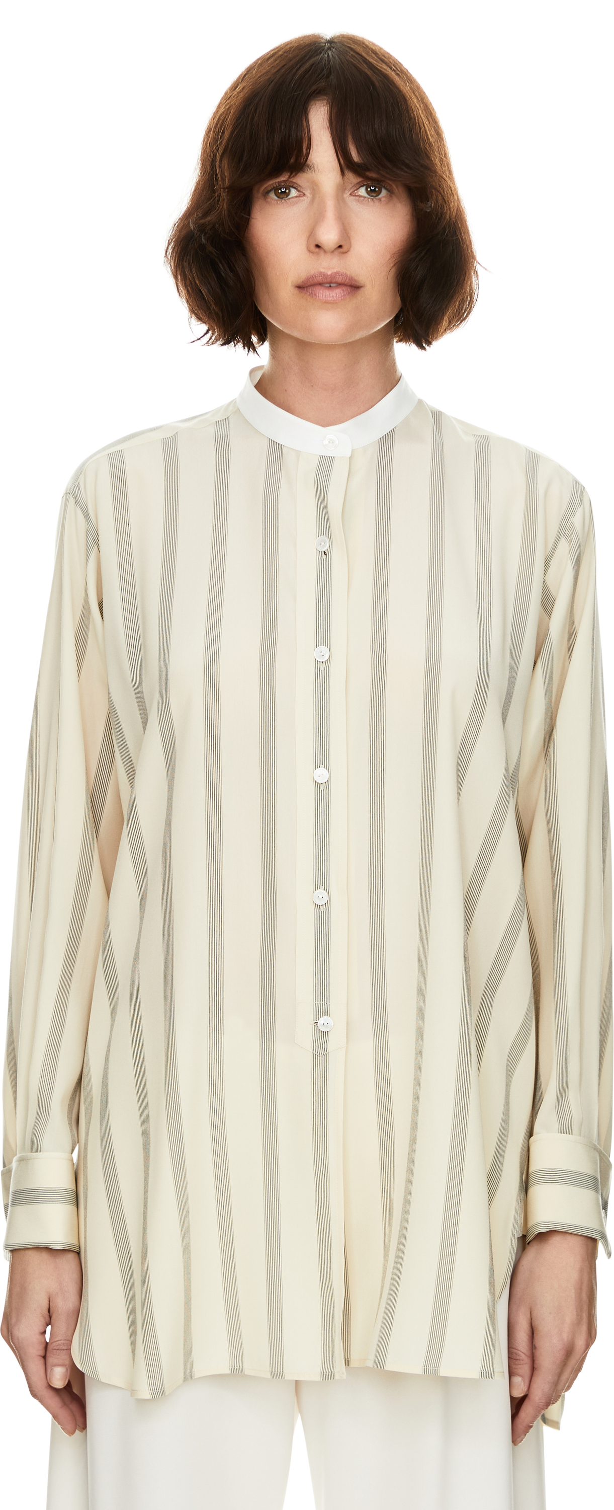Das Hemd 'Falco' in Crème von The Row wurde aus hochwertiger Seide gefertigt und besticht durch die lockere Passform. Der koreanische Kragen, die halbe Knopfleiste, die langen Ärmel sowie die geknöpften Manschetten vervollständigen das moderne Design.