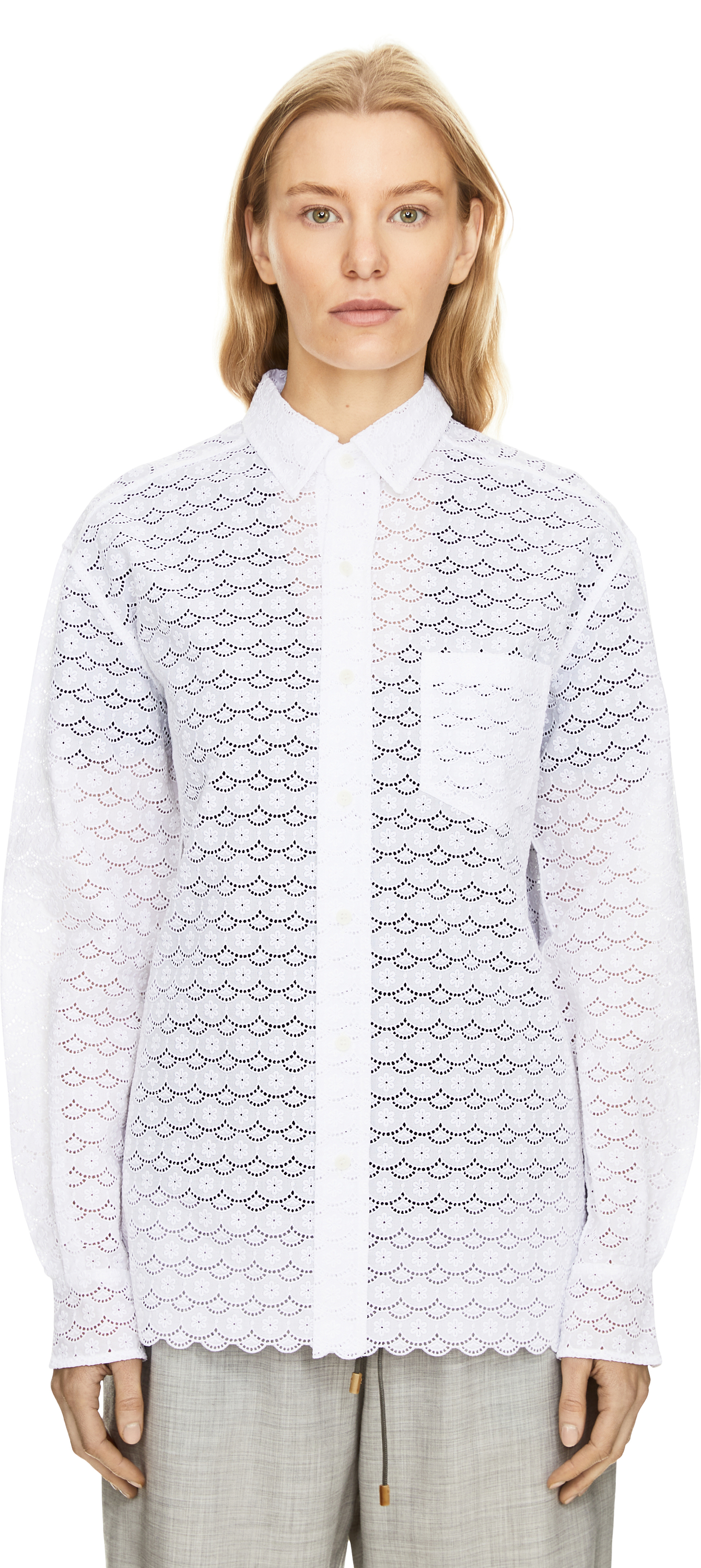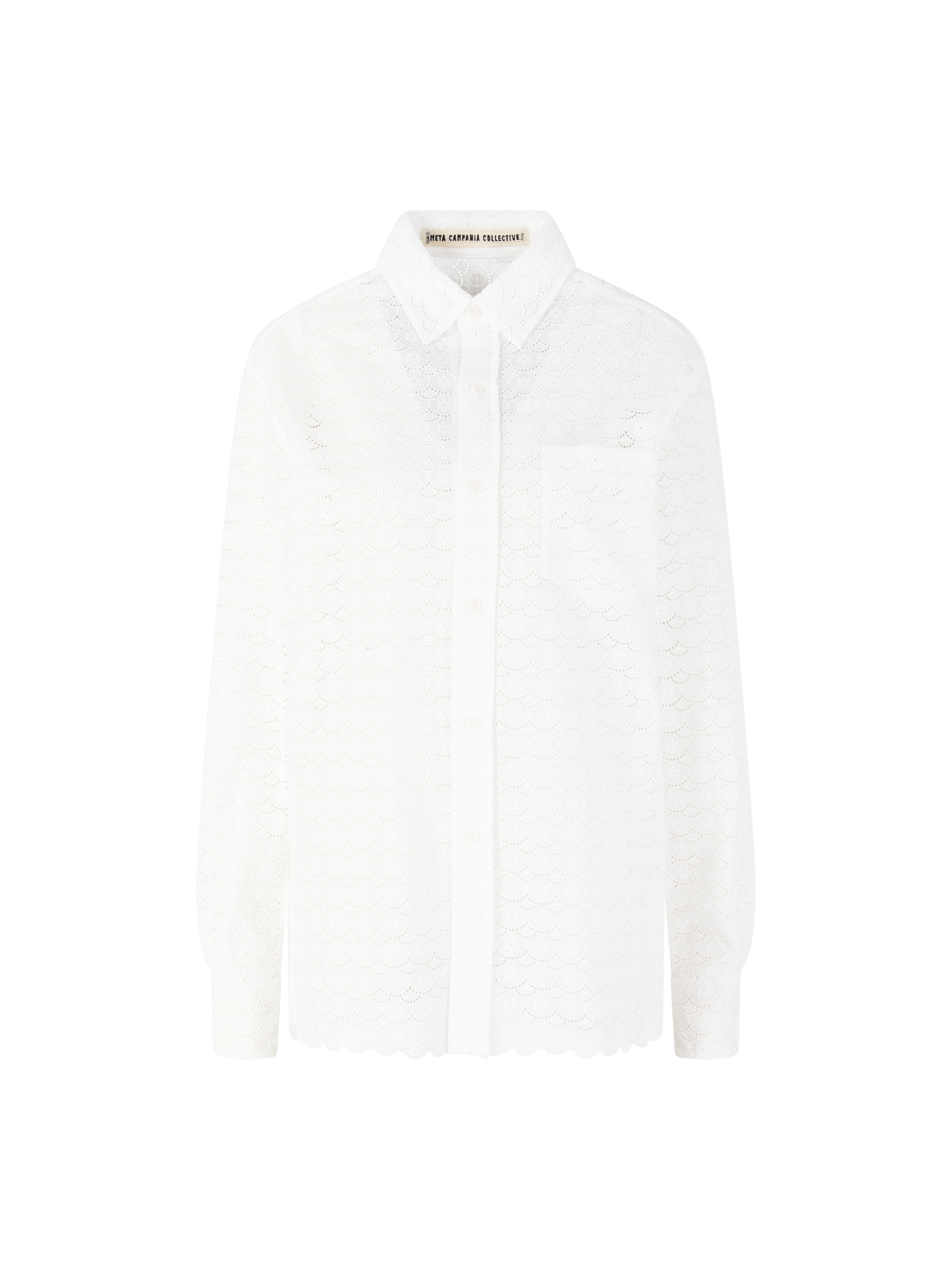 Das Hemd 'Pablo' in Weiß von META CAMPANIA COLLECTIVE wurde aus Baumwolle gefertigt und besticht durch die gerade Silhouette. Das filigrane, gestrickte Blumenmuster, der elegante spitze Kragen sowie die aufgesetzte Brusttasche verleihen diesem hochwertigen Modell einen stilvollen, zeitlosen Charme. Der leicht geschwungene Saum rundet das Design harmonisch ab.