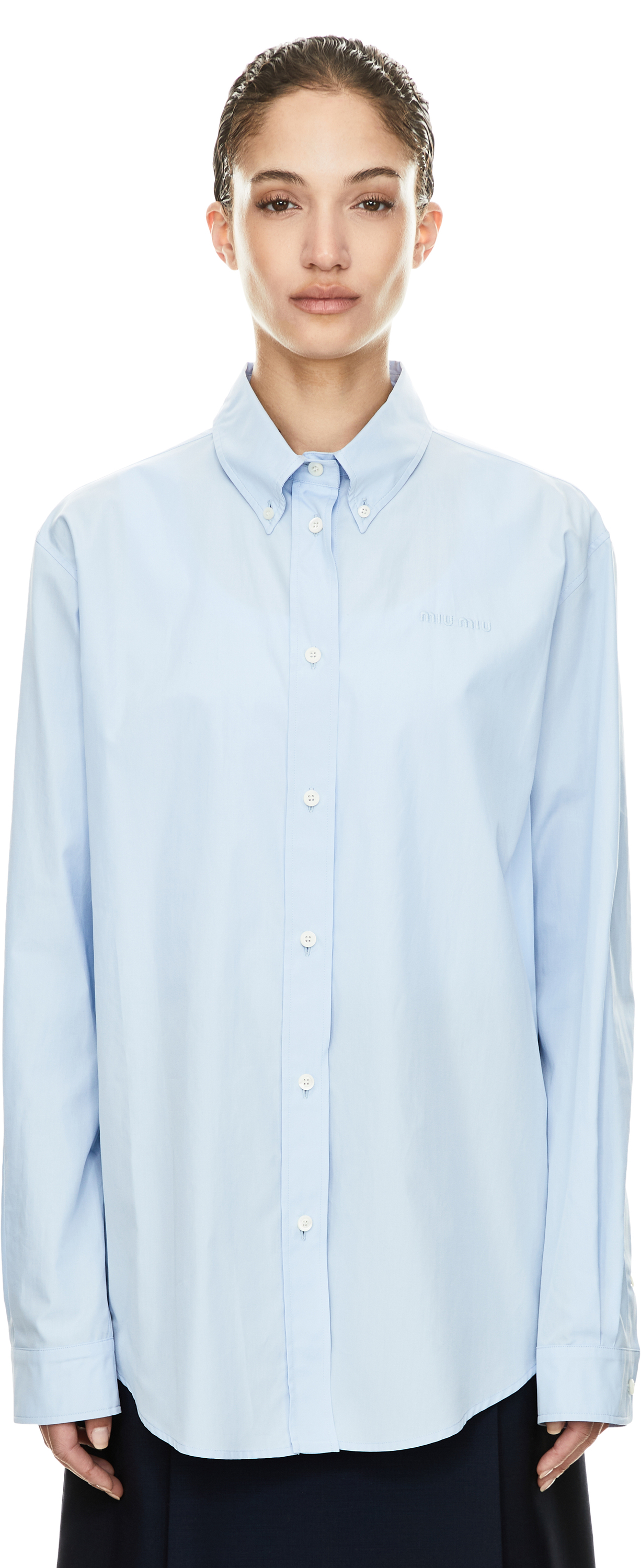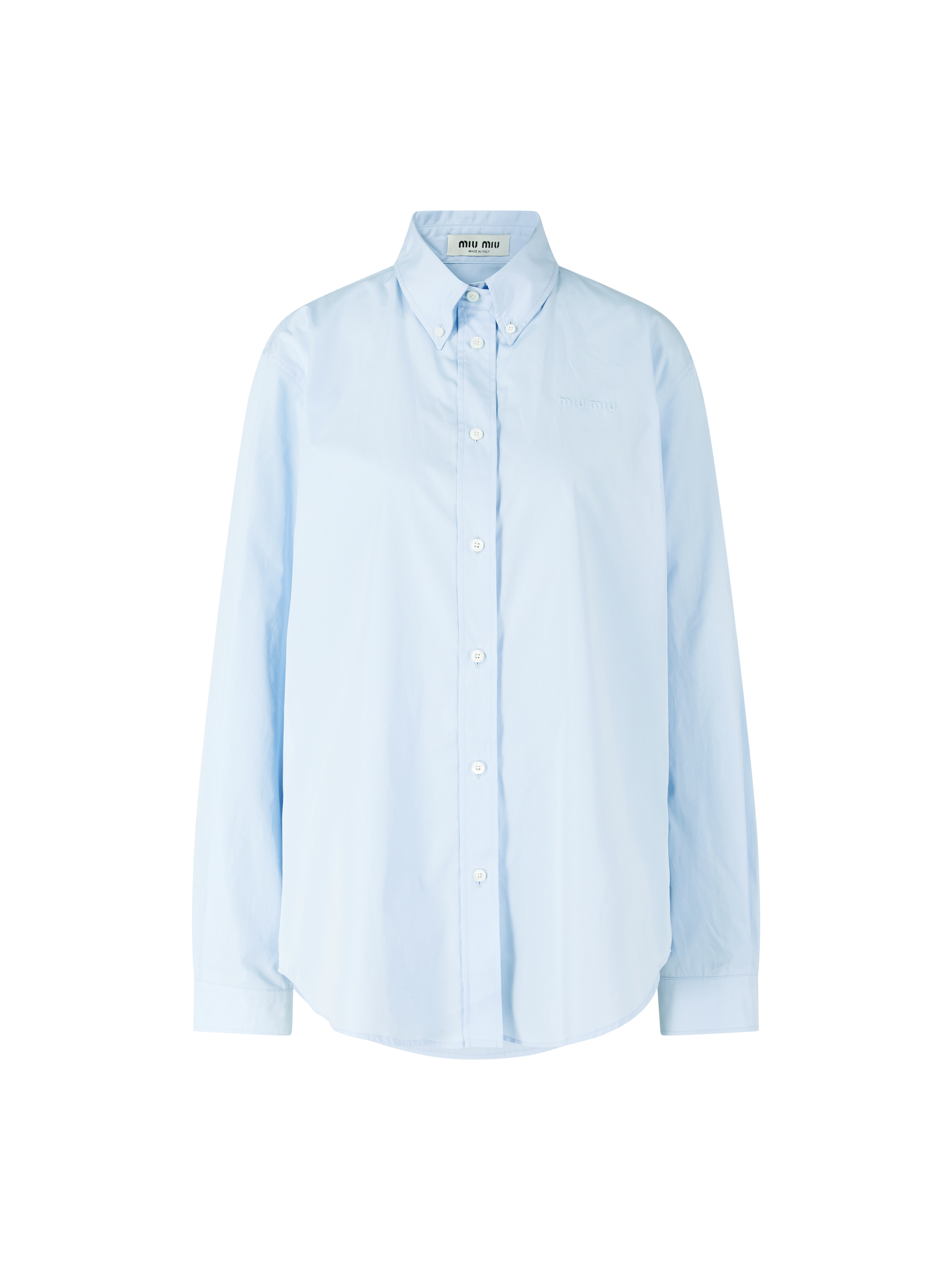 Das Hemd in Hellblau von miu miu wurde aus hochwertiger Baumwollpopeline gefertigt und besticht durch die gerade Passform. Der Button-Down-Kragen, die durchgehende Knopfleiste, die langen Ärmel sowie das ikonische Sticklogo runden das Design harmonisch ab und verleihen dem Hemd einen modernen Charakter.