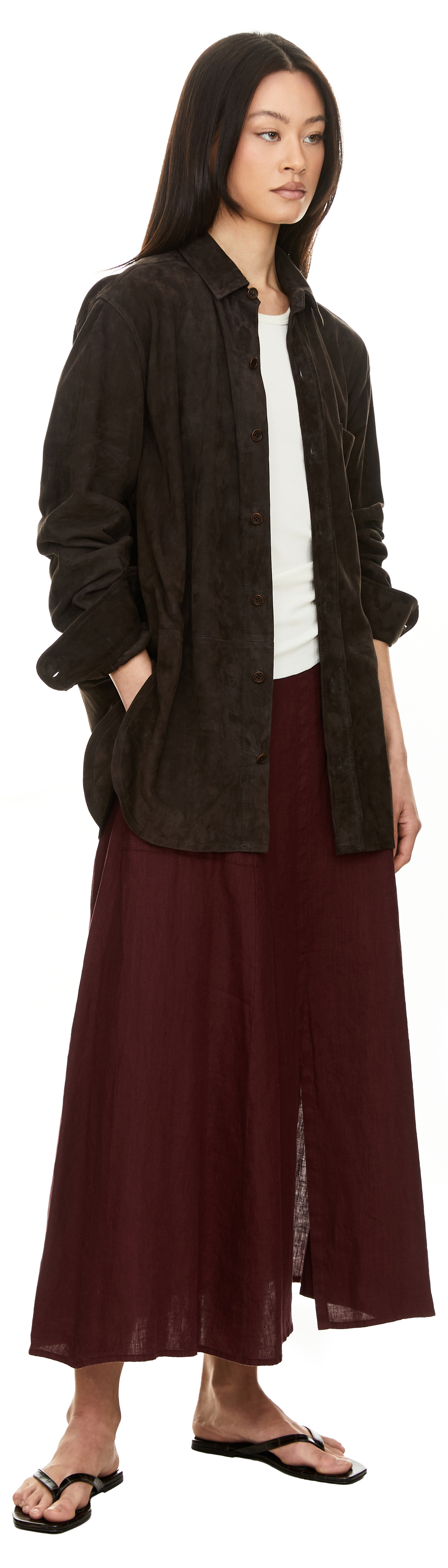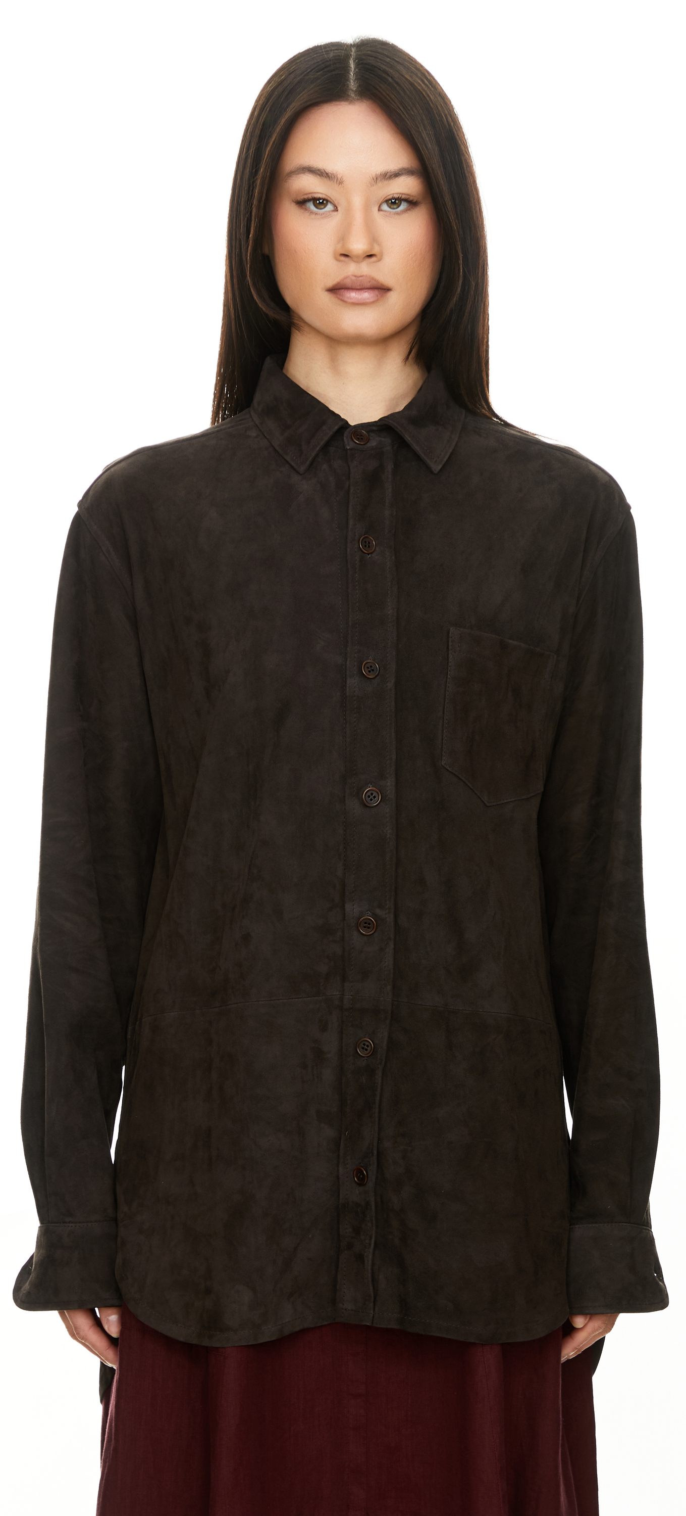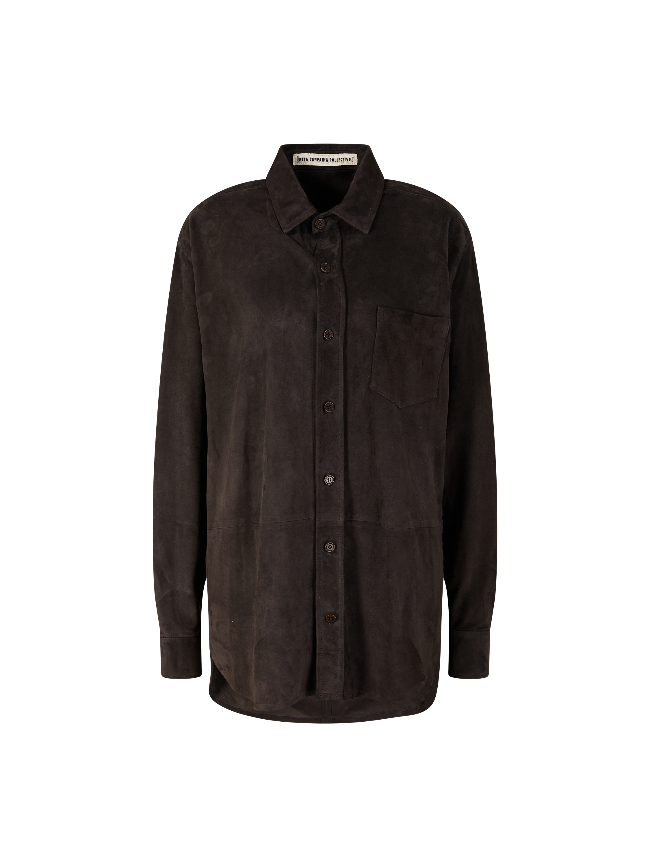 Die Hemdjacke 'Julian' in Dunkelbraun von META CAMPANIA COLLECTIVE wurde aus Lammveloursleder gefertigt und besticht durch die lockere Passform. Die durchgehende Knopfleiste,  die aufgesetzte Brusttasche, die Zickzacknaht unter dem Kragen sowie die seitlichen Schlitze zeichnen dieses hochwertige Modell aus.