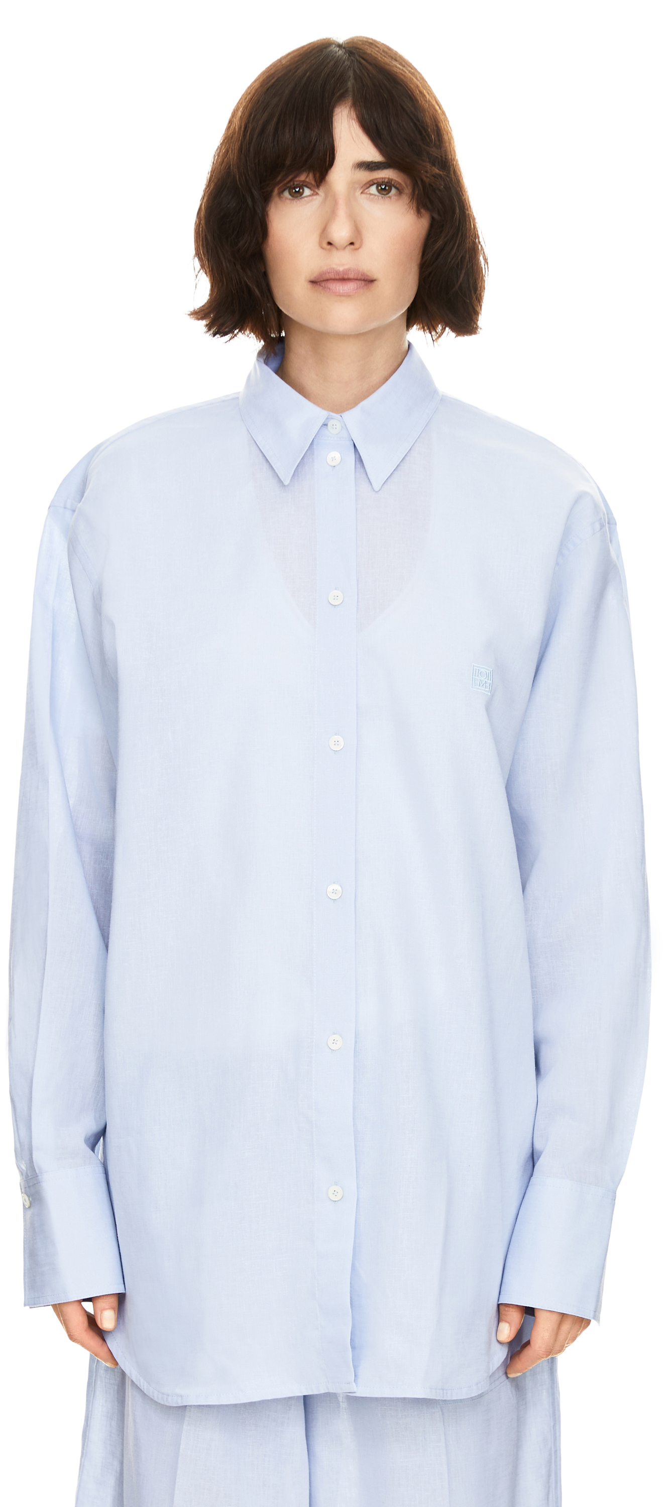 Das Hemd 'Summer' in Hellblau von TOTEME wurde aus einer leichten Leinen-Baumwollmischung gefertigt und besticht durch die halbtransparente Optik. Die Oversize-Passform, das gestickte Brustmonogramm sowie die Perlmuttknöpfe an der durchgehenden Knopfleiste mit Logoprägung vervollständigen das modische Design.