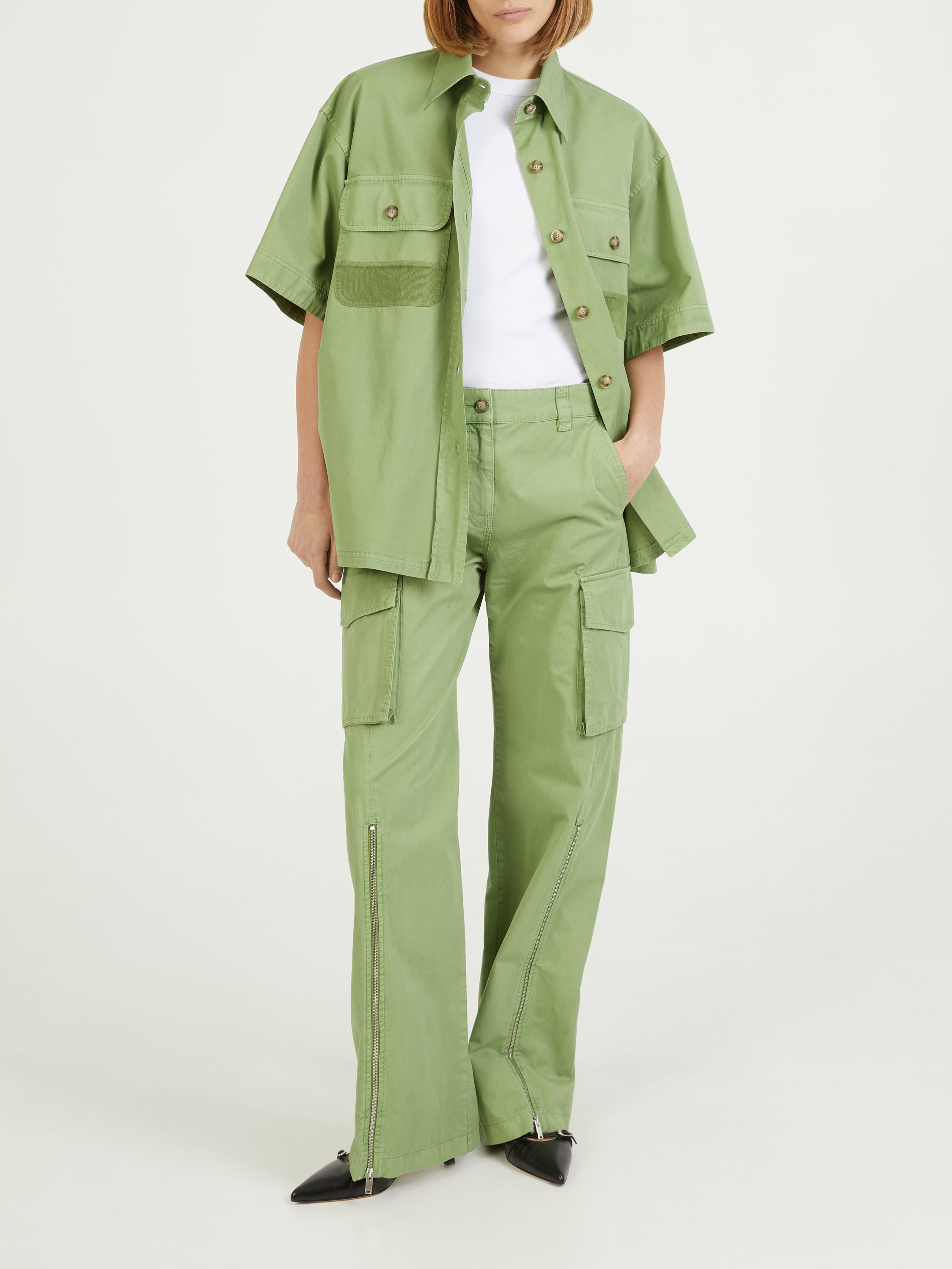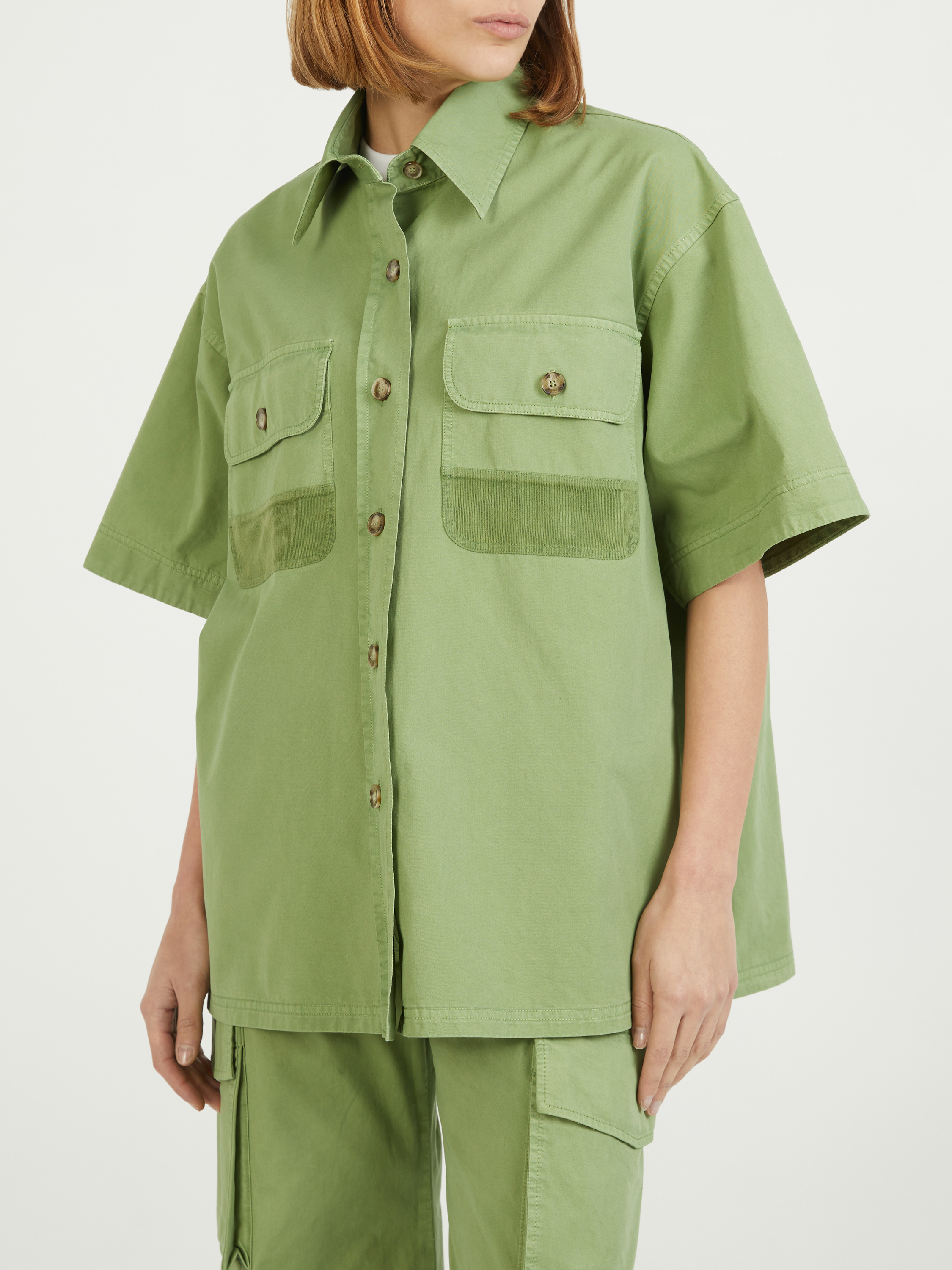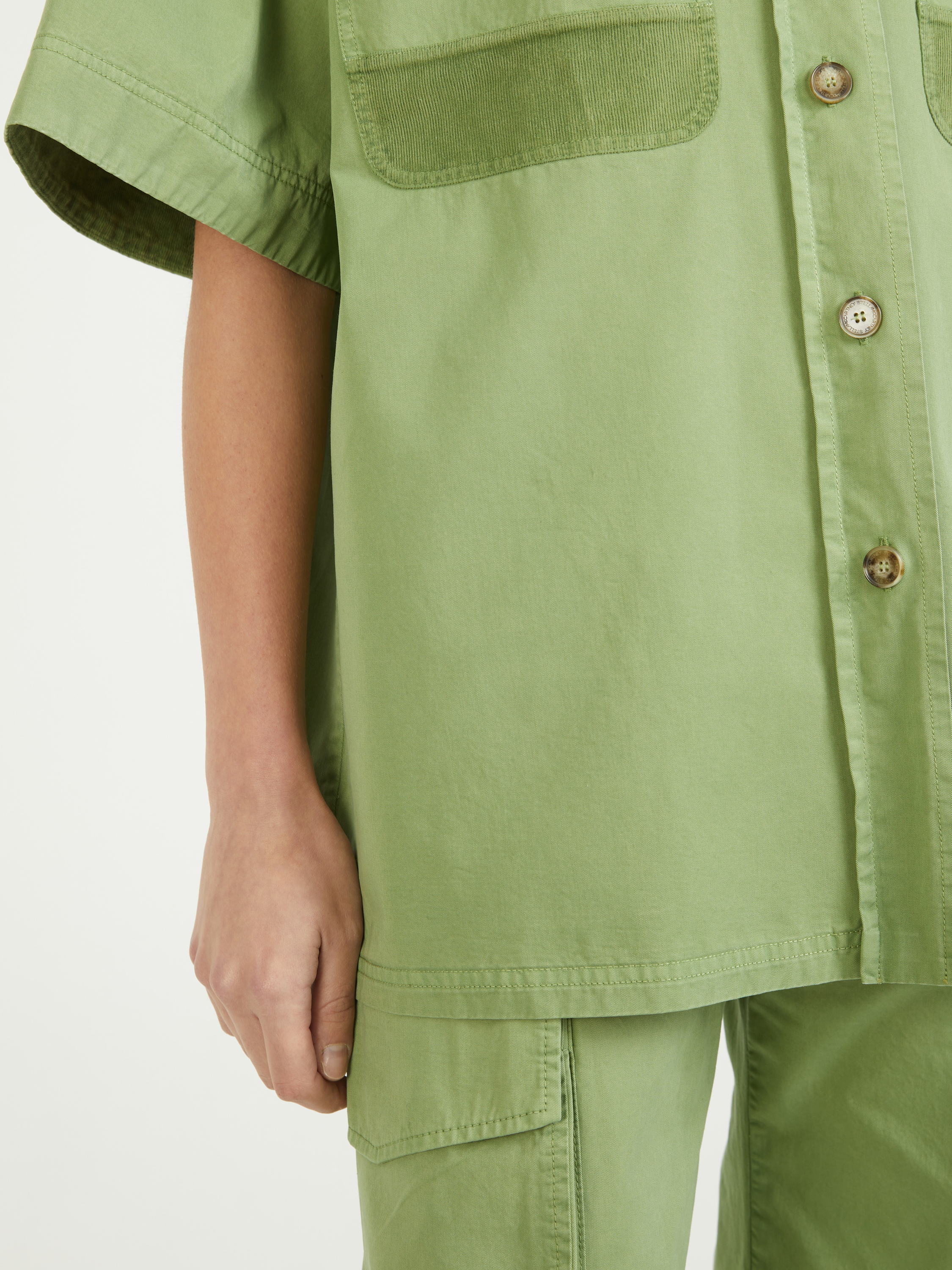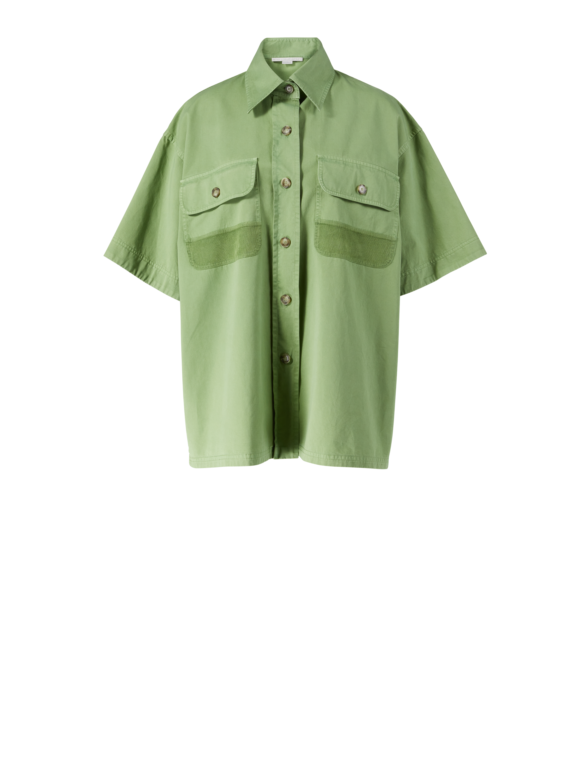 Dieses Hemd in Grün von Stella McCartney wurde aus GOTS-zertifizierte Biobaumwolle gefertigt und besticht durch aufgesetzten Cargotaschen. Die Oversize-Ärmel, die einreihige Knopfleiste und der Kentkragen vollenden diesen Hingucker.