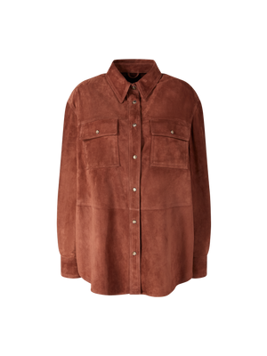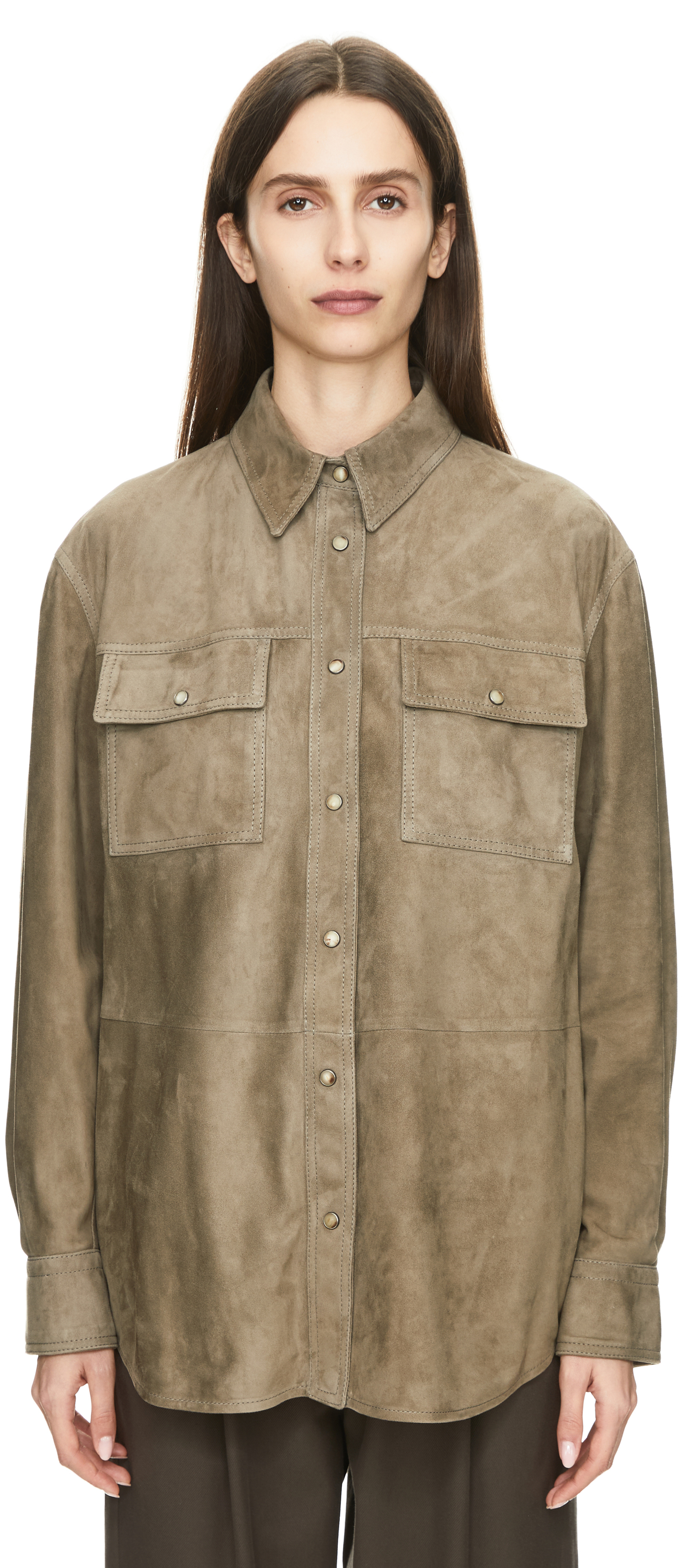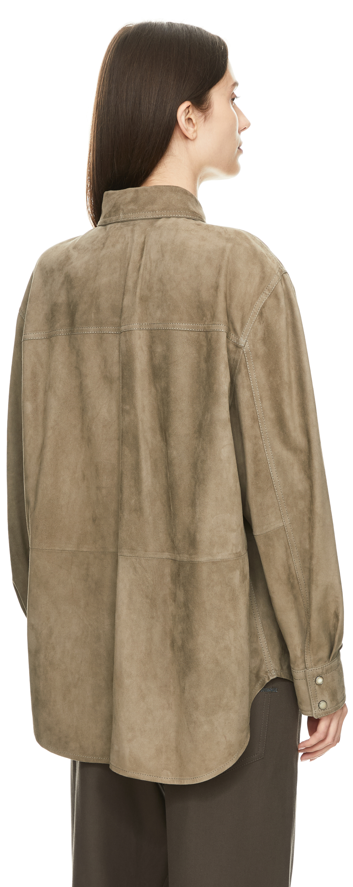 Dieses Hemd in Khaki von Brunello Cucinelli wurde aus geschmeidigem Lammveloursleder gefertigt und besticht durch die lässige Silhouette. Der klassische Kentkragen und die frontale Knopfleiste verleihen dem Modell eine zeitlose Eleganz. Zwei aufgesetzte Brusttaschen und feine Monili-Perlen entlang des Kragens auf der Rückseite setzen edle Akzente.