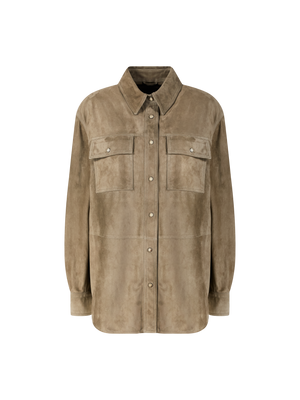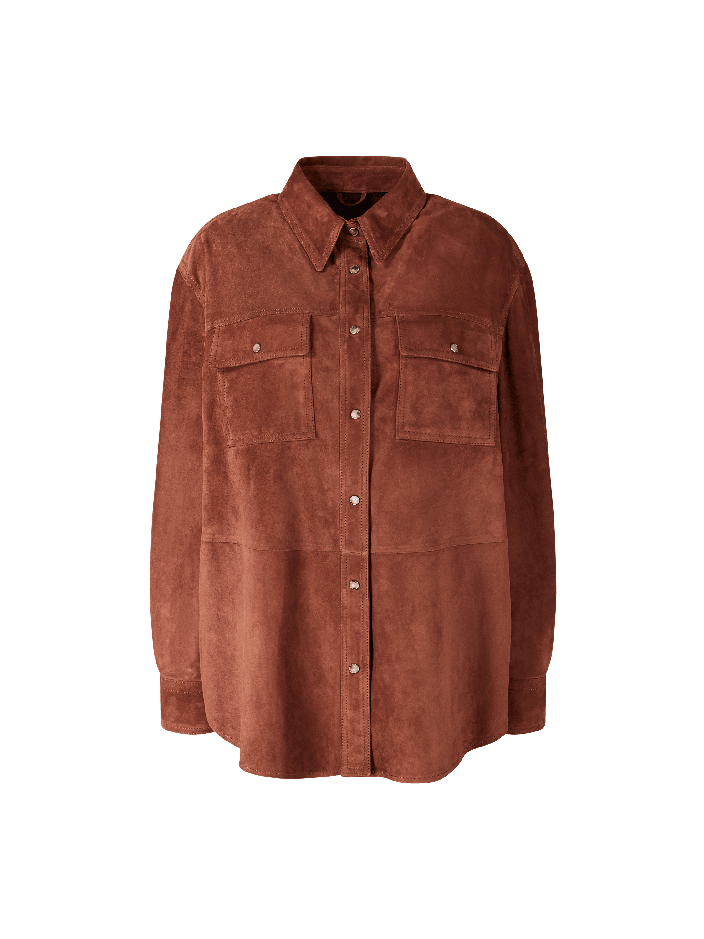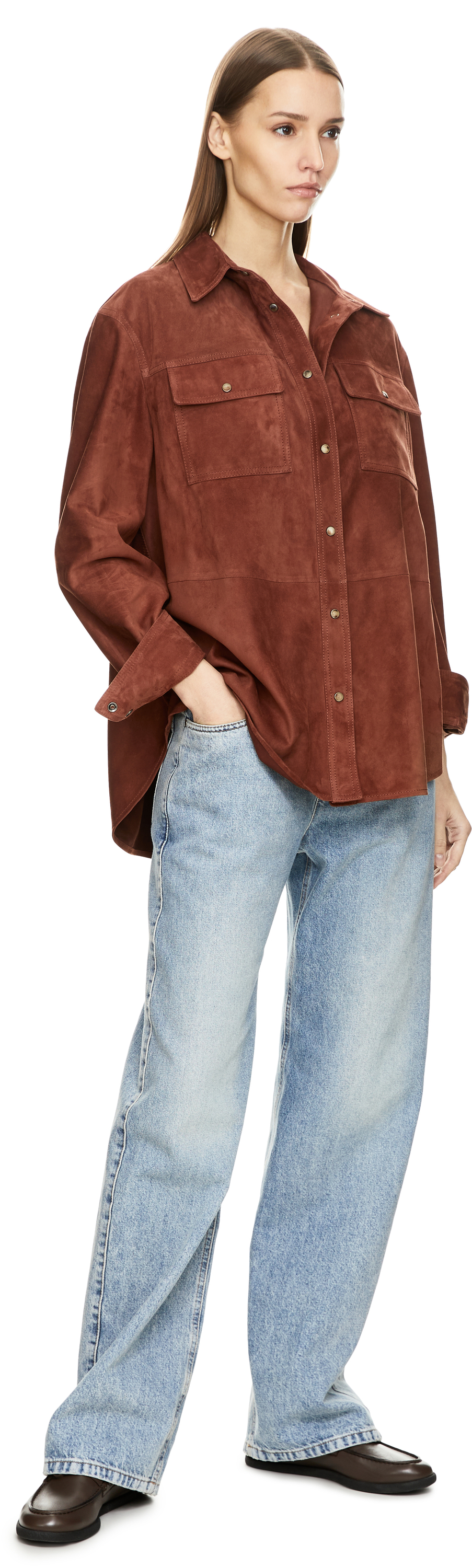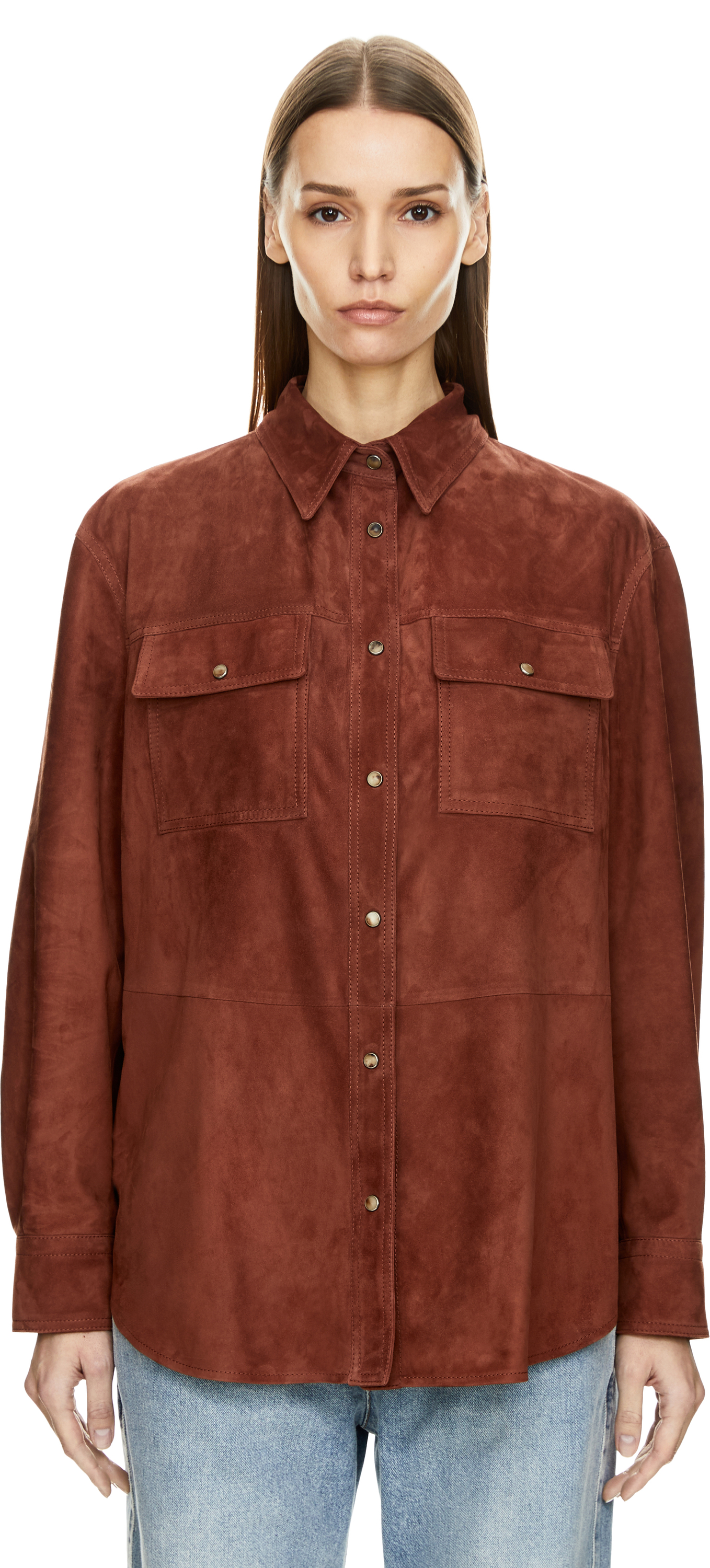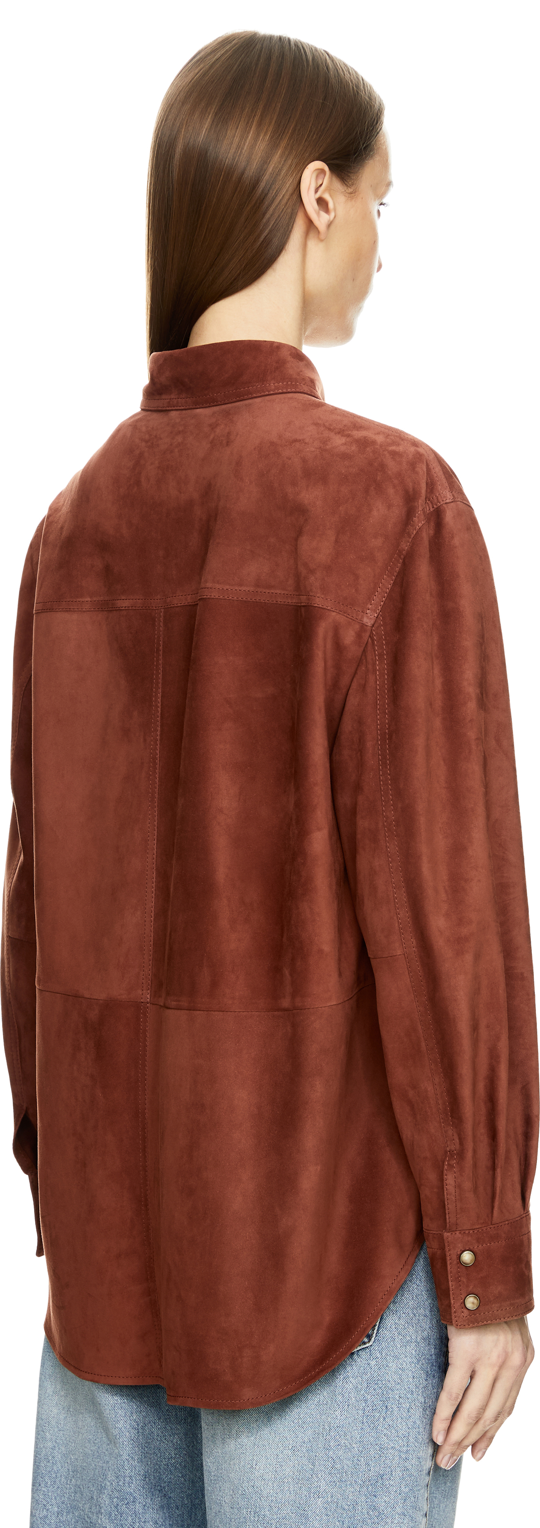 Dieses Hemd in Rot von Brunello Cucinelli wurde aus geschmeidigem Lammveloursleder gefertigt und besticht durch die lässige Silhouette. Der klassische Kentkragen und die frontale Knopfleiste verleihen dem Modell eine zeitlose Eleganz. Zwei aufgesetzte Brusttaschen und feine Monili-Perlen entlang des Kragens auf der Rückseite setzen edle Akzente.