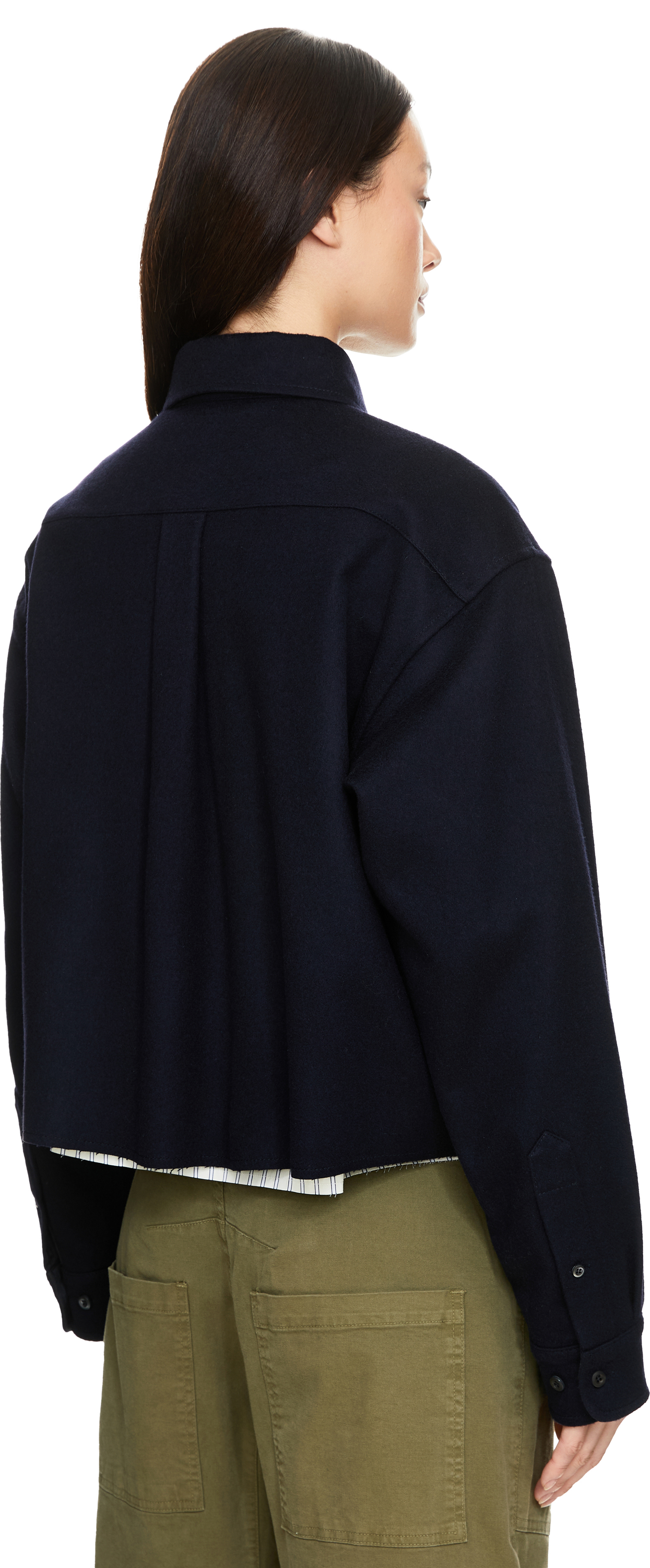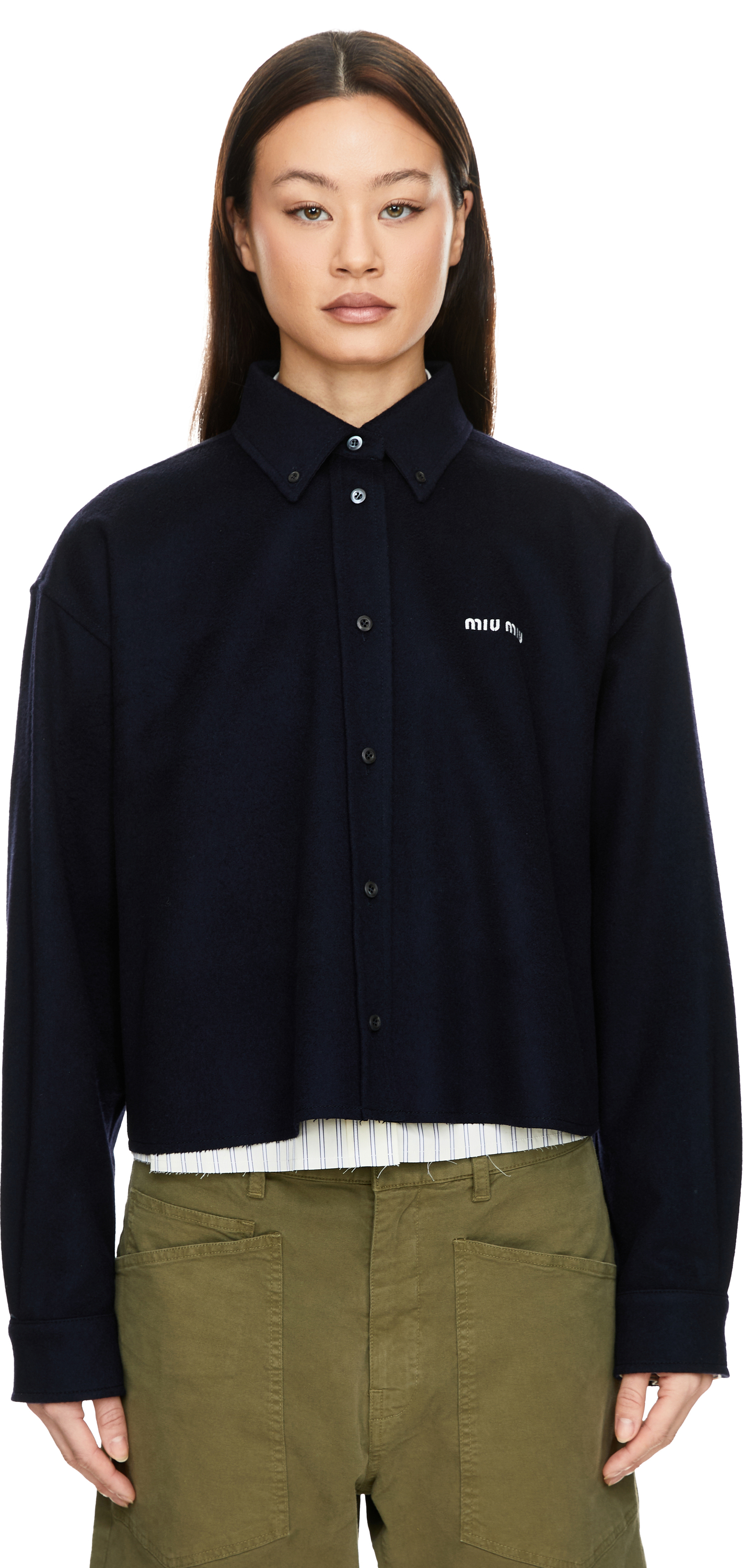 Dieses Hemd in Marineblau von miu miu wurde aus einer hochwertigen Woll-Cashmere-Mischung gefertigt und besticht durch die Velours-Optik. Der leicht verkürzte Schnitt, der Hemdkragen, die Knopfleiste auf der Vorderseite sowie das Sticklogo zeichnen dieses Design aus.
