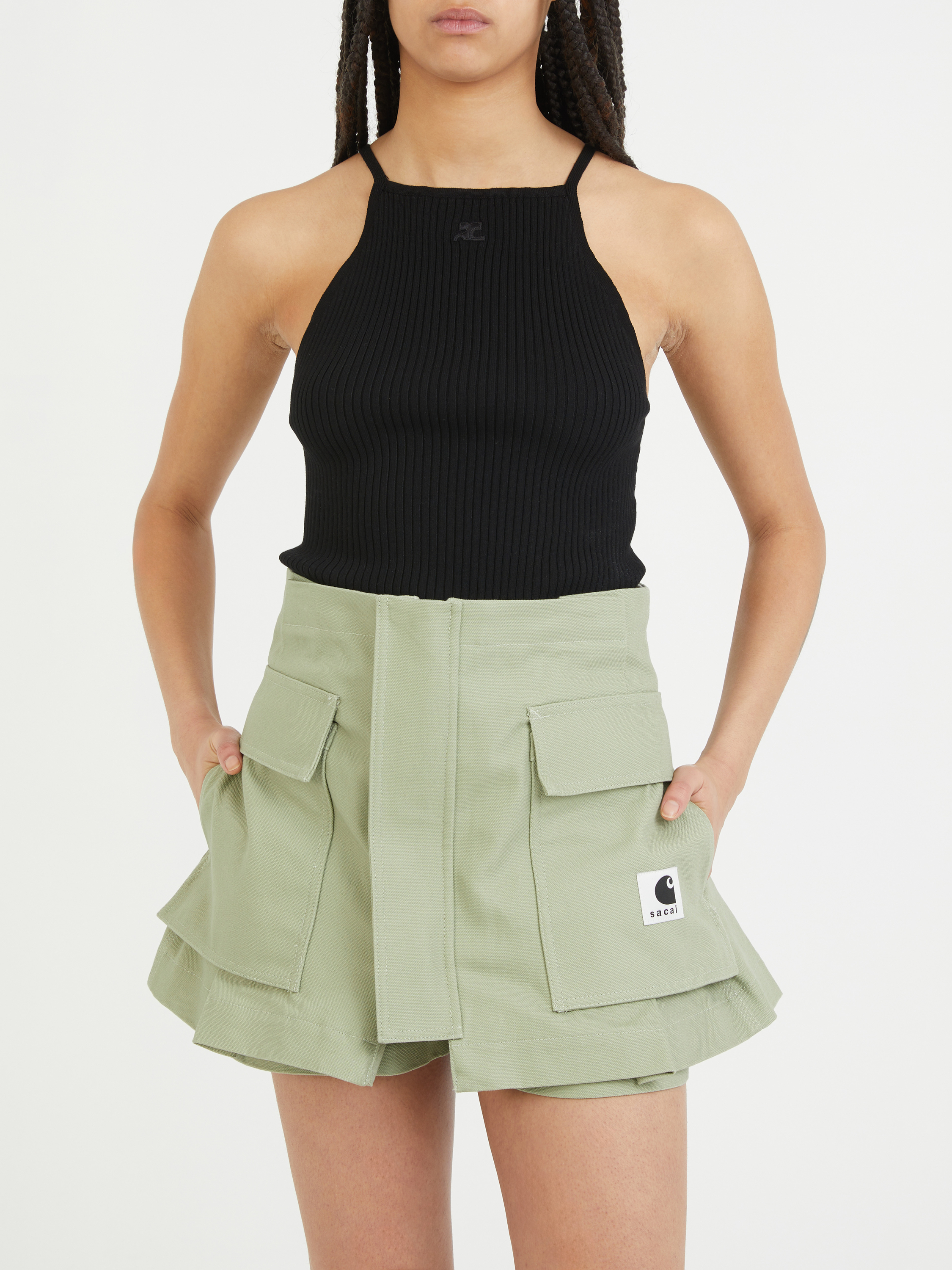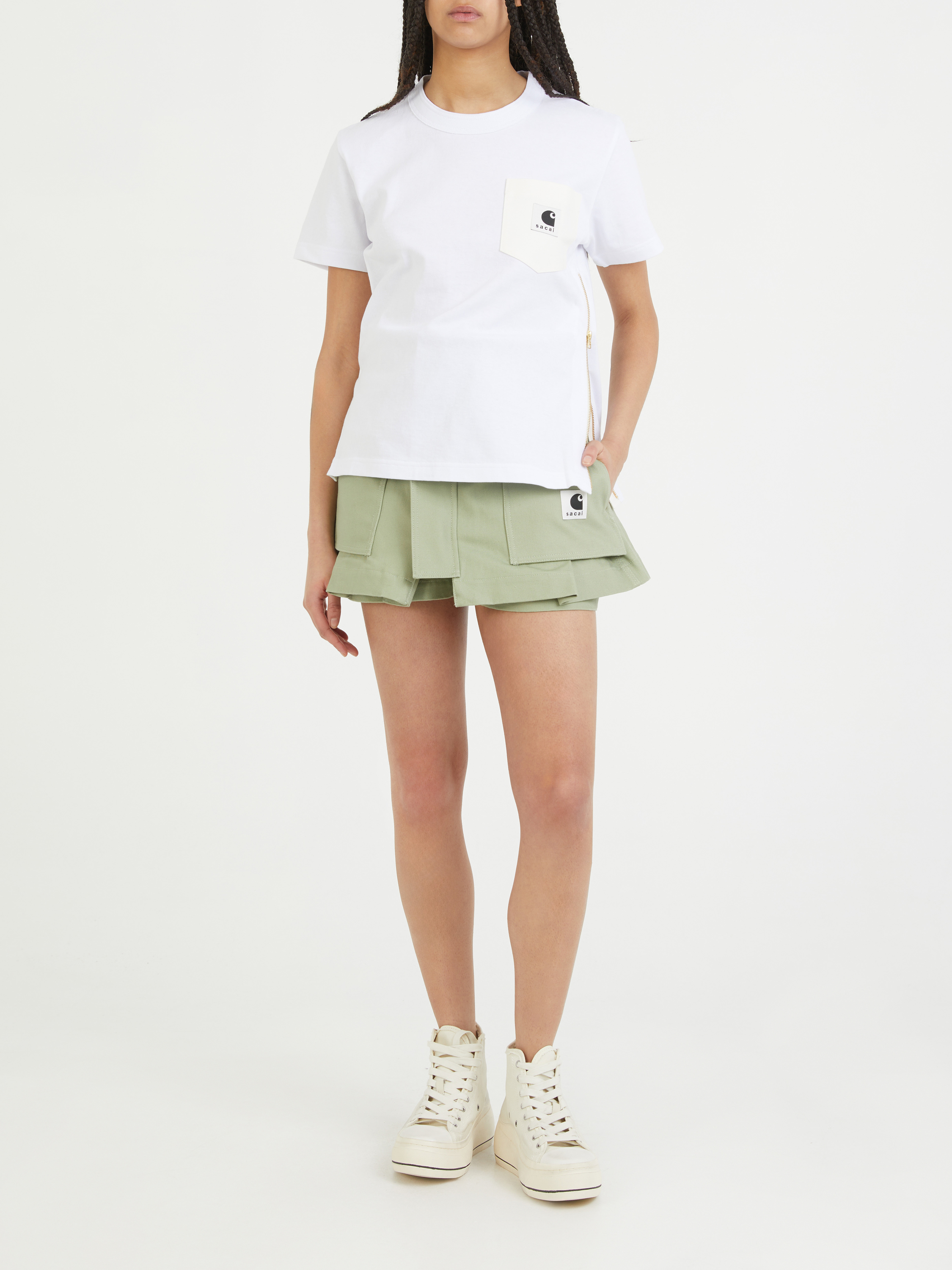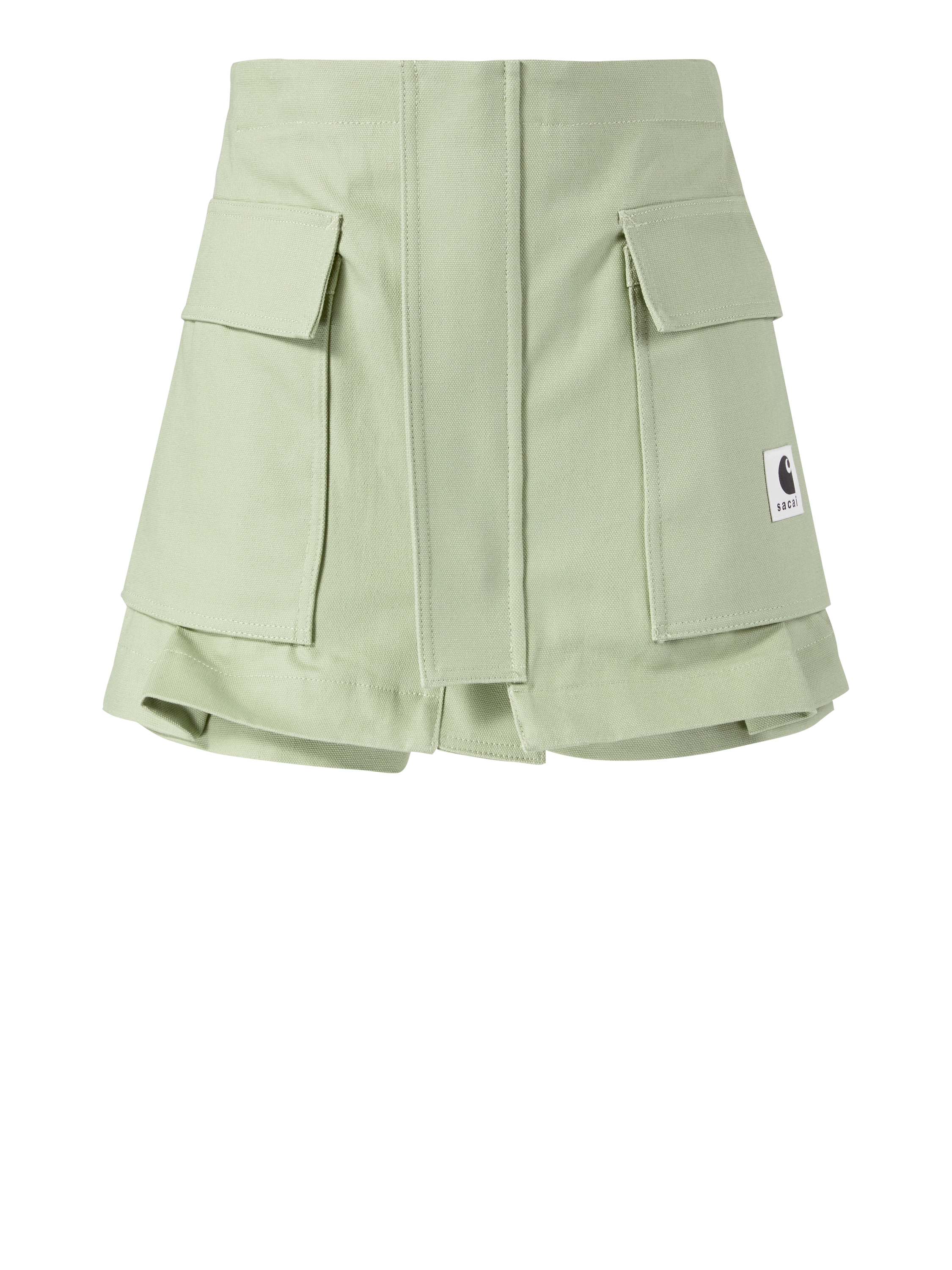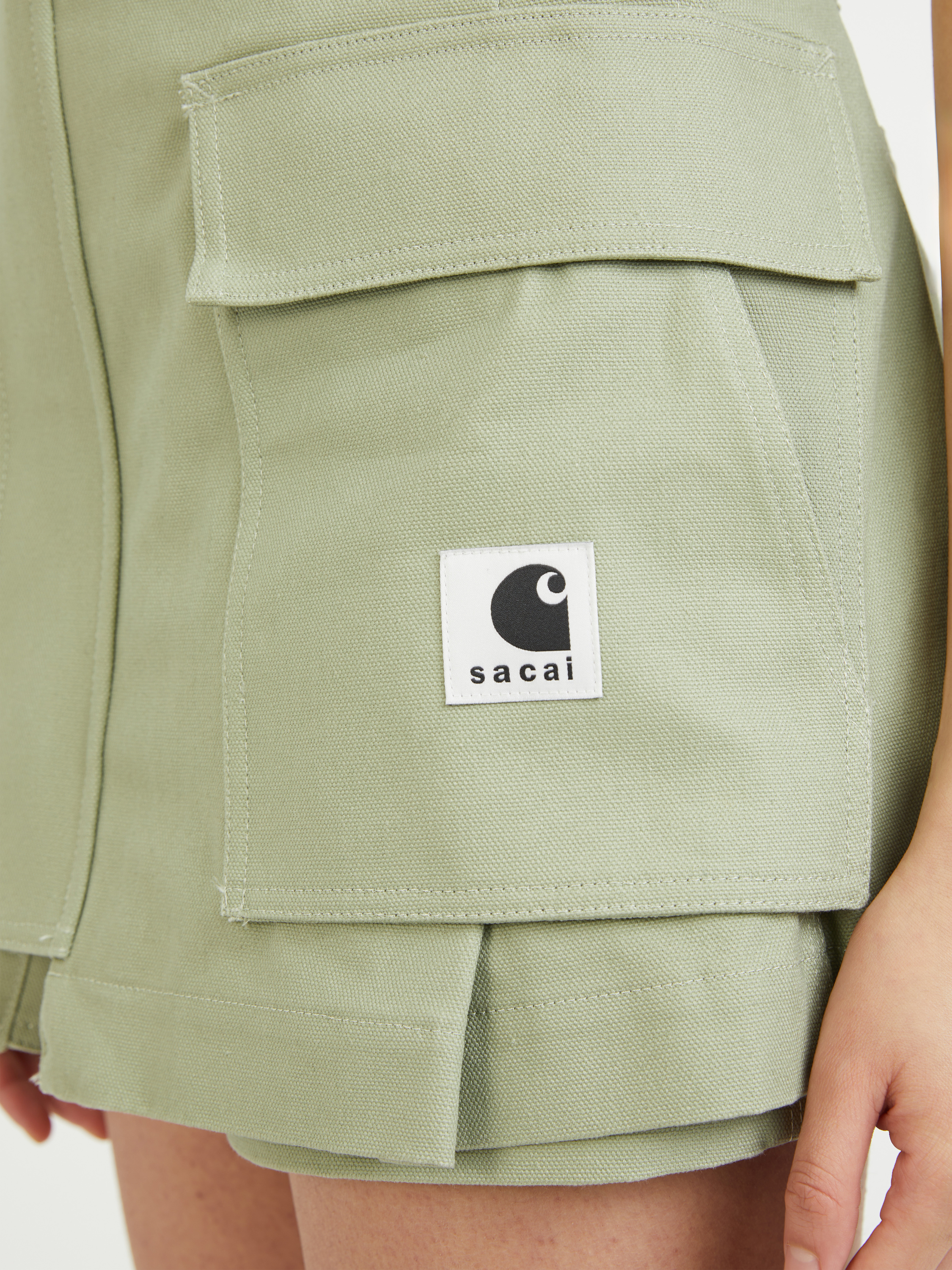 Dieser Hosenrock 'Sacai x Carhartt' in Khaki von Sacai in Kooperation mit Carhartt wurde aus hochwertiger Baumwolle gefertigt und besticht durch einen modernen Utility-Look. Der beidseitige Reißverschluss erlaubt den Rock-Look, sowie einen Shorts-Look. Die Blasebalgtaschen, die aufgesetzten Taschen auf der Rückseite und die Gürtelschlaufen vollenden das Design.